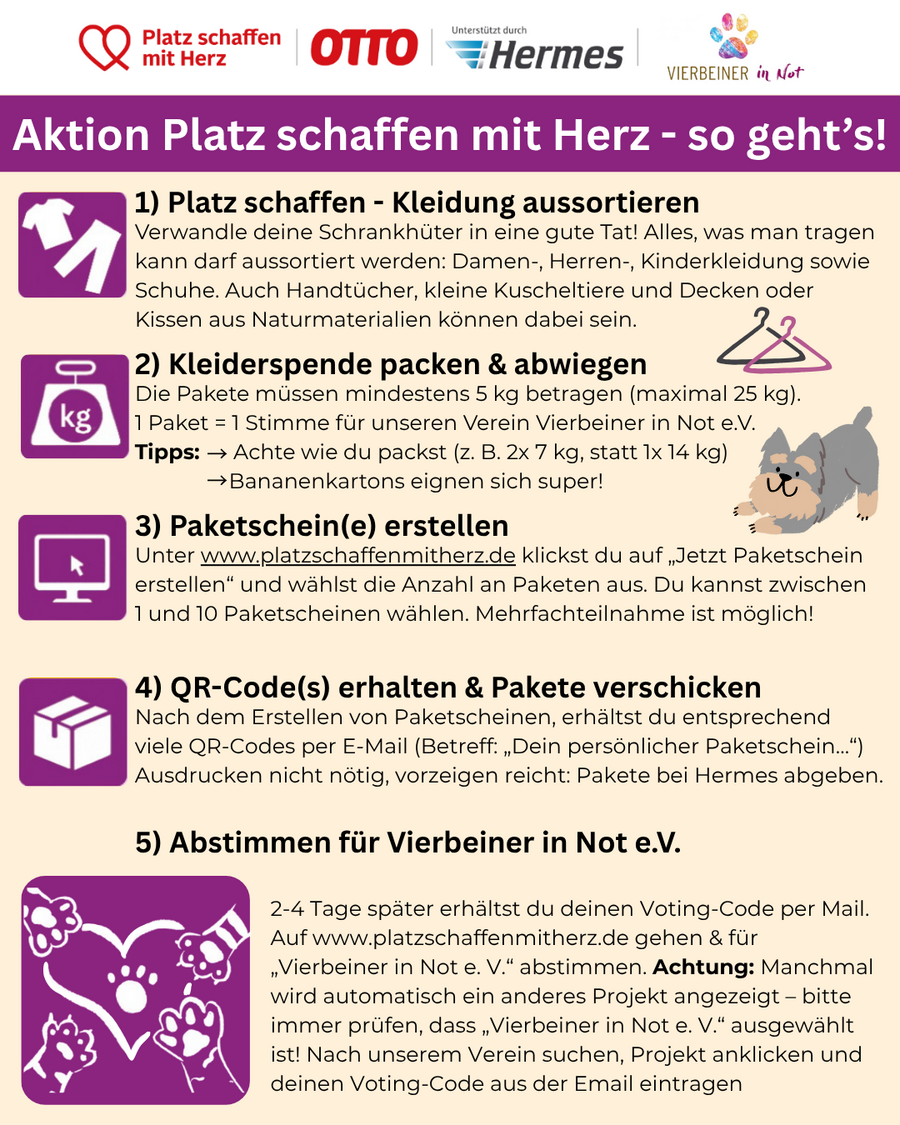 Kleiderschrank ausmisten und dabei Gutes tun? Genau das geht mit der tollen Aktion „Platz schaffen mit Herz“! Auch wir von Vierbeiner in Not e.V. sind mit dabei und freuen uns über jede Kleiderspende, die uns im Ranking weiter nach vorne bringt – und damit direkt unseren Schützlingen hilft. 🐾