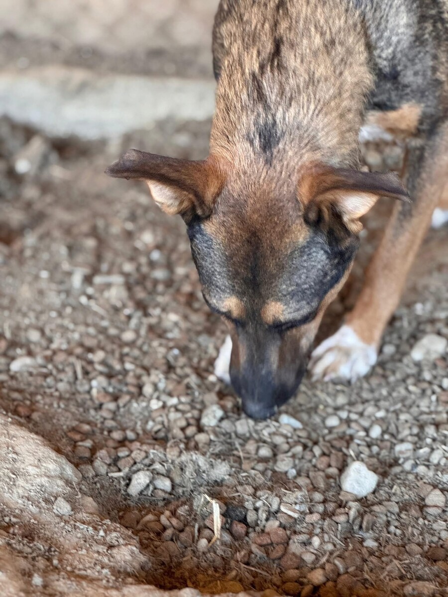 In Deutschland zeigt sich Alibaba noch scheu, dabei aber durchweg freundlich. Er ist verträglich mit Artgenossen, neugierig auf seine neue Umgebung und beginnt, sich langsam auf das Leben außerhalb des Shelters einzulassen. Besonders schön ist zu beobachten, wie er seine Zurückhaltung vergisst, wenn man sich ruhig zu ihm auf den Boden setzt – Nähe auf Augenhöhe hilft ihm, Vertrauen zu fassen.