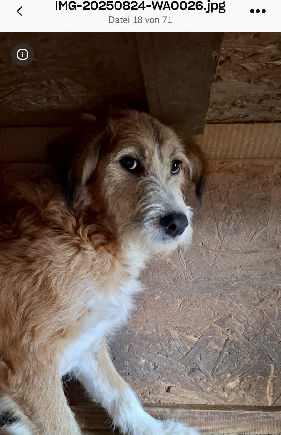 Update Besuch Februar 2026: Rufus hat den Besuch schwanzwedelnd begrüßt und sich über die schöne Leckereien sehr gefreut. Ein toller Hund - ohne jeglichen Fressneid, freundlich und interessiert am Menschen. Wir haben uns sehr über seine riesen Entwicklungsschritte gefreut. Das zeigt uns, dass die Entscheidung, ihn in die private Pension zu bringen, absolut richtig war. Jetzt muss er nur noch seine Familie finden.