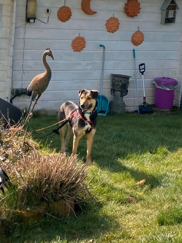 Sie hat eine Schulterhöhe von ca. 50 cm und ist 2020 geboren. Mit Hunden ist sie grundsätzlich verträglich, bei sehr kleinen Artgenossen (wie Chihuahuas) zeigt sie jedoch noch Unsicherheit, daher sollten keine sehr kleinen Hunde oder andere Kleintiere in ihrem neuen Zuhause leben.