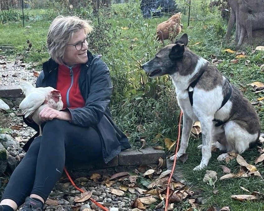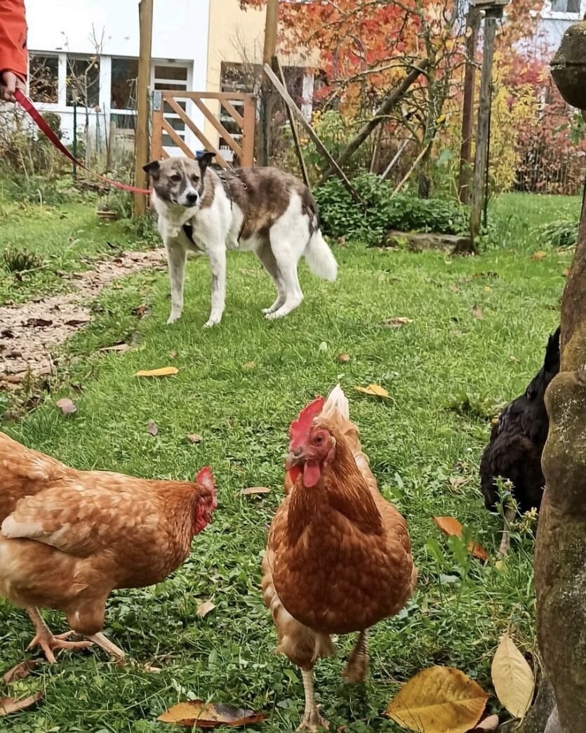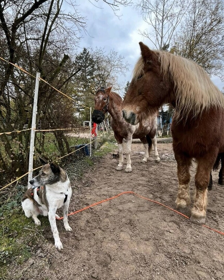 Mit anderen Tieren ist Theo sehr freundlich. Hühner ignoriert er zuverlässig, auch Pferden und anderen Hunden begegnet er gelassen und positiv. Spaziergänge genießt er sehr; ebenso das Bürsten und Streicheln, bei dem er ruhig stehen bleibt und die Nähe sichtlich genießt.