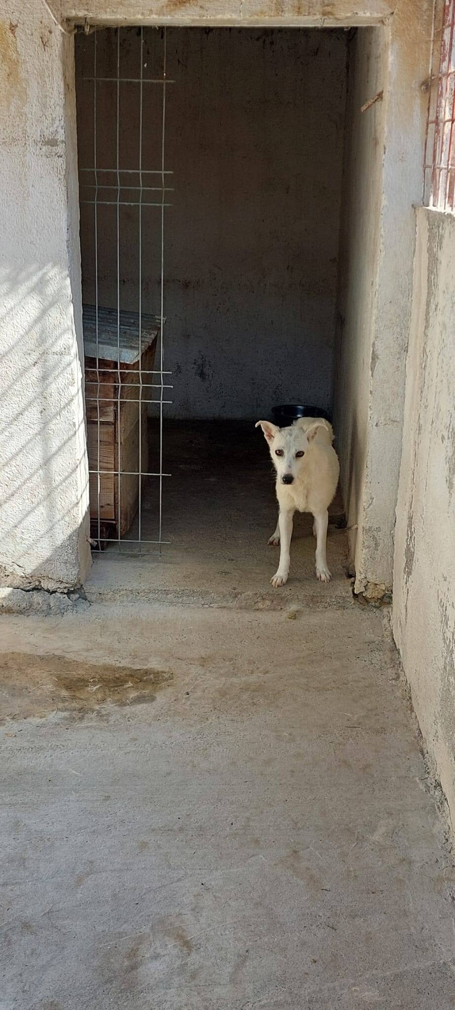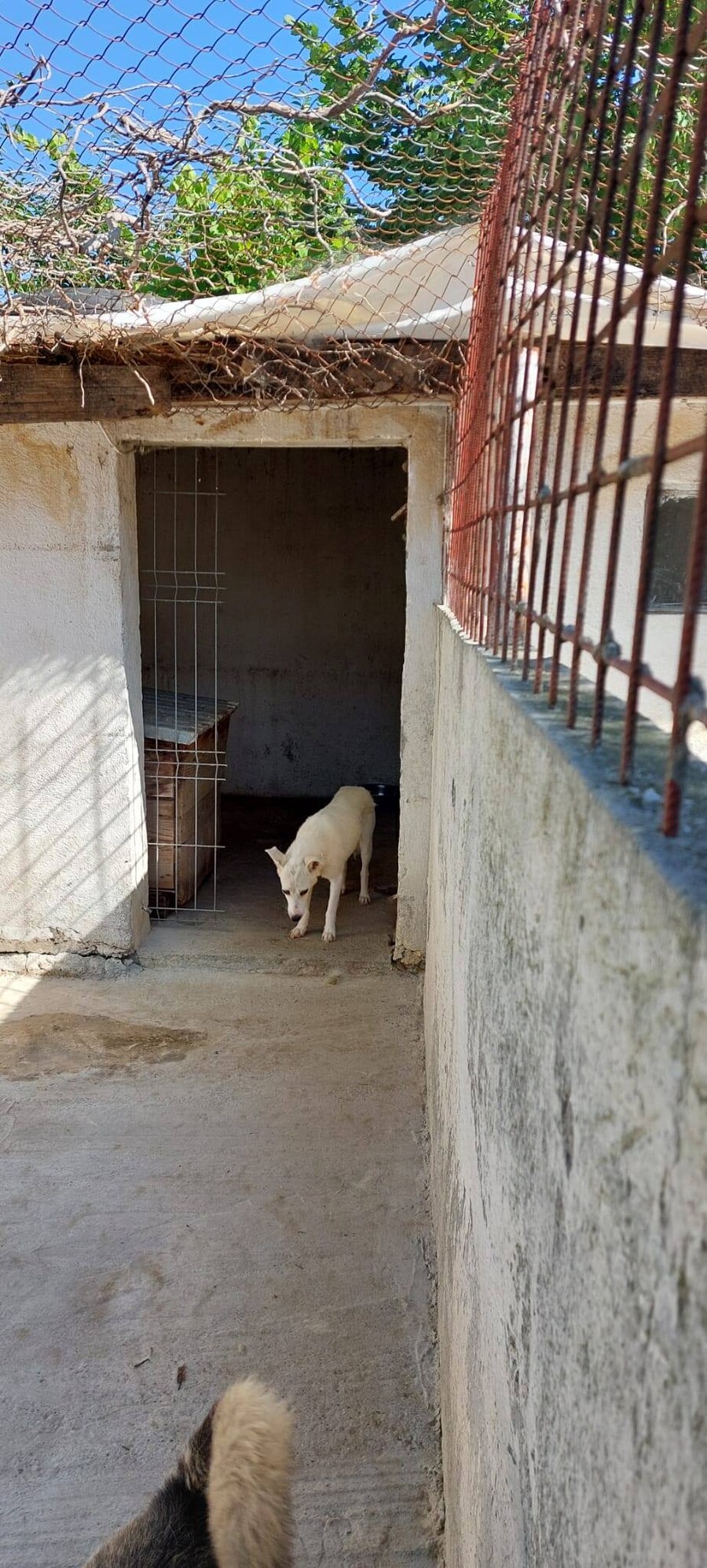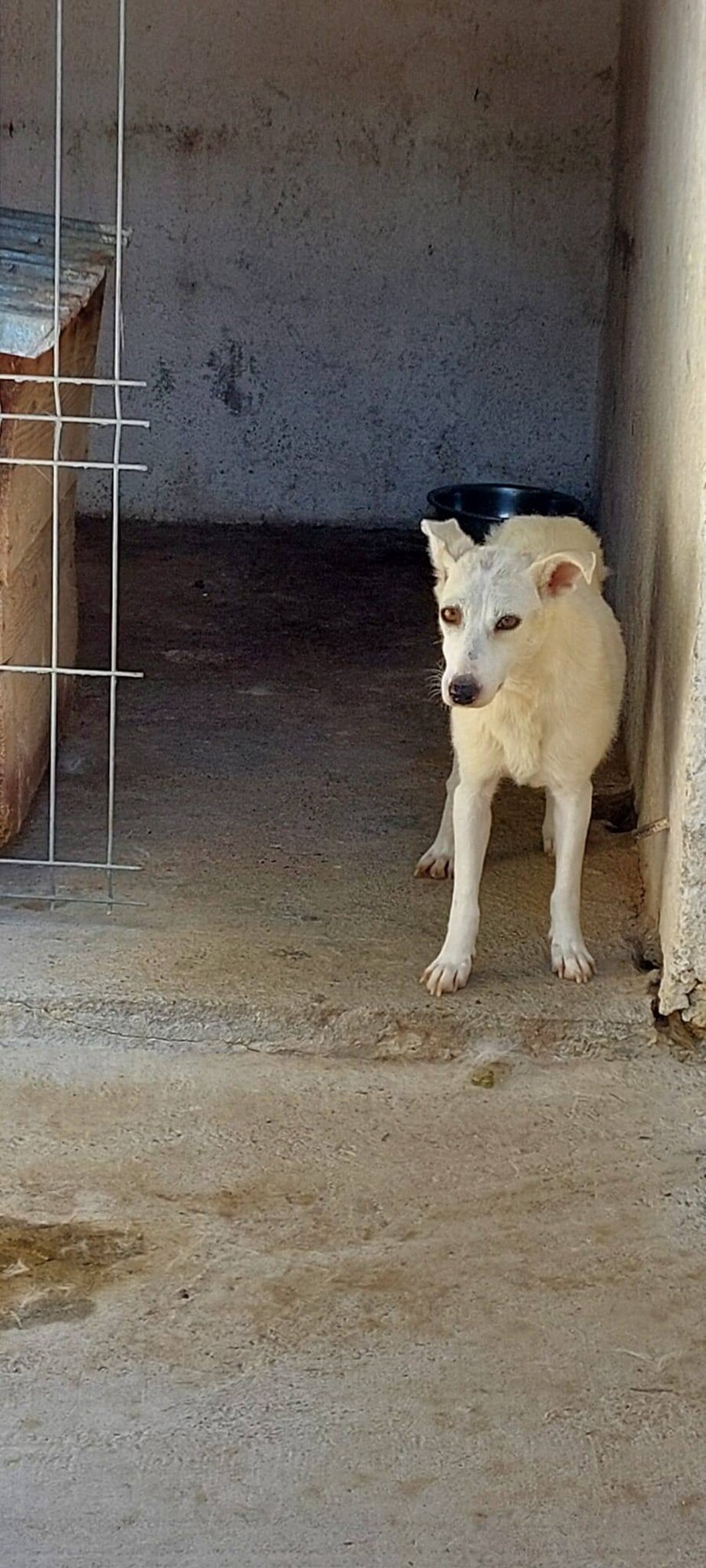 Die schüchterne weiße Junghündin Pilou (geboren 2024) wurde im April 2025 von uns aus der Tötung Cornetu gerettet.