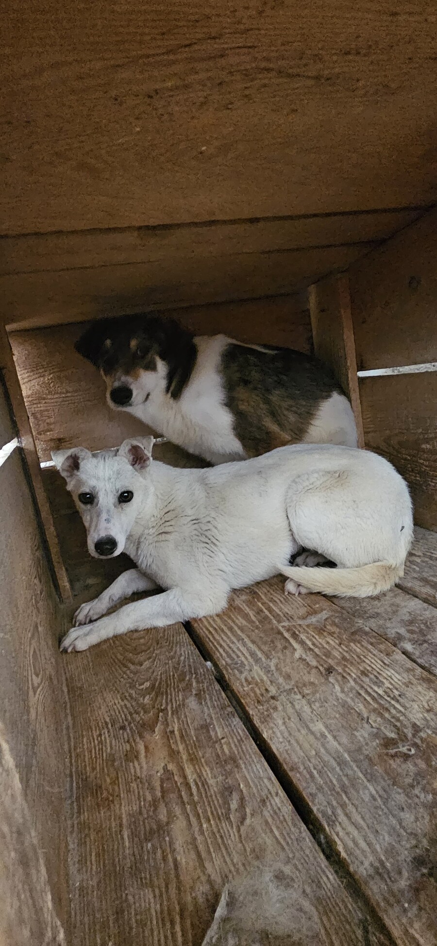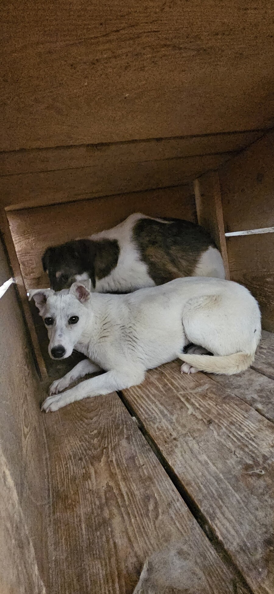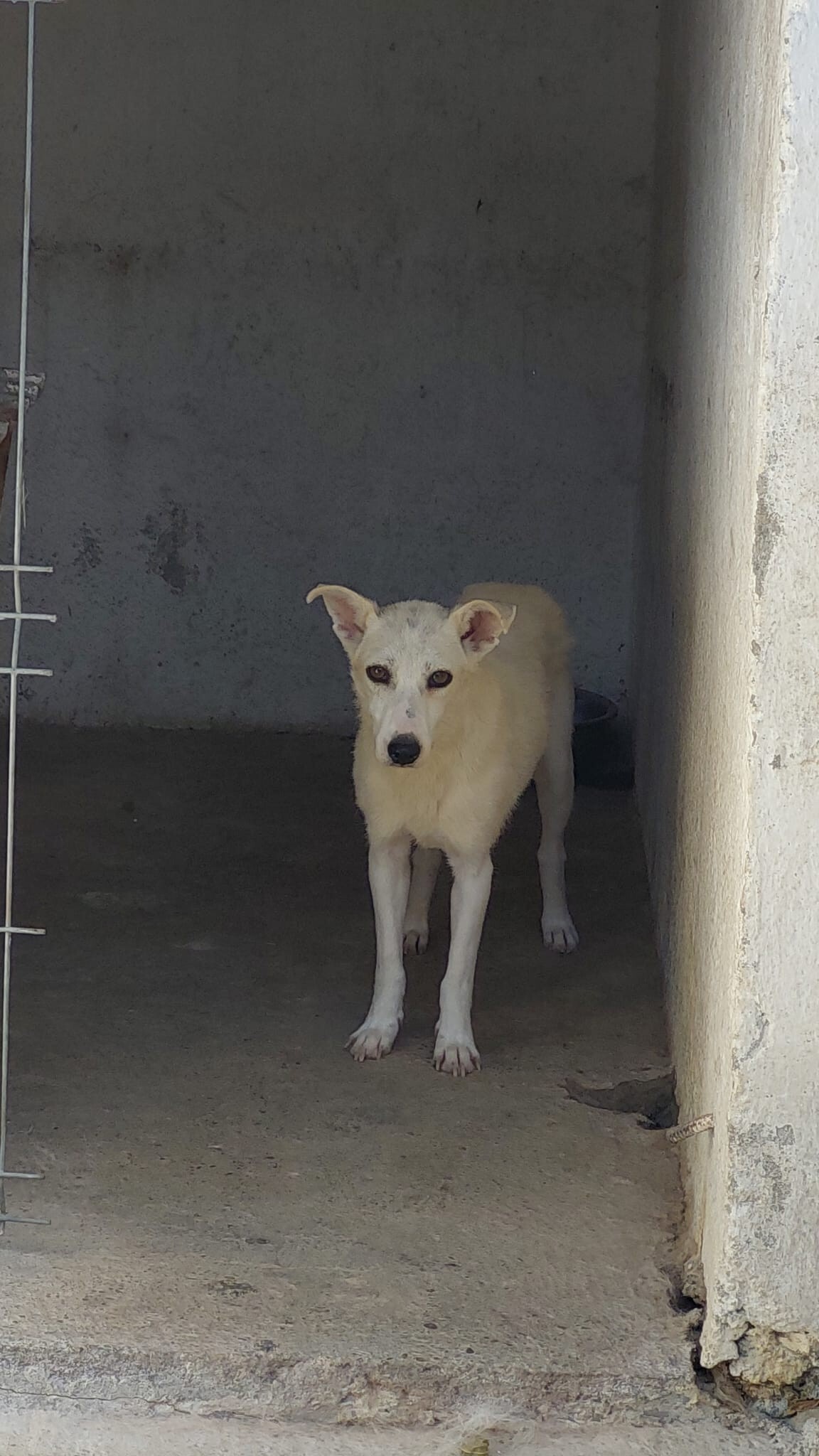 Die schüchterne weiße Junghündin Pilou (geboren 2024) wurde im April 2025 von uns aus der Tötung Cornetu gerettet.