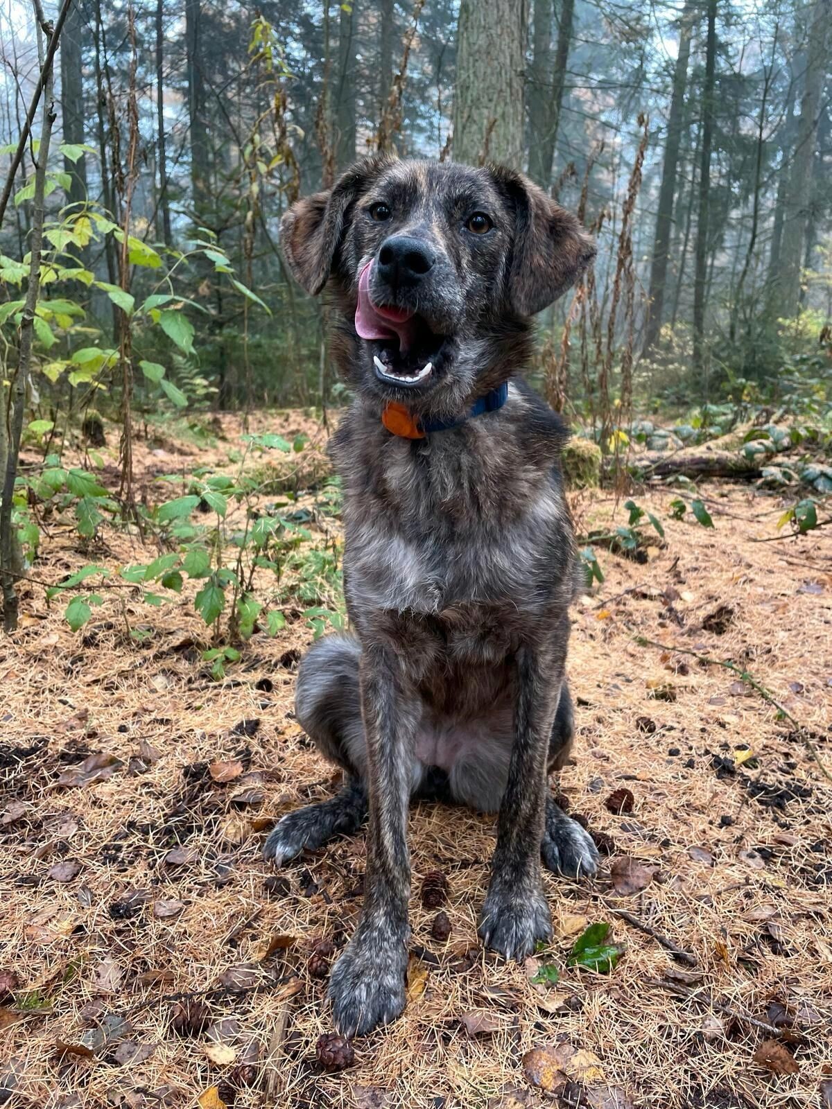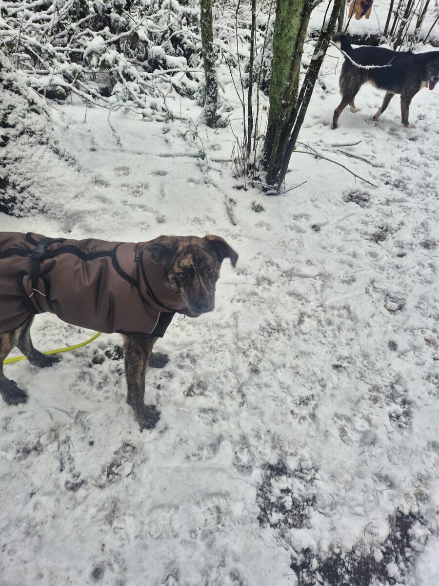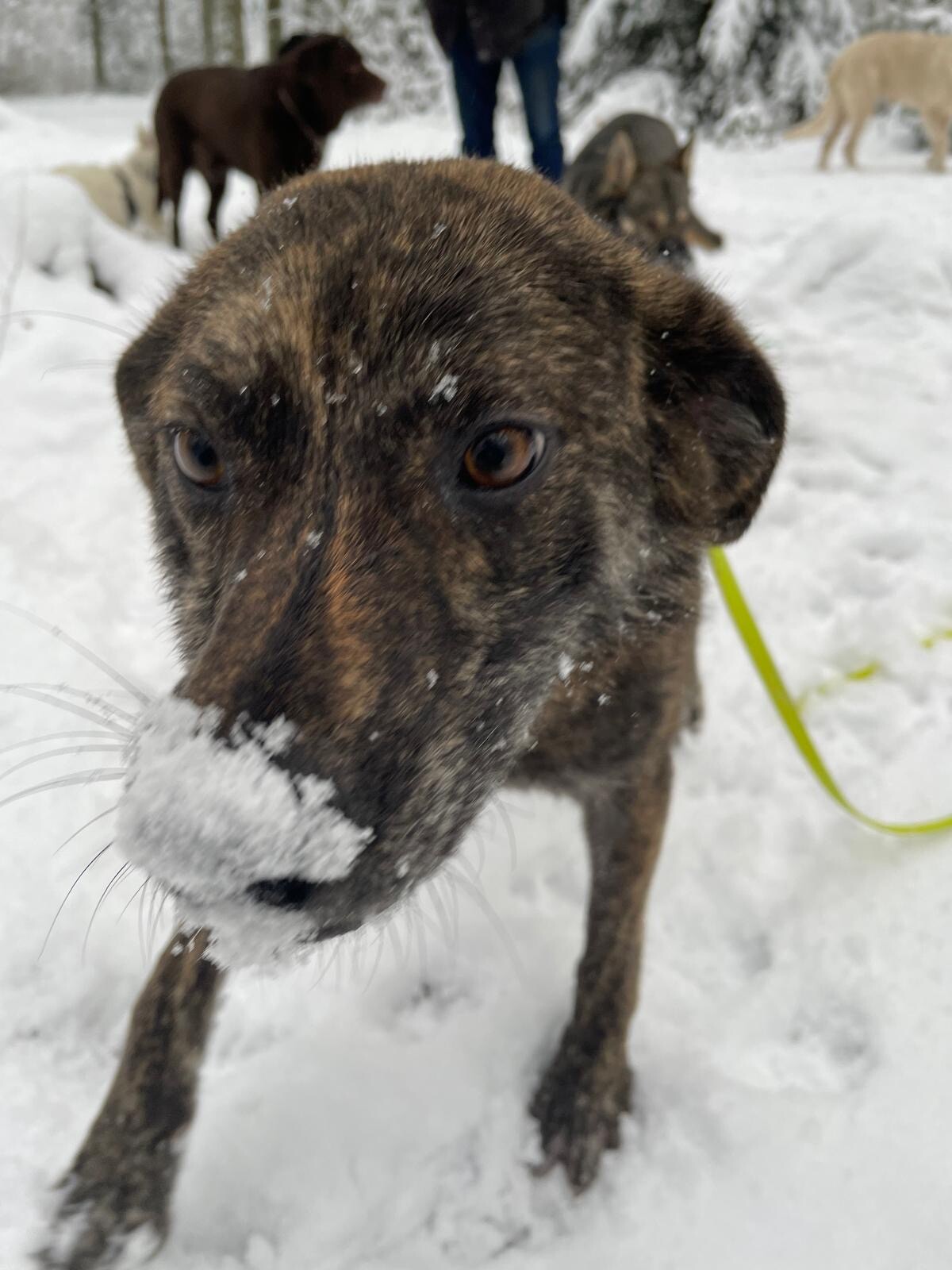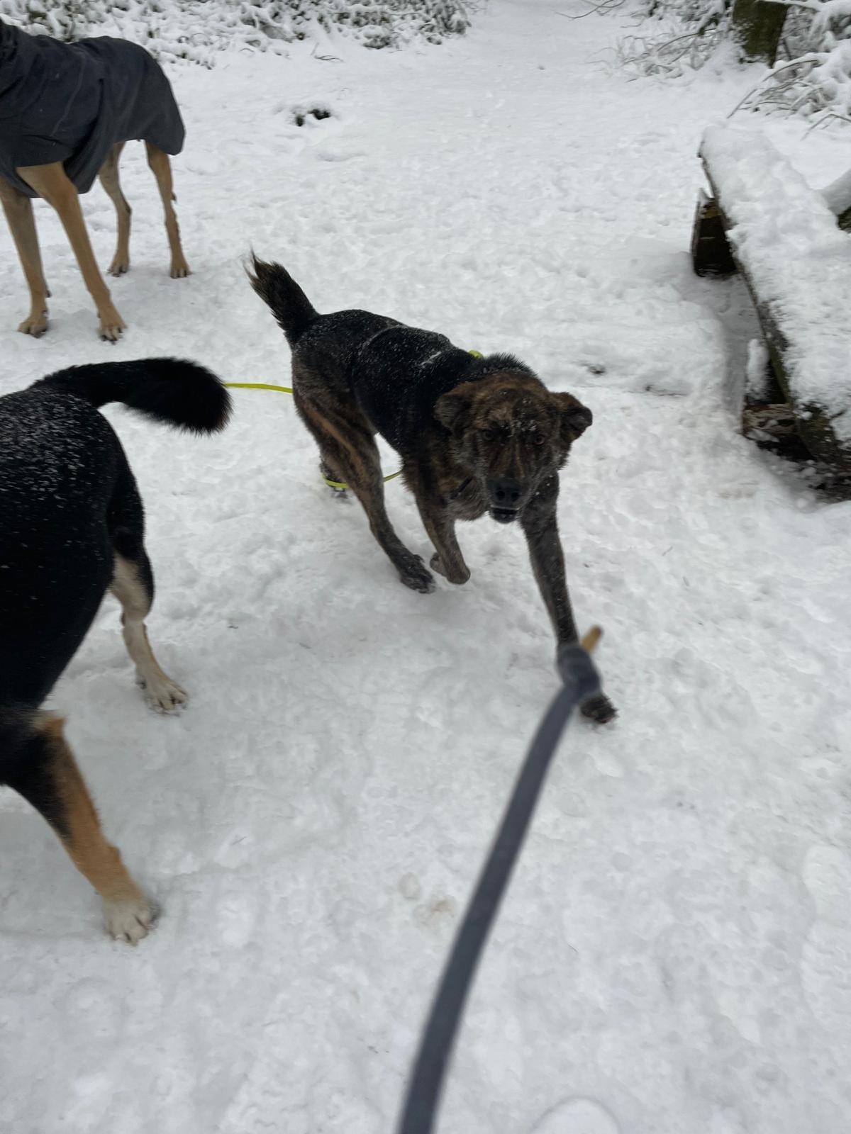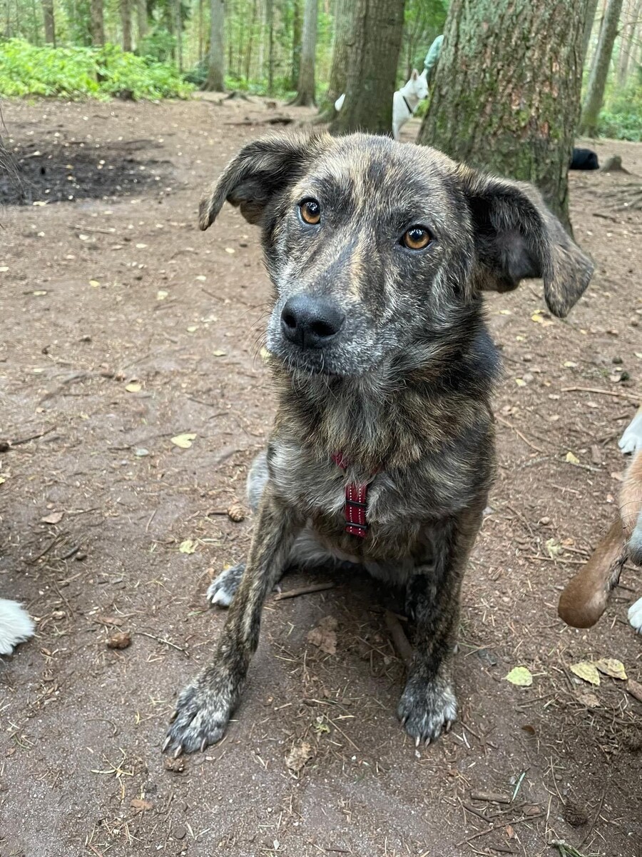 Im Wald ist sie mit einem Rudel von 10-15 Hunden zusammen. In diesem sind wirklich alle Größen und Alter vertreten. Auch hier zeigt sie sich interessiert, sozial und verspielt. Sie ist keine dominate Hündin, sondern orientiert sich an souveränen Hunden.