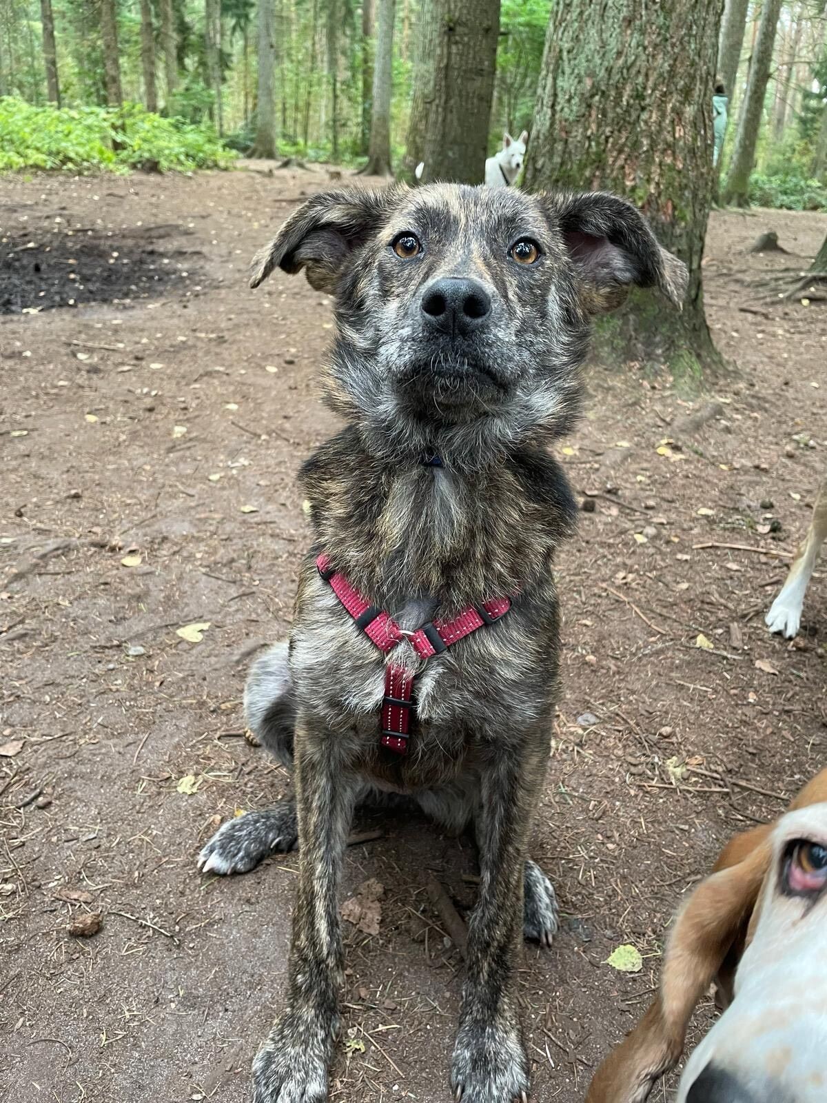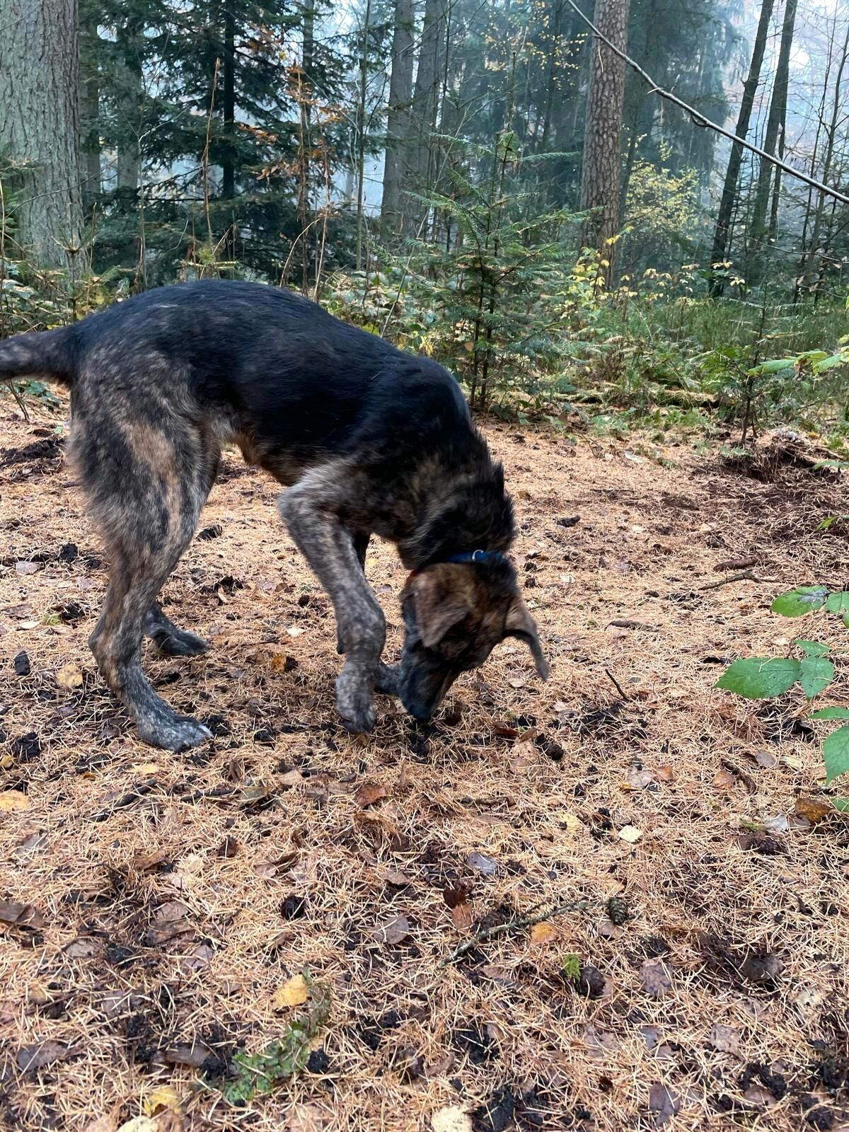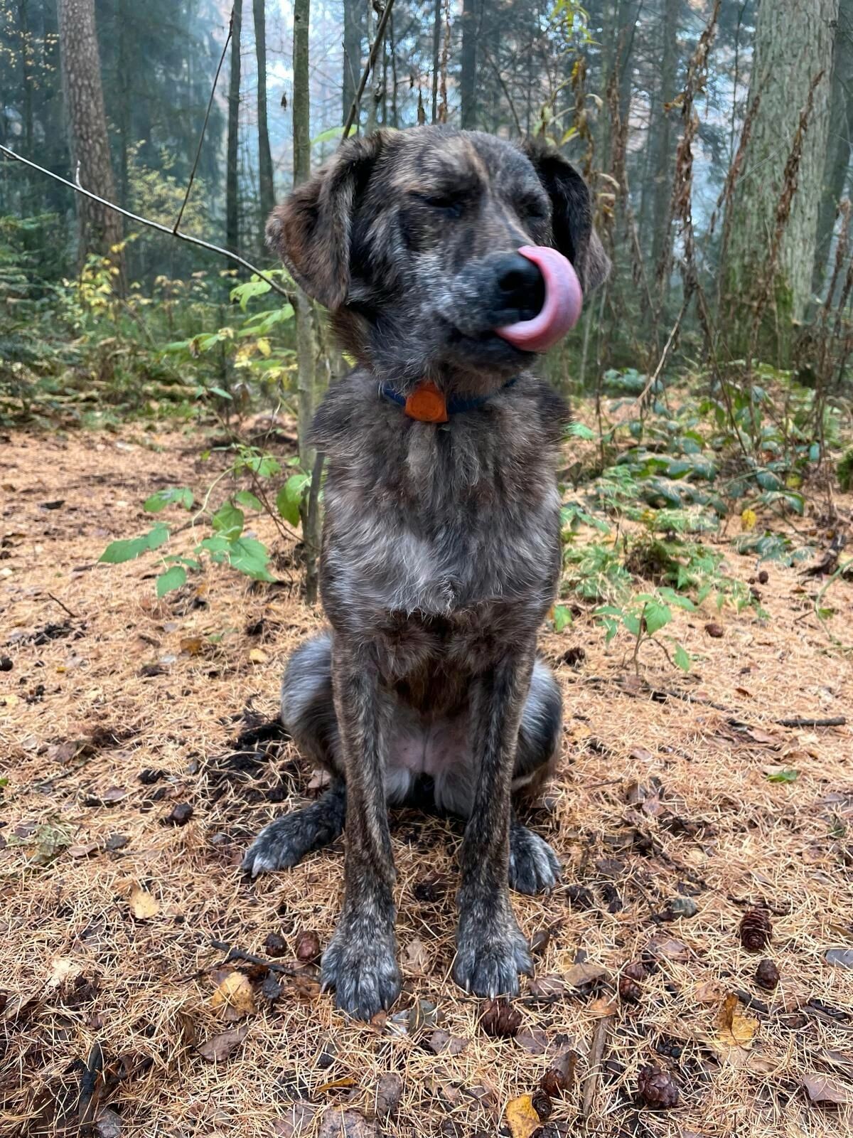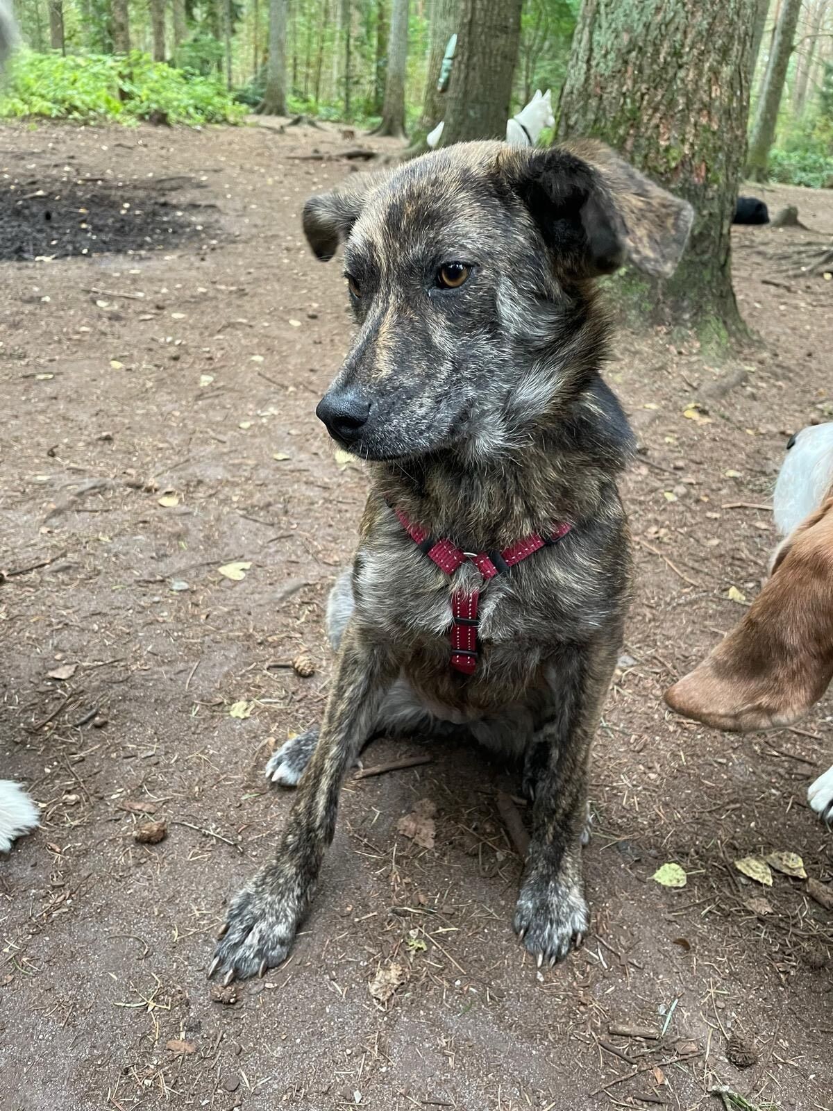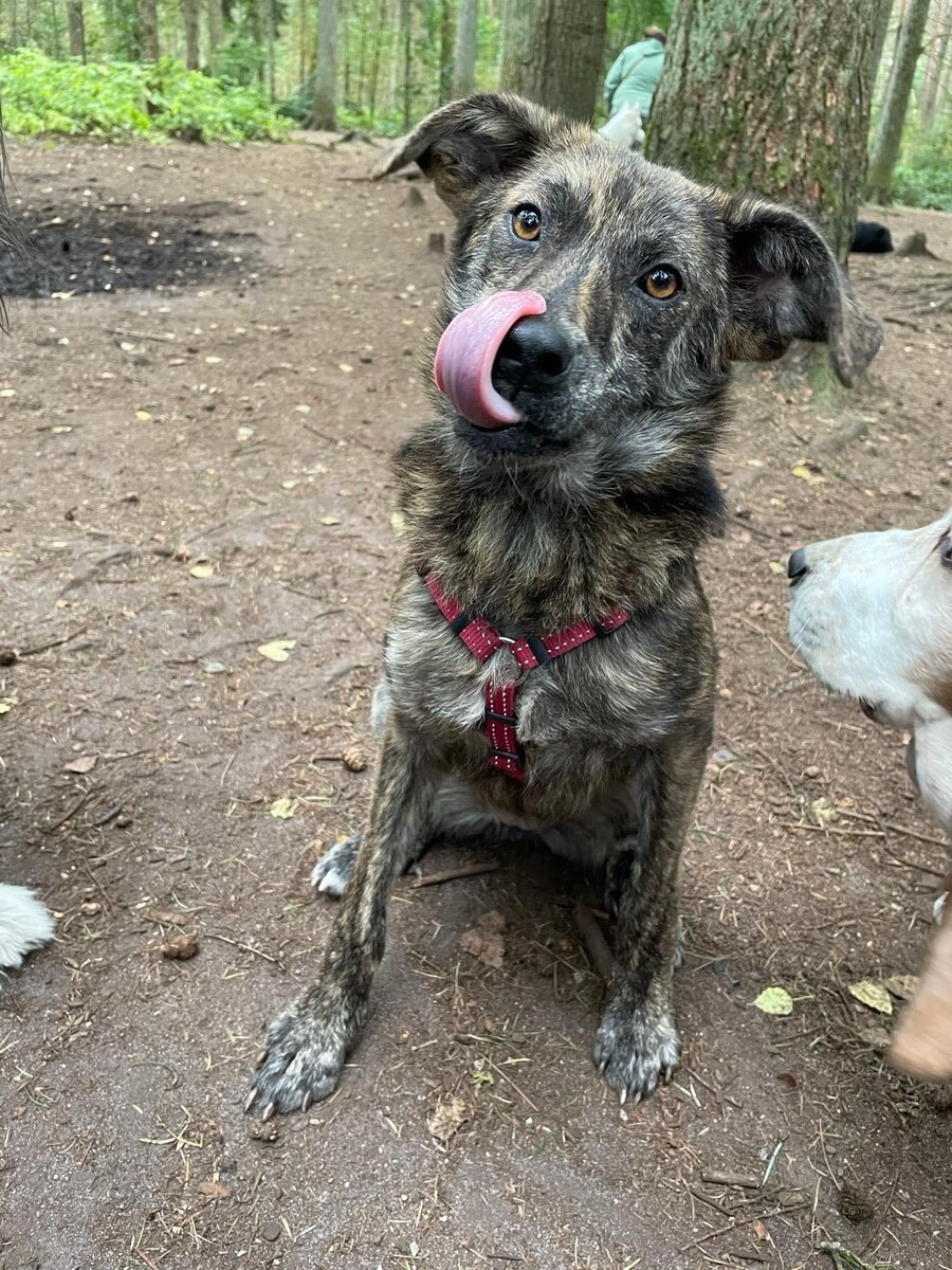 Im Wald ist sie mit einem Rudel von 10-15 Hunden zusammen. In diesem sind wirklich alle Größen und Alter vertreten. Auch hier zeigt sie sich interessiert, sozial und verspielt. Sie ist keine dominate Hündin, sondern orientiert sich an souveränen Hunden.