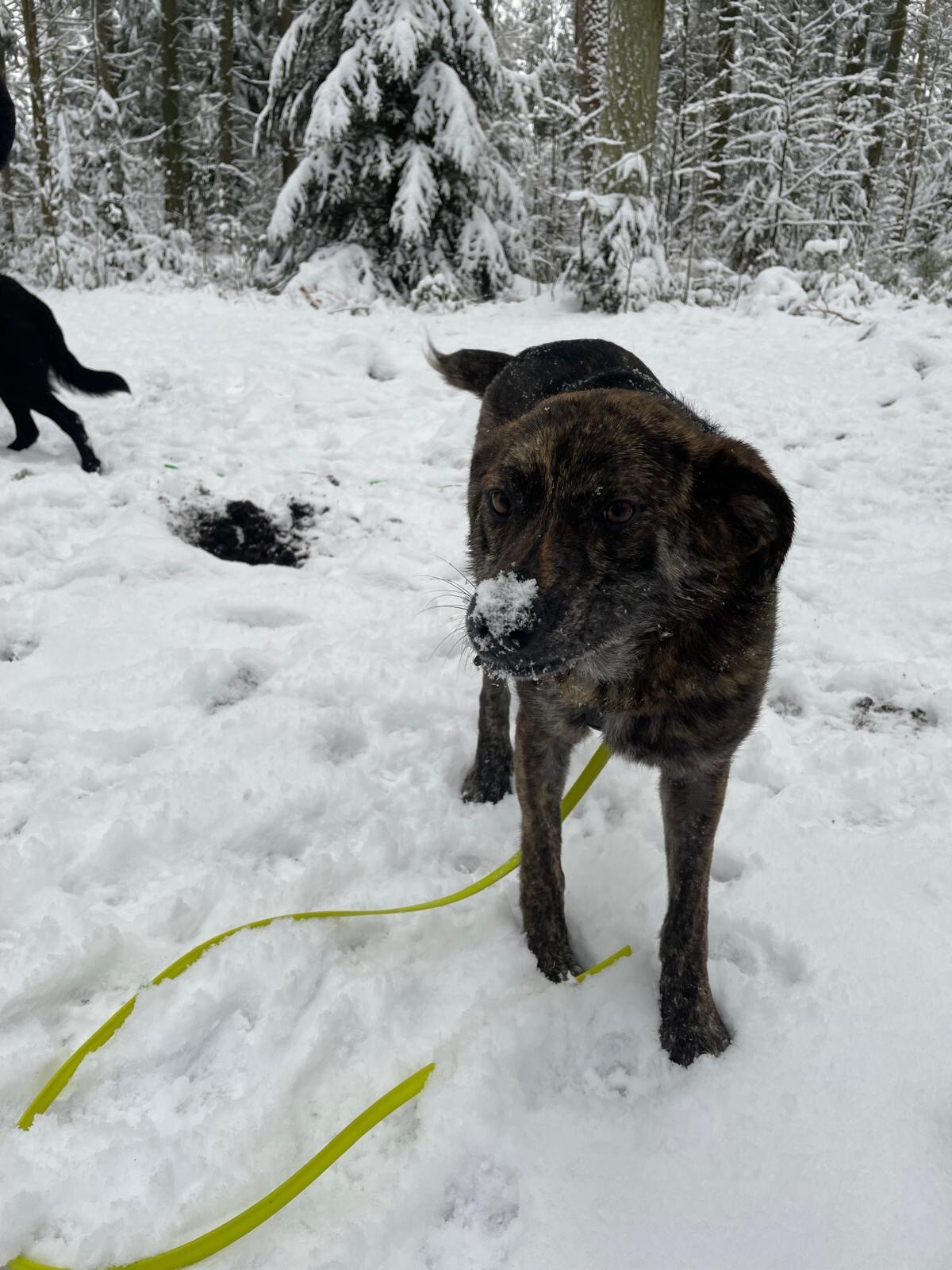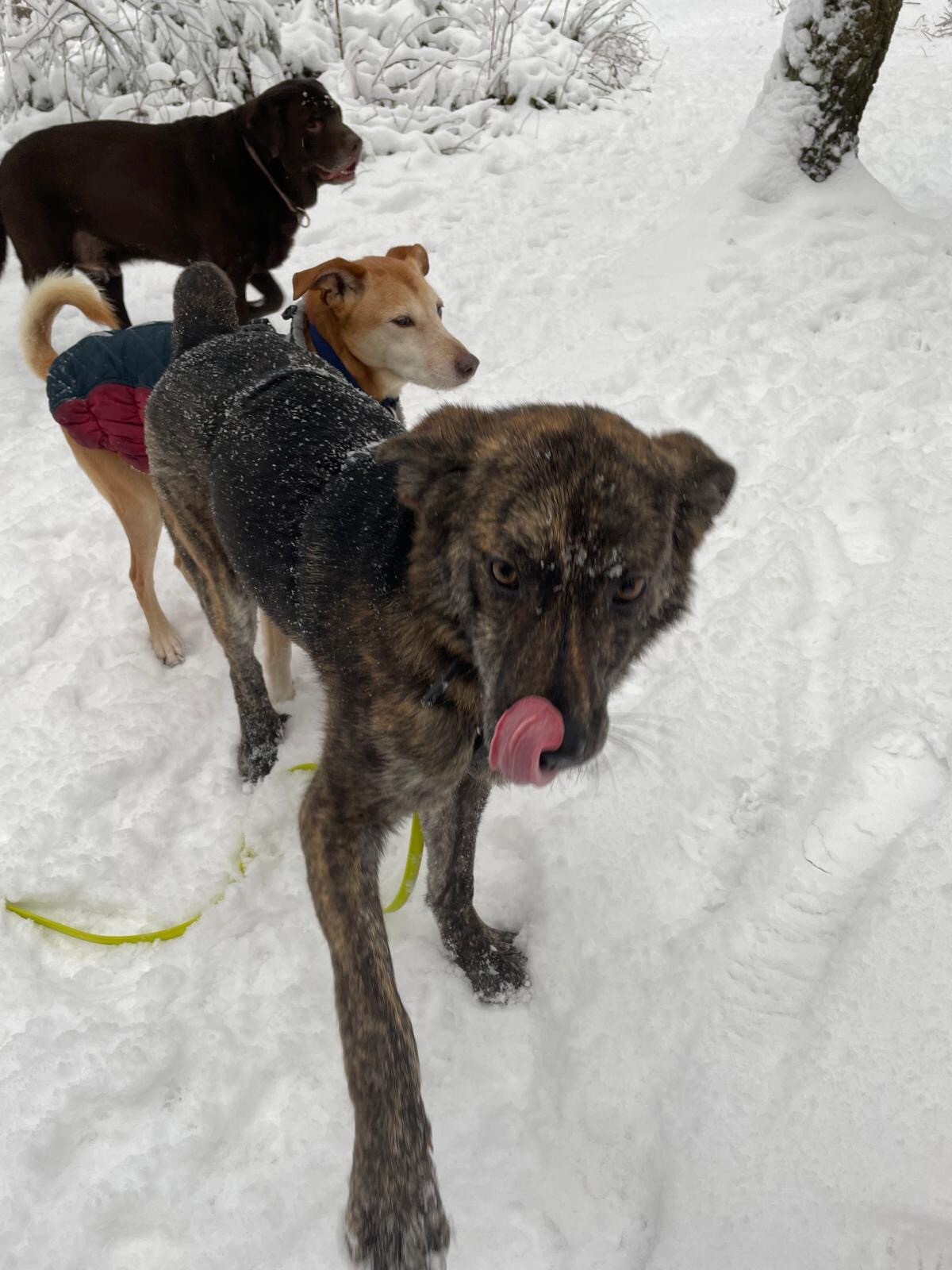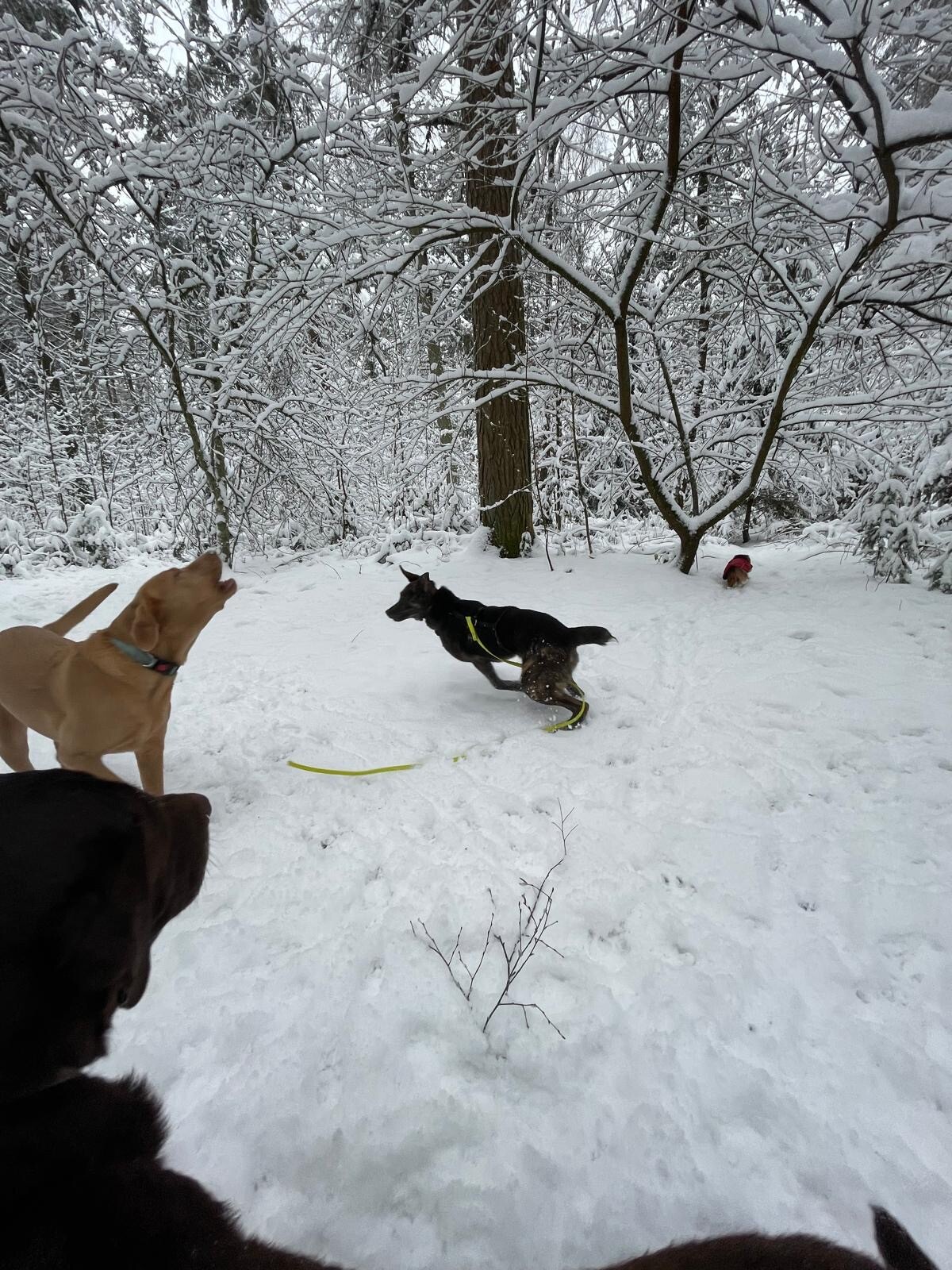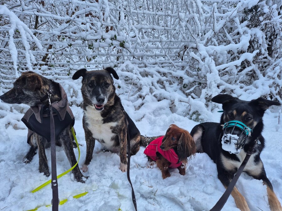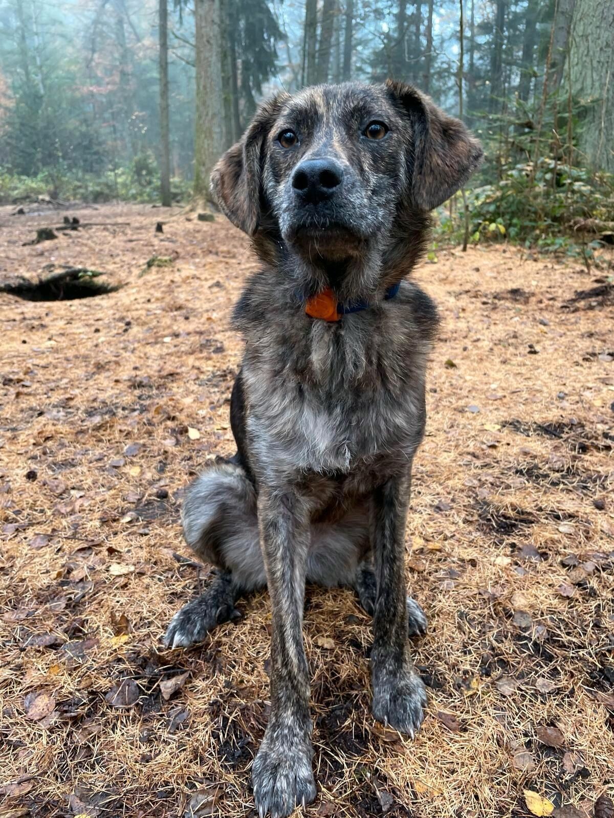 Im Wald ist sie mit einem Rudel von 10-15 Hunden zusammen. In diesem sind wirklich alle Größen und Alter vertreten. Auch hier zeigt sie sich interessiert, sozial und verspielt. Sie ist keine dominate Hündin, sondern orientiert sich an souveränen Hunden.