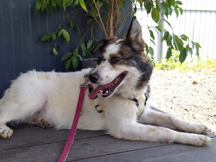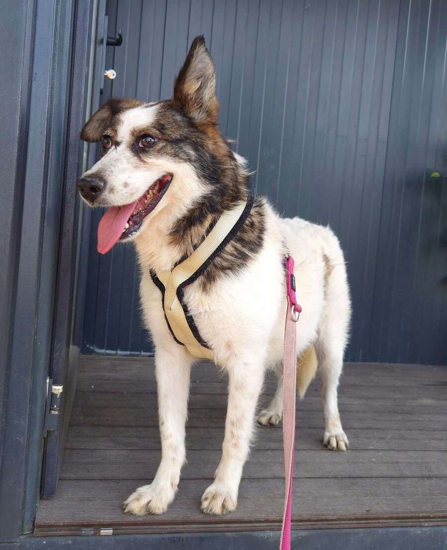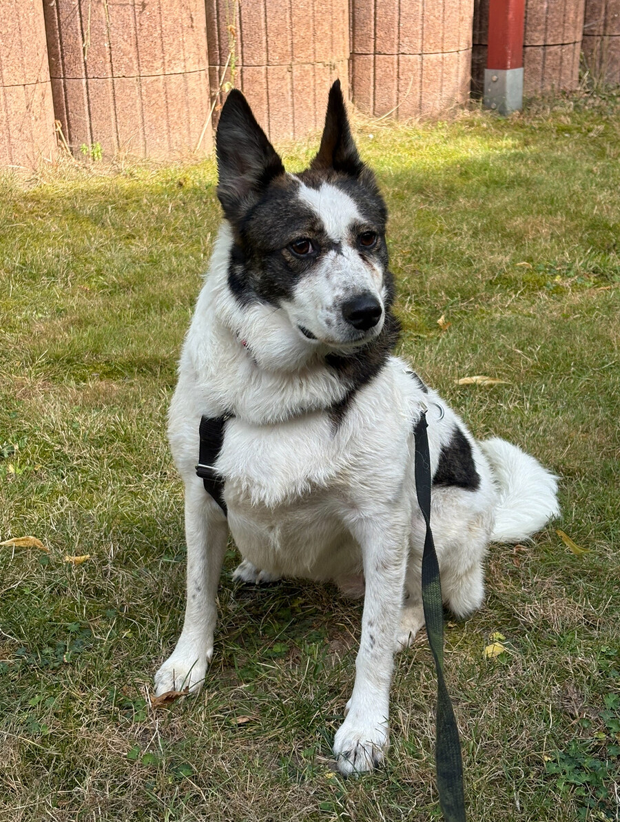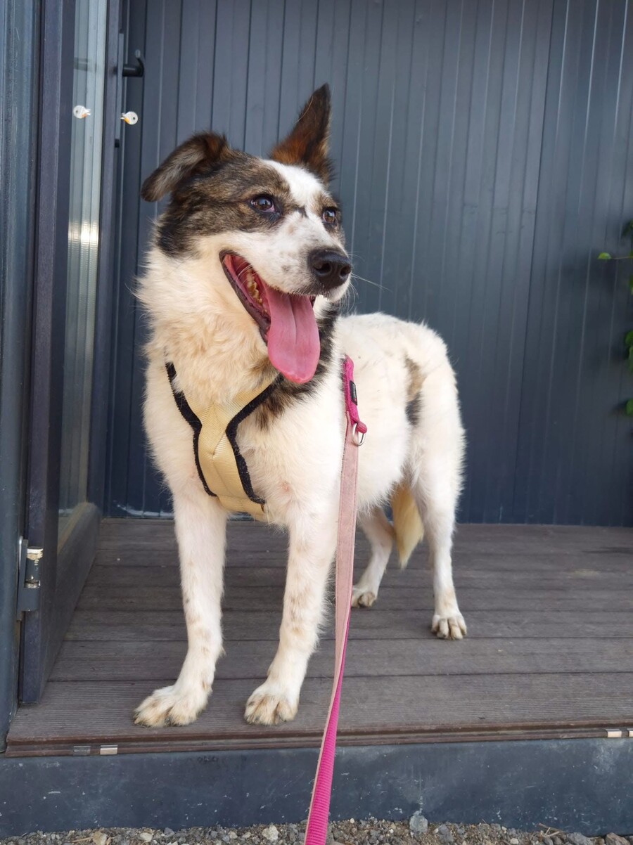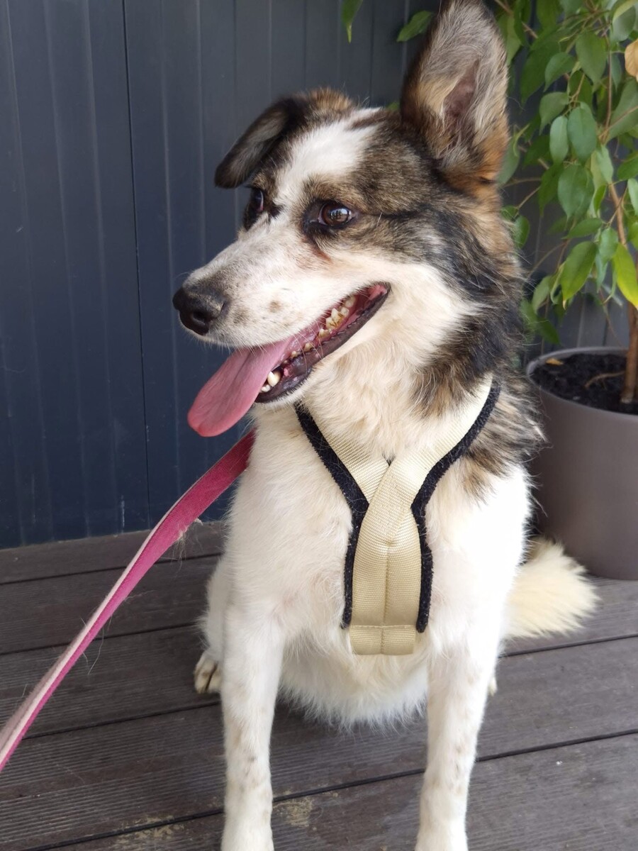 Hiwa, geboren 2021 und etwa 47 cm groß, ist eine liebevolle, verschmuste und verträgliche Hündin mit einem sonnigen Gemüt. Ihr fröhlicher Gesichtsausdruck und ihr charmantes Aussehen mit einem Steh- und einem Schlappohr machen sie zu einem echten Herzenshund.
