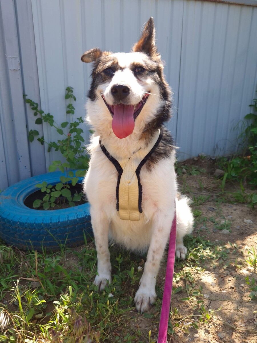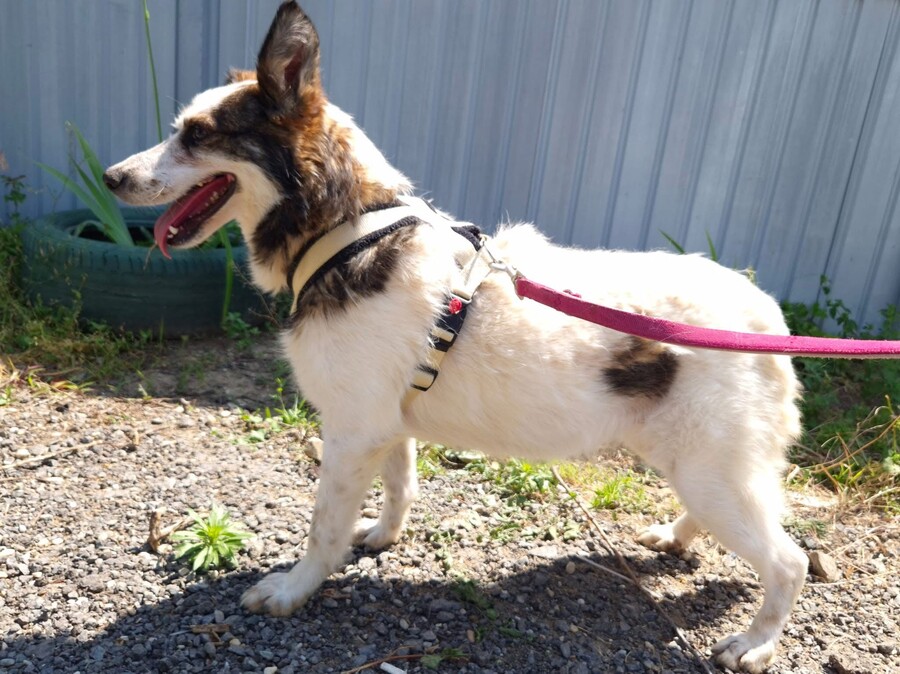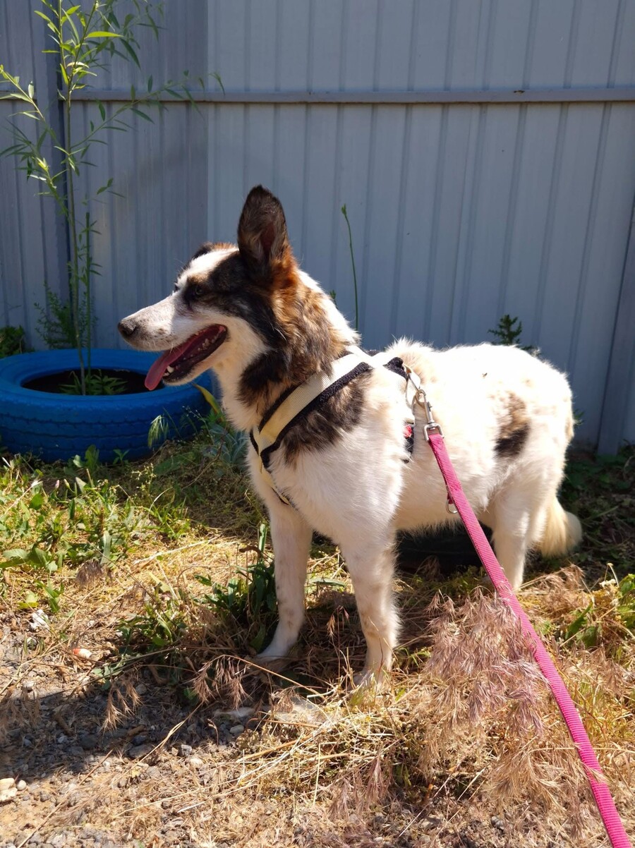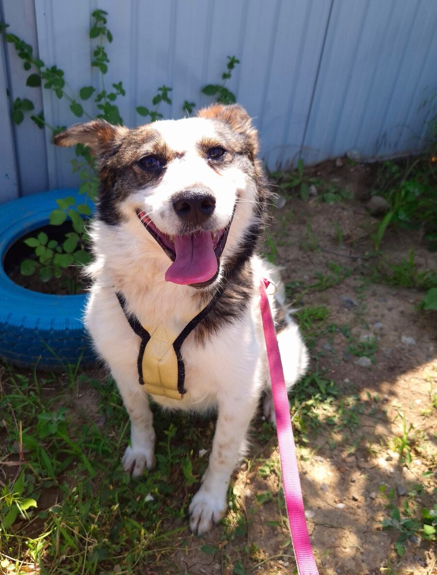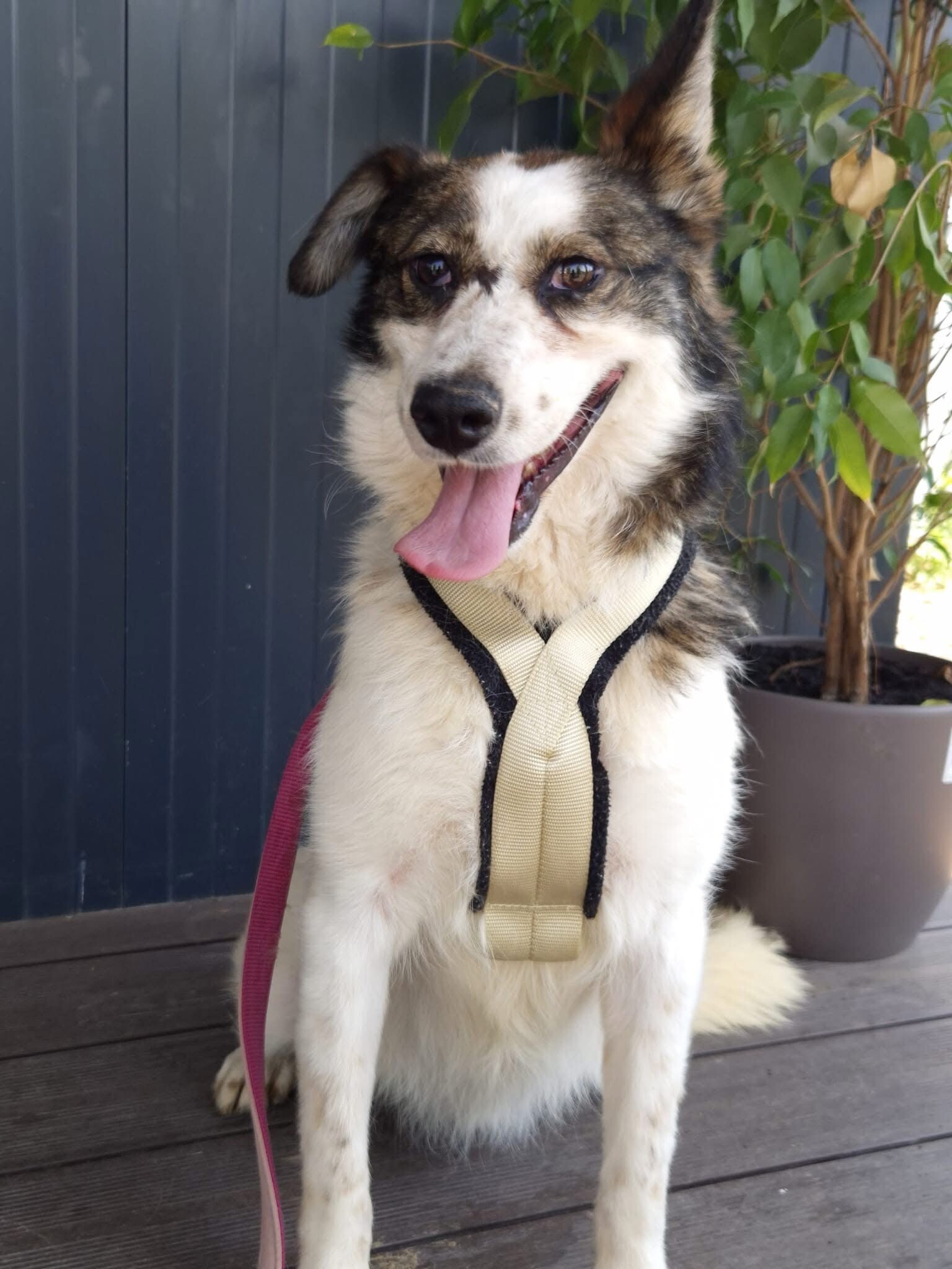 Hiwa, geboren 2021 und etwa 47 cm groß, ist eine liebevolle, verschmuste und verträgliche Hündin mit einem sonnigen Gemüt. Ihr fröhlicher Gesichtsausdruck und ihr charmantes Aussehen mit einem Steh- und einem Schlappohr machen sie zu einem echten Herzenshund.