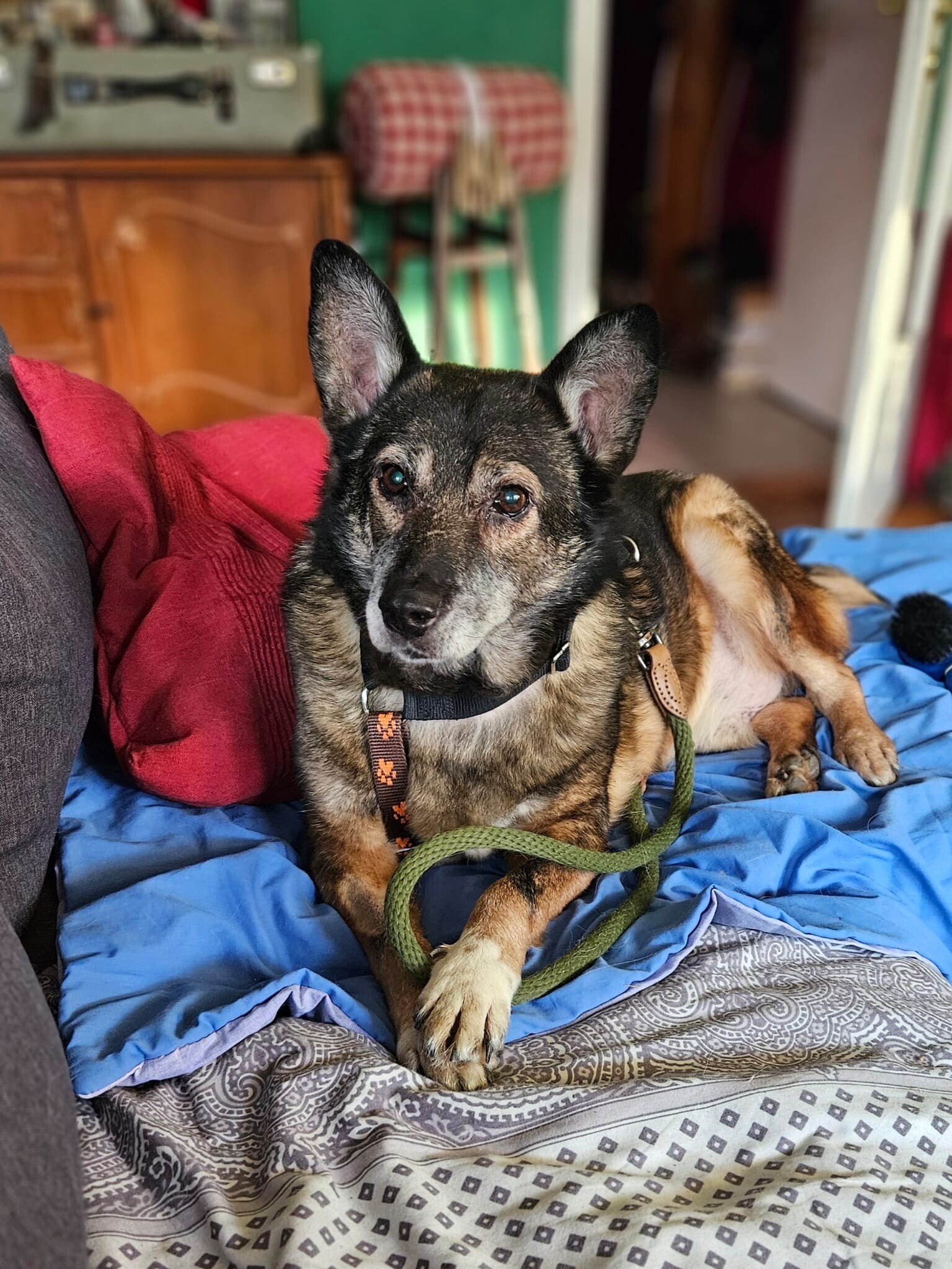 Das Geschirr lässt er sich mühelos anziehen und auch die Leine kennt er. Er kann als Zweithund, aber auch allein gehalten werden.