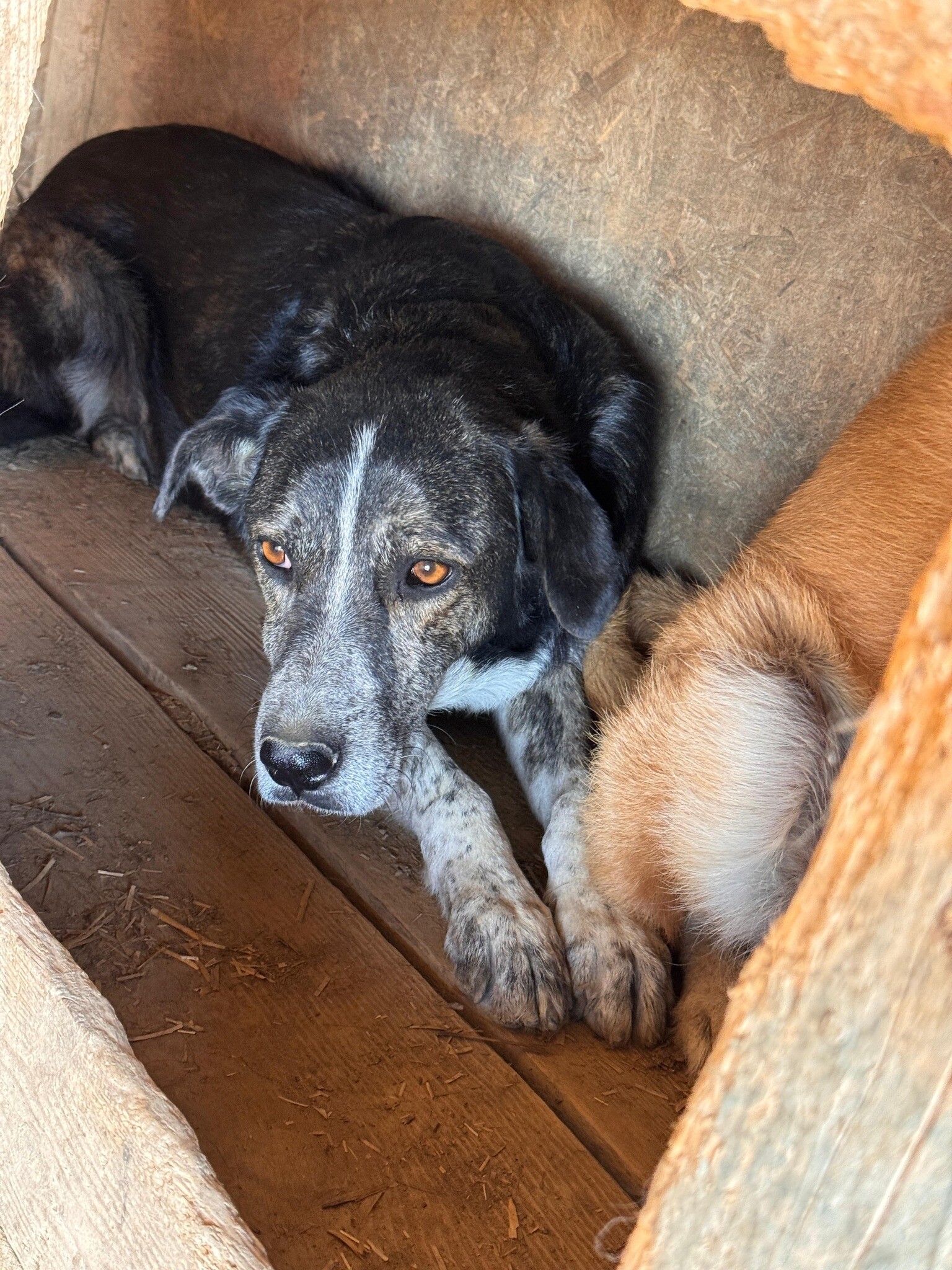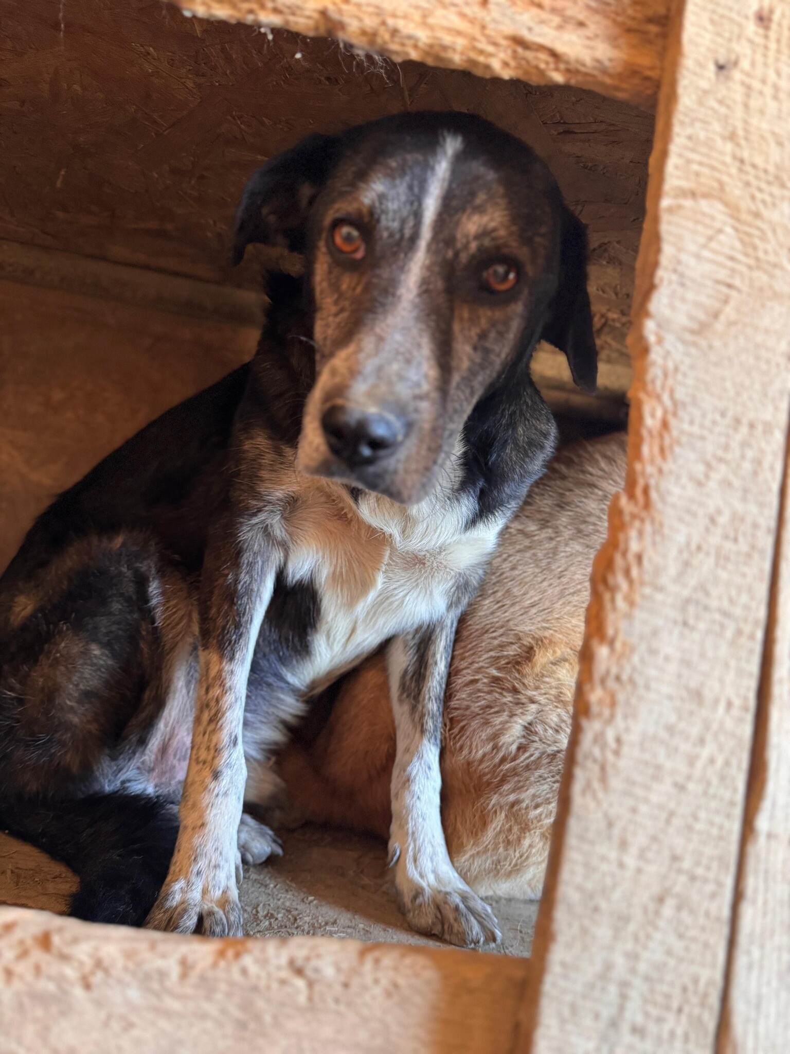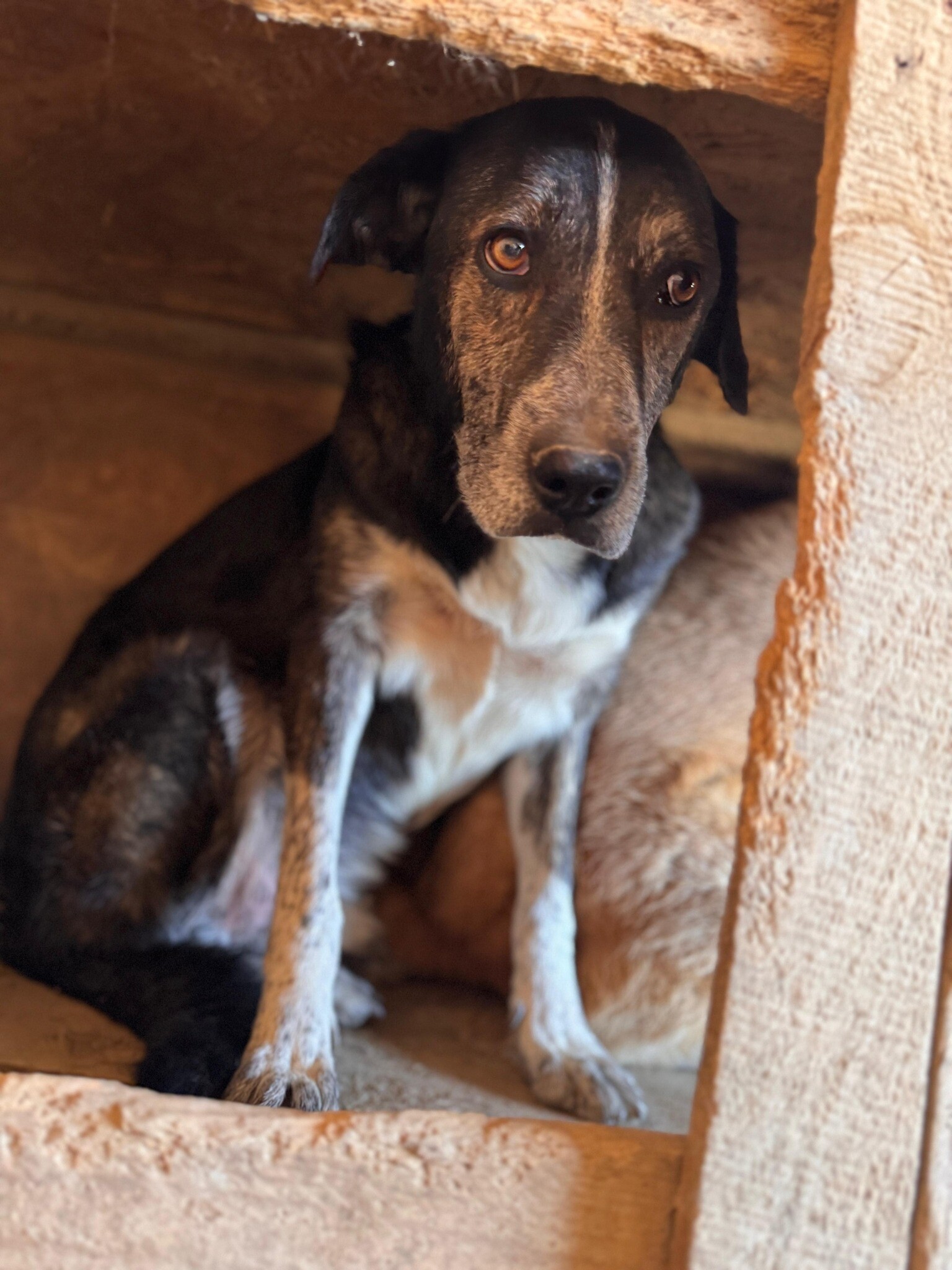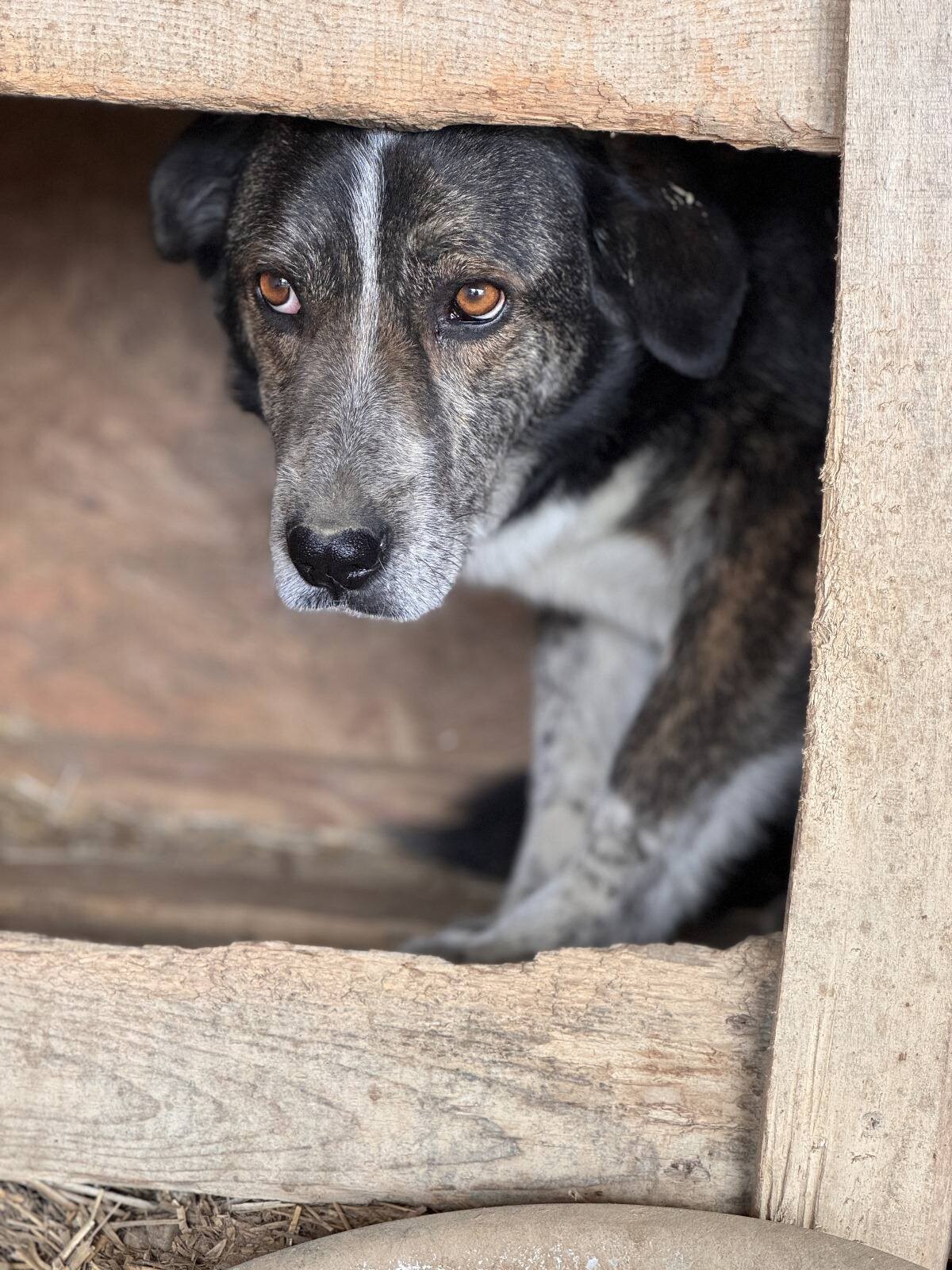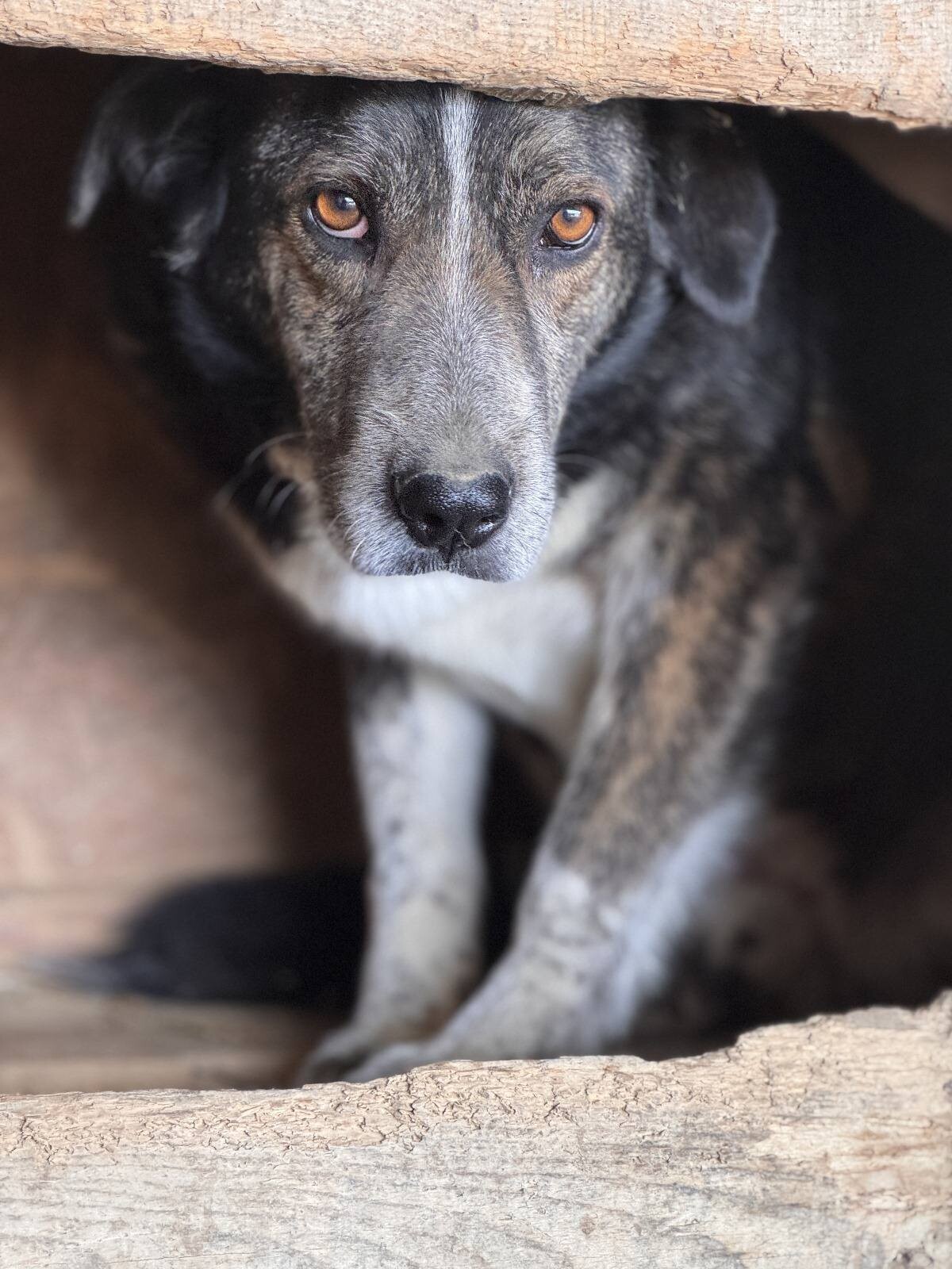 Tom, geboren 2017 und etwa 50 cm groß, gehört zu den Hunden, die das harte Shelterleben gezeichnet hat. Sein Blick wirkt leer, sein Verhalten zeigt kaum Interesse – als hätte er die Hoffnung auf ein besseres Leben längst aufgegeben. Selbst Angst scheint er nicht mehr zu empfinden, sondern hat sich in sein Schicksal gefügt.