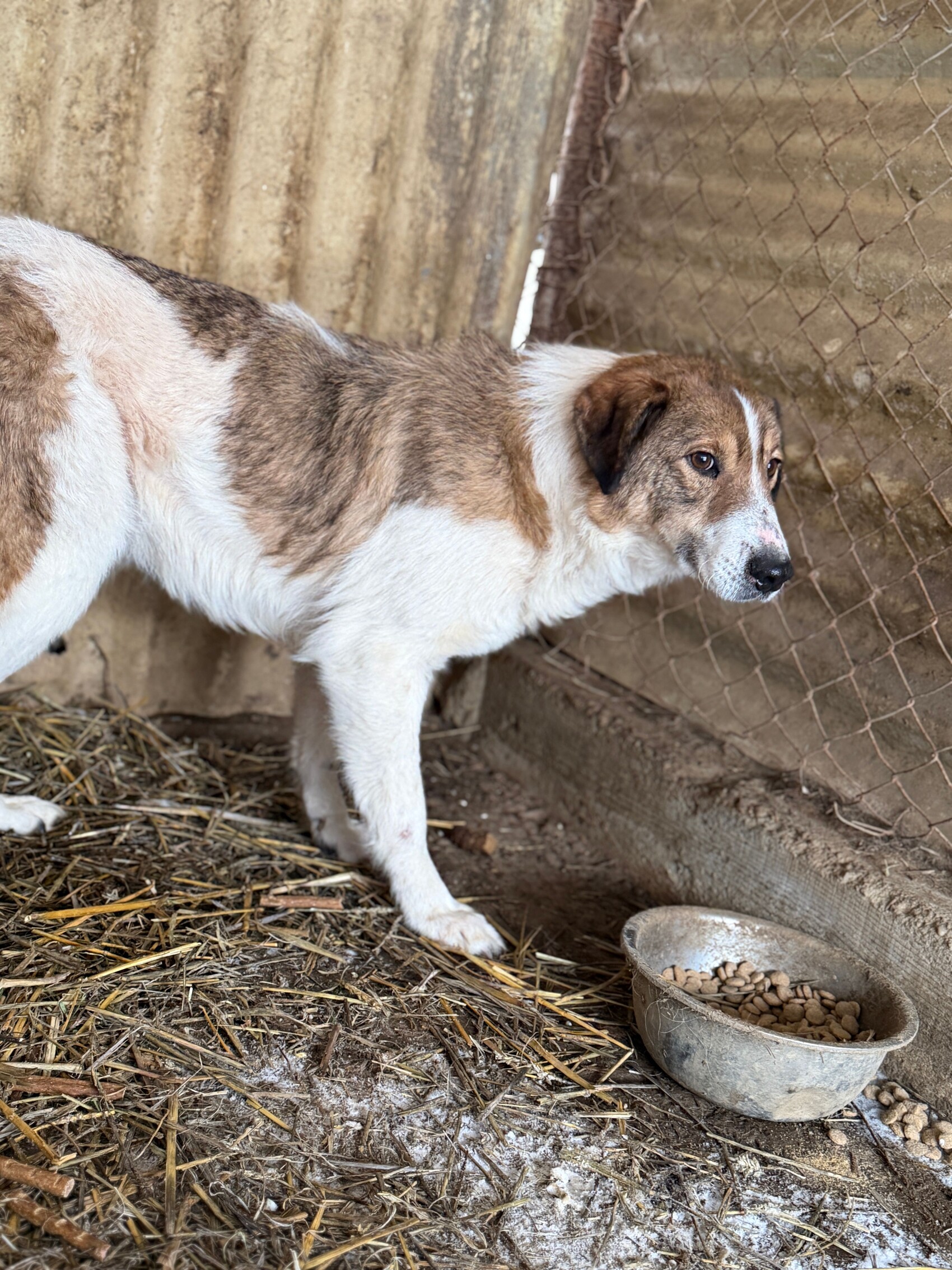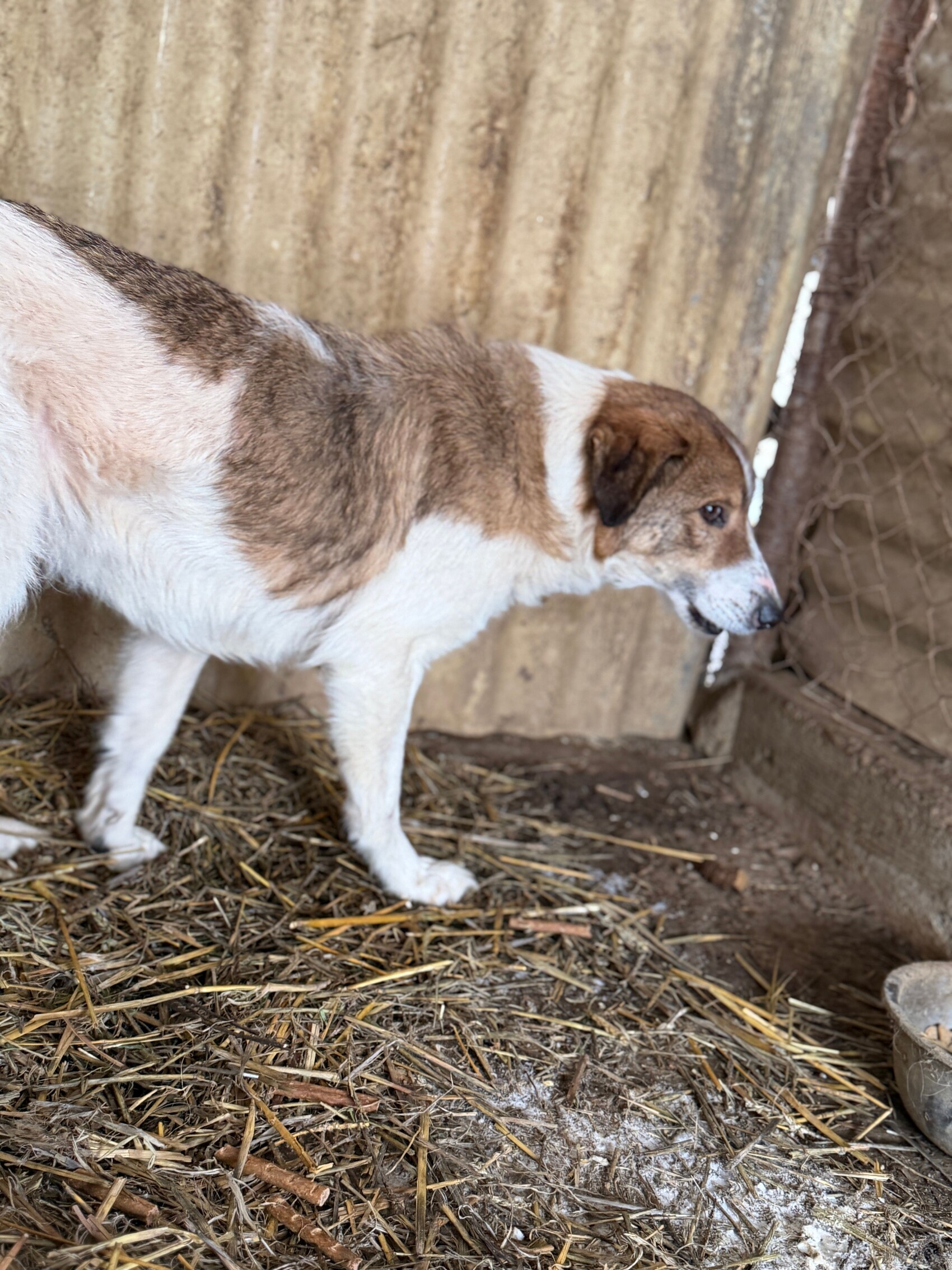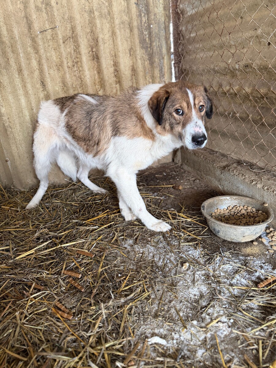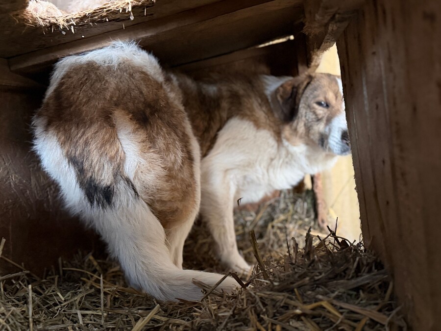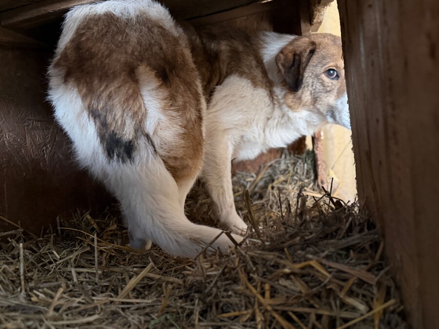 Mika ist ein sehr ängstlicher Rüde, geboren 2017 und etwa 50 cm groß, der sich im Moment nur in seiner schützenden Hütte sicher fühlt. Sobald jemand versucht, sich ihm zu nähern – besonders mit einem Handy zum Filmen – flüchtet er sofort. Er ist eine zutiefst verunsicherte, arme Seele, die erst wieder lernen muss, dass die Welt nicht nur aus Gefahren besteht.