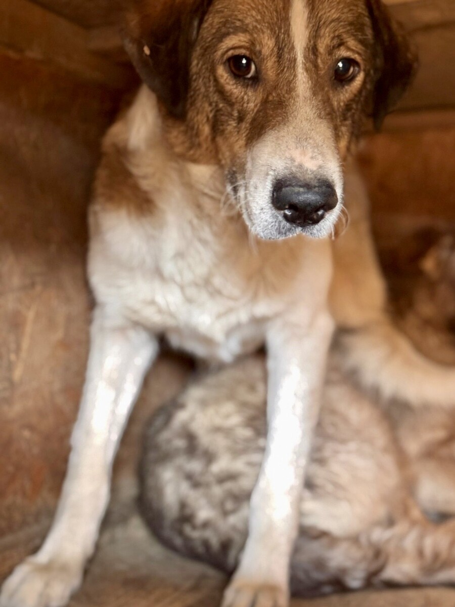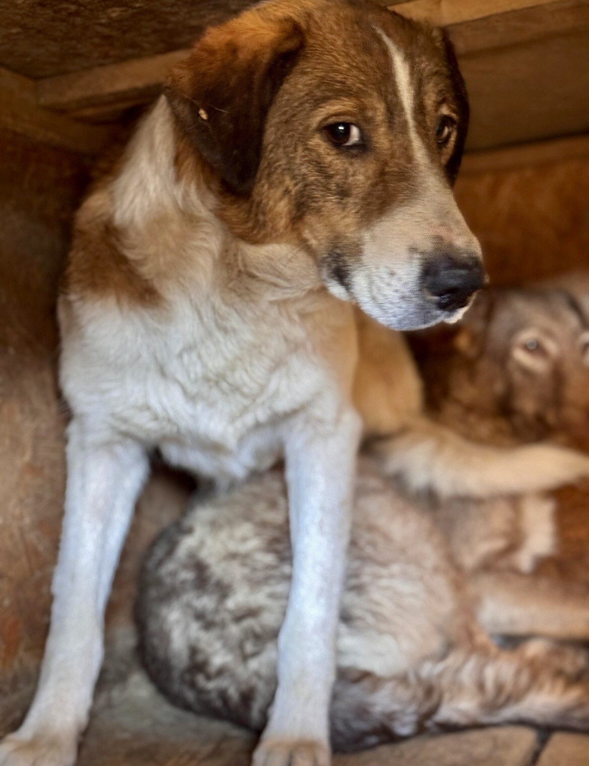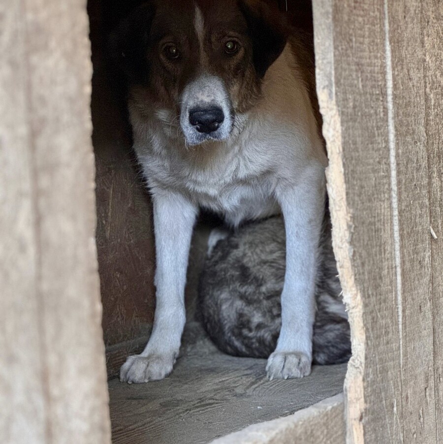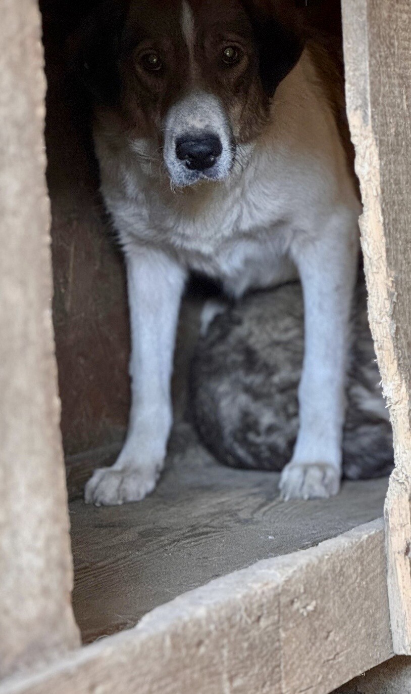 Mika ist ein sehr ängstlicher Rüde, geboren 2017 und etwa 50 cm groß, der sich im Moment nur in seiner schützenden Hütte sicher fühlt. Sobald jemand versucht, sich ihm zu nähern – besonders mit einem Handy zum Filmen – flüchtet er sofort. Er ist eine zutiefst verunsicherte, arme Seele, die erst wieder lernen muss, dass die Welt nicht nur aus Gefahren besteht.
