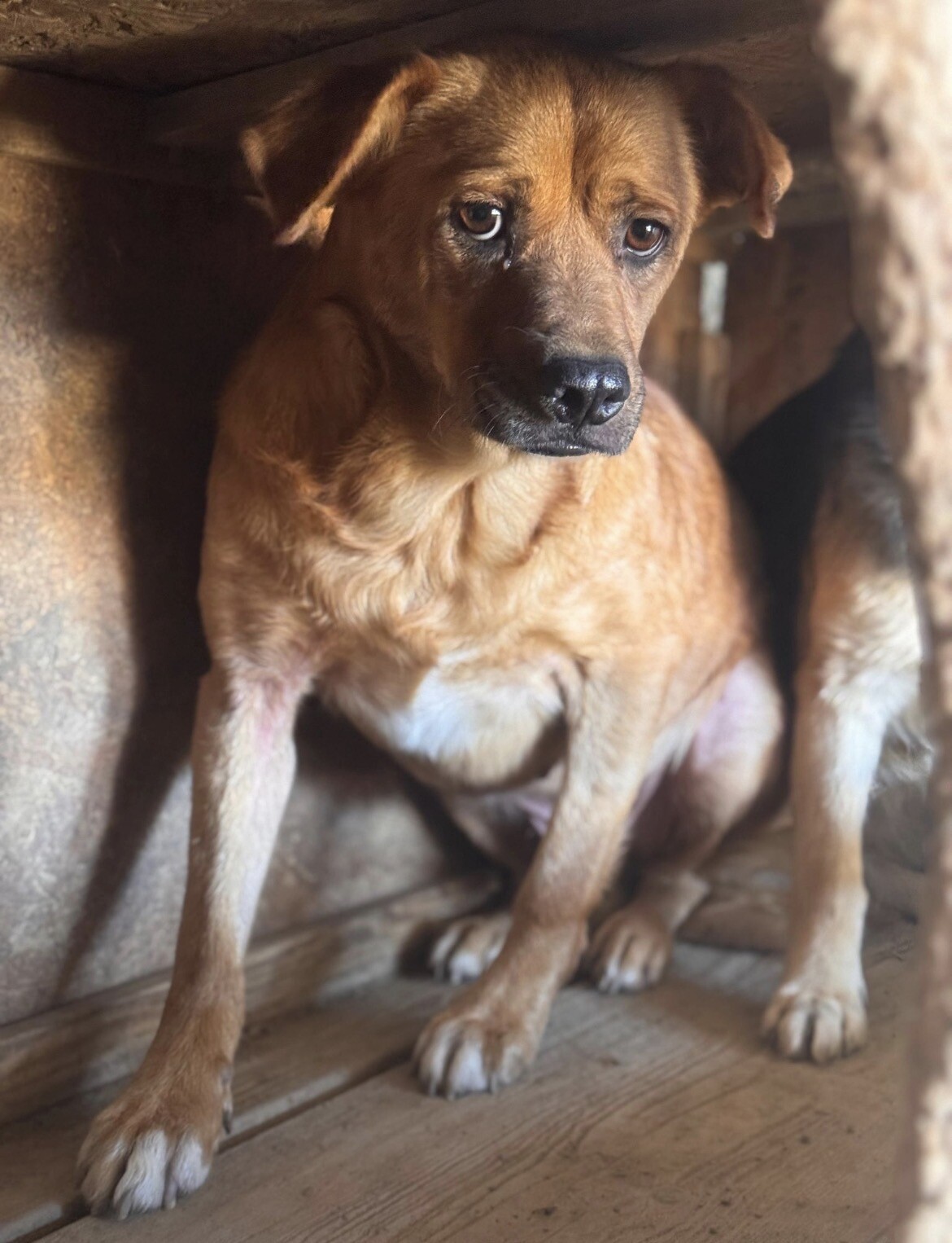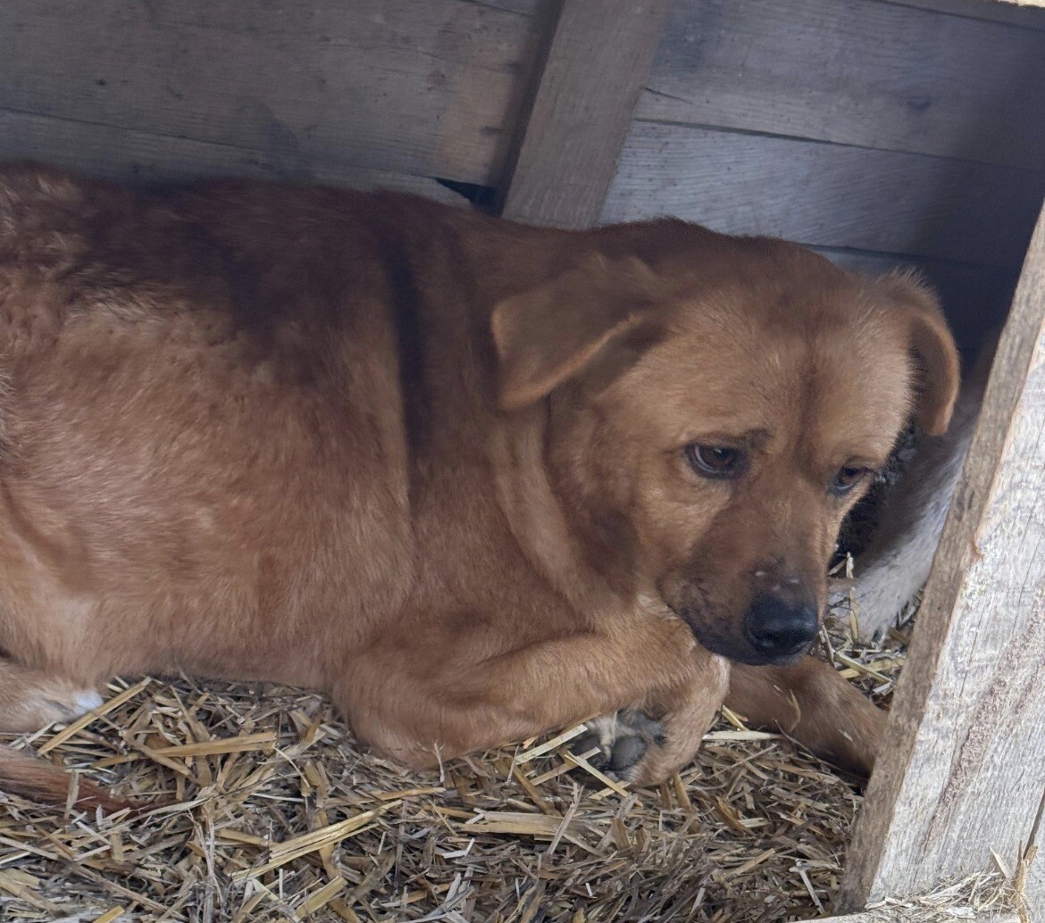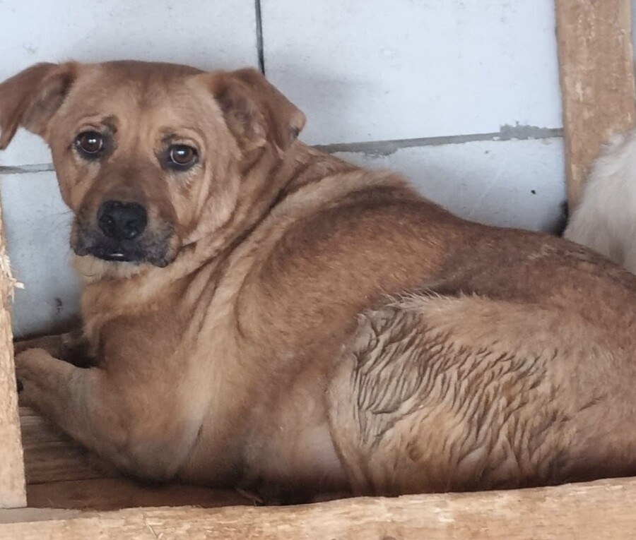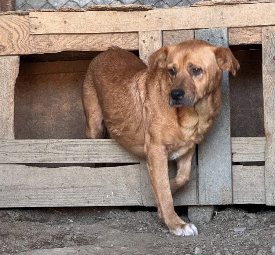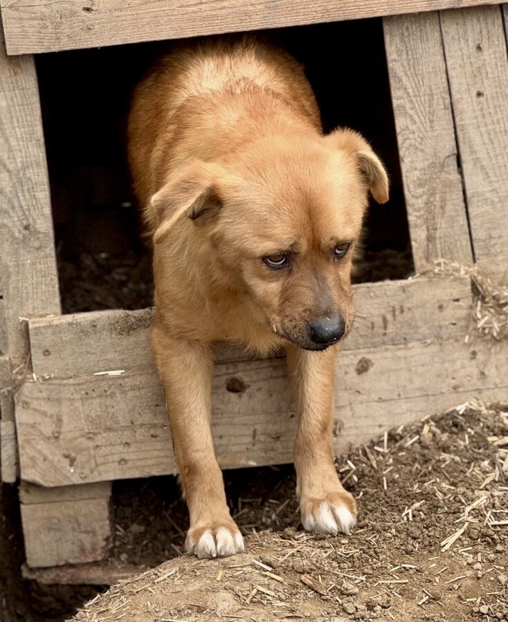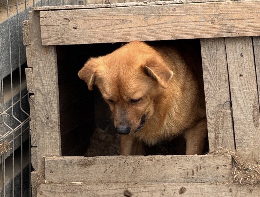 Benno wurde etwa 2020 geboren und misst rund 50 cm. Er ist ein Hund, der gelernt hat, Abstand zu halten, weil Nähe für ihn lange nichts Sicheres war. Als er ins Tierheim kam, hielt er sich lieber außerhalb der Hütte auf – oder oben drauf – und verschwand sofort in den sicheren Schatten, sobald sich jemand näherte. Knurren war seine Art zu sagen: „Bitte gib mir Raum.“