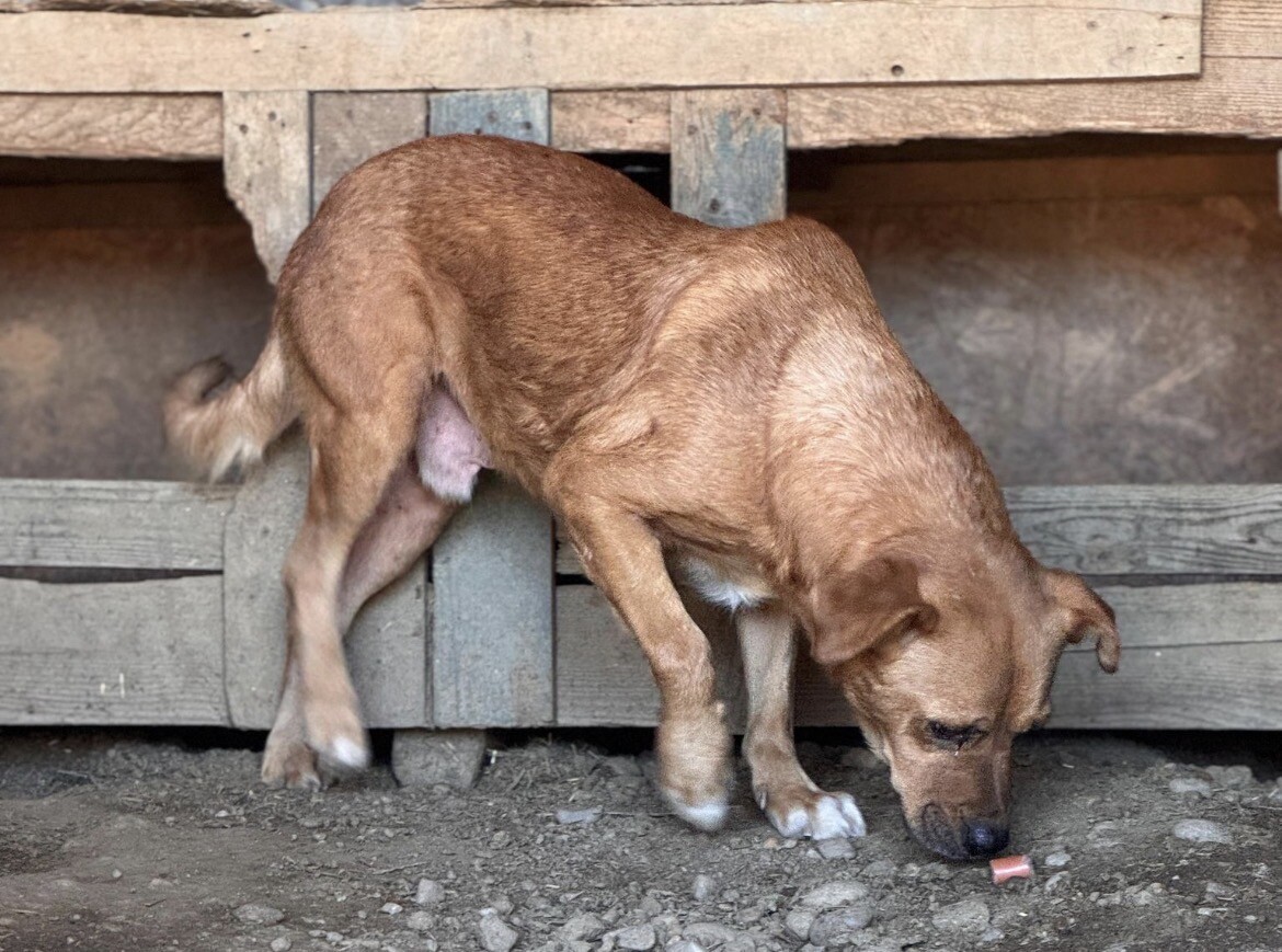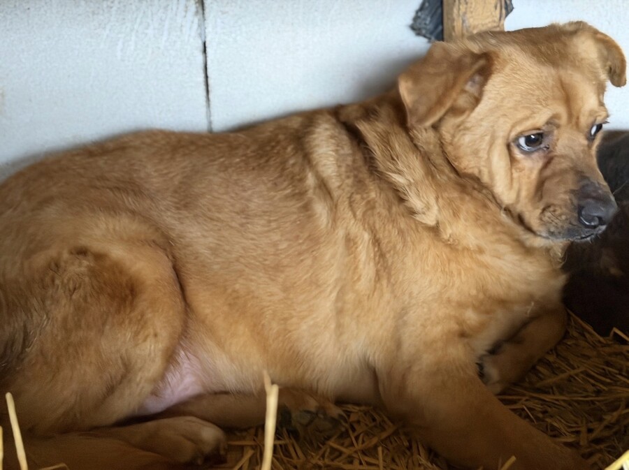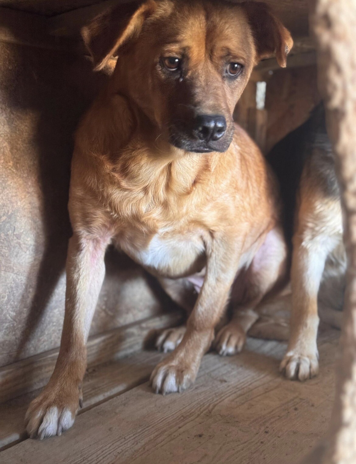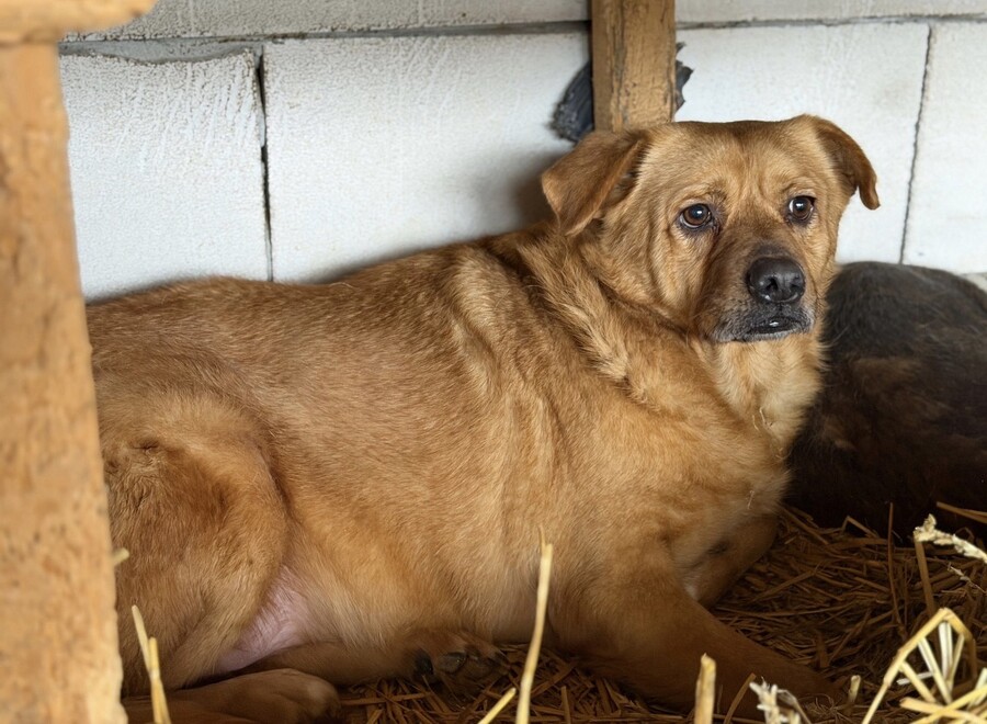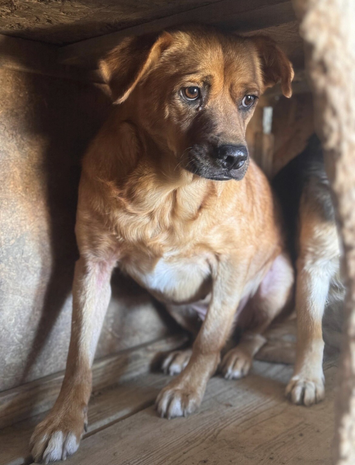 Benno wurde etwa 2020 geboren und misst rund 50 cm. Er ist ein Hund, der gelernt hat, Abstand zu halten, weil Nähe für ihn lange nichts Sicheres war. Als er ins Tierheim kam, hielt er sich lieber außerhalb der Hütte auf – oder oben drauf – und verschwand sofort in den sicheren Schatten, sobald sich jemand näherte. Knurren war seine Art zu sagen: „Bitte gib mir Raum.“