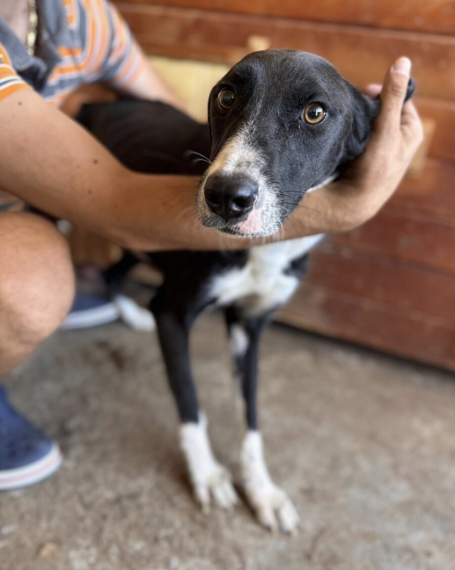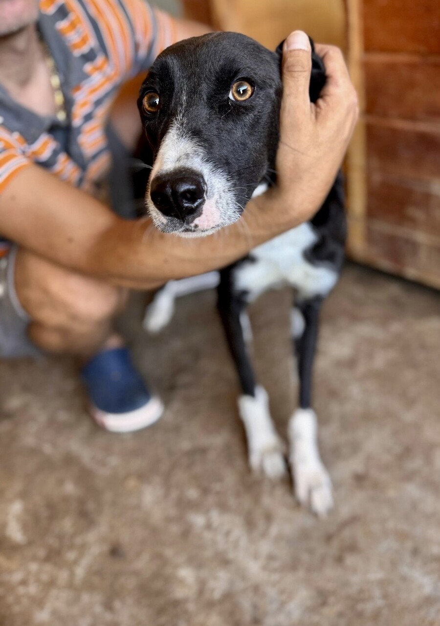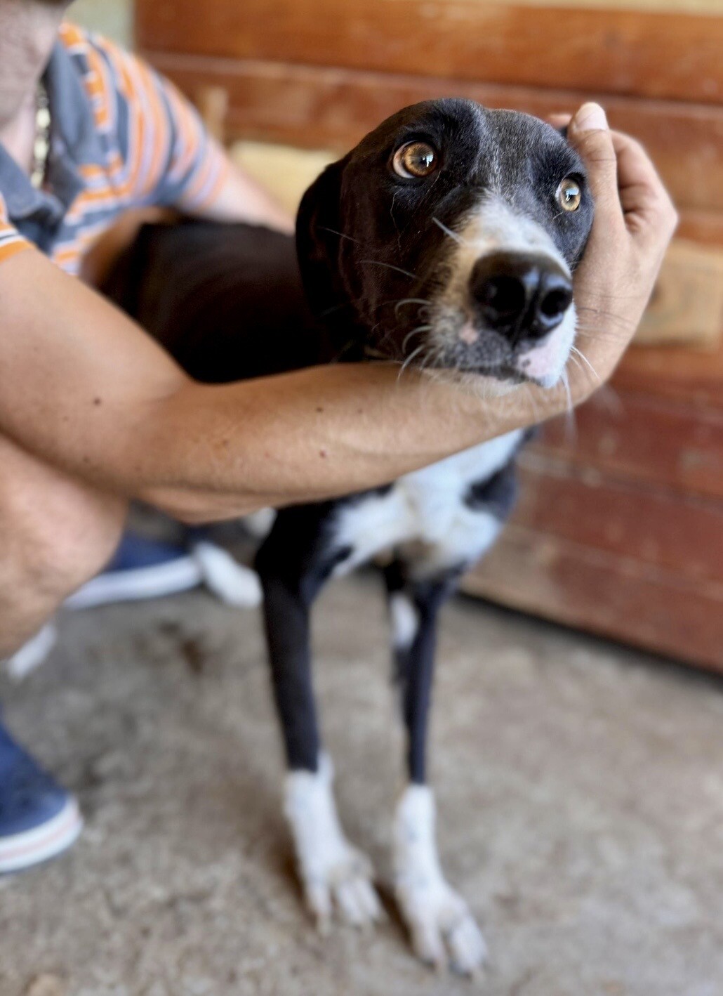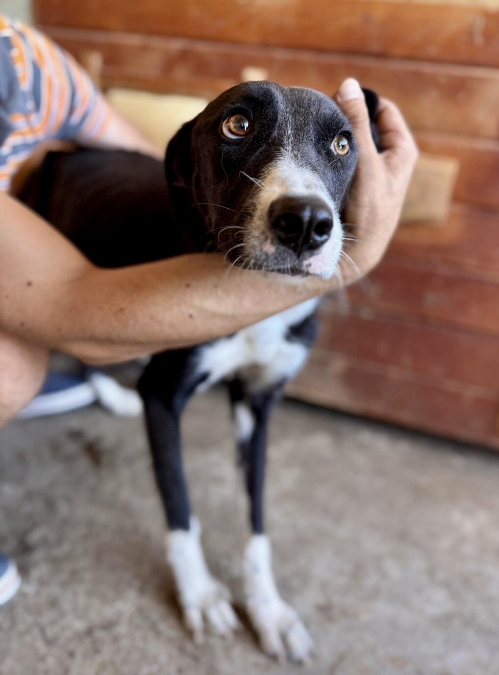 Simona ist die Tapferste unter den vier wunderschönen Geschwistern Ina, Marco und Jesse. Während die anderen noch abwarten, macht sie mutig den ersten Schritt. Sie ist etwa 45 cm groß, neugierig, offen – und sie lässt sich gut anfassen und streicheln. Eine junge Hündin, die spürt, dass Nähe etwas Schönes sein kann.