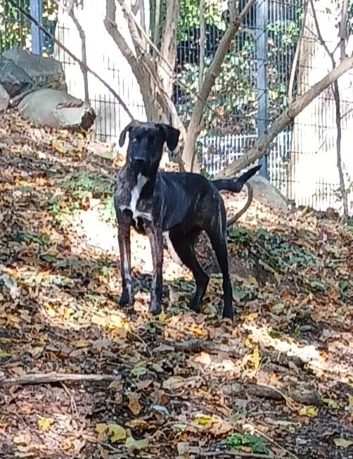 Er lebt hier im gemischten Rudel und ist sehr verträglich mit Artgenossen und freundlich zu Menschen.