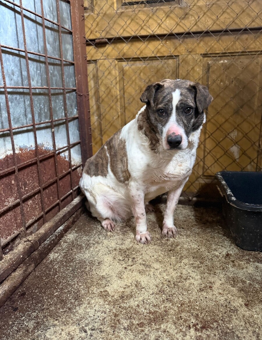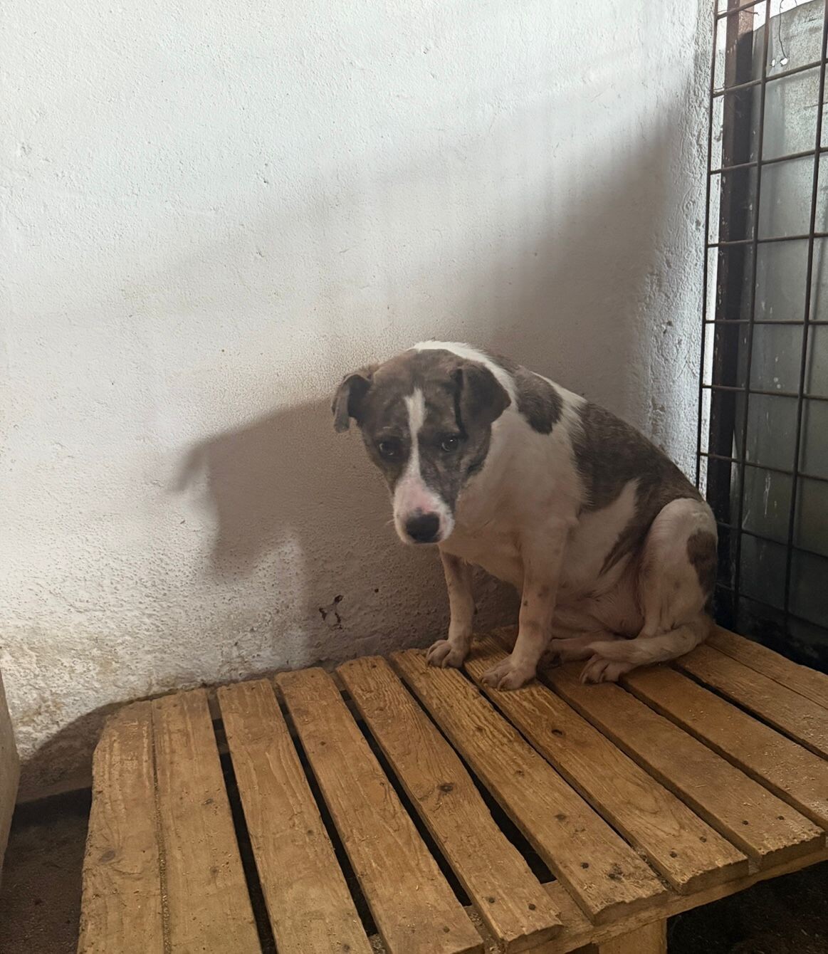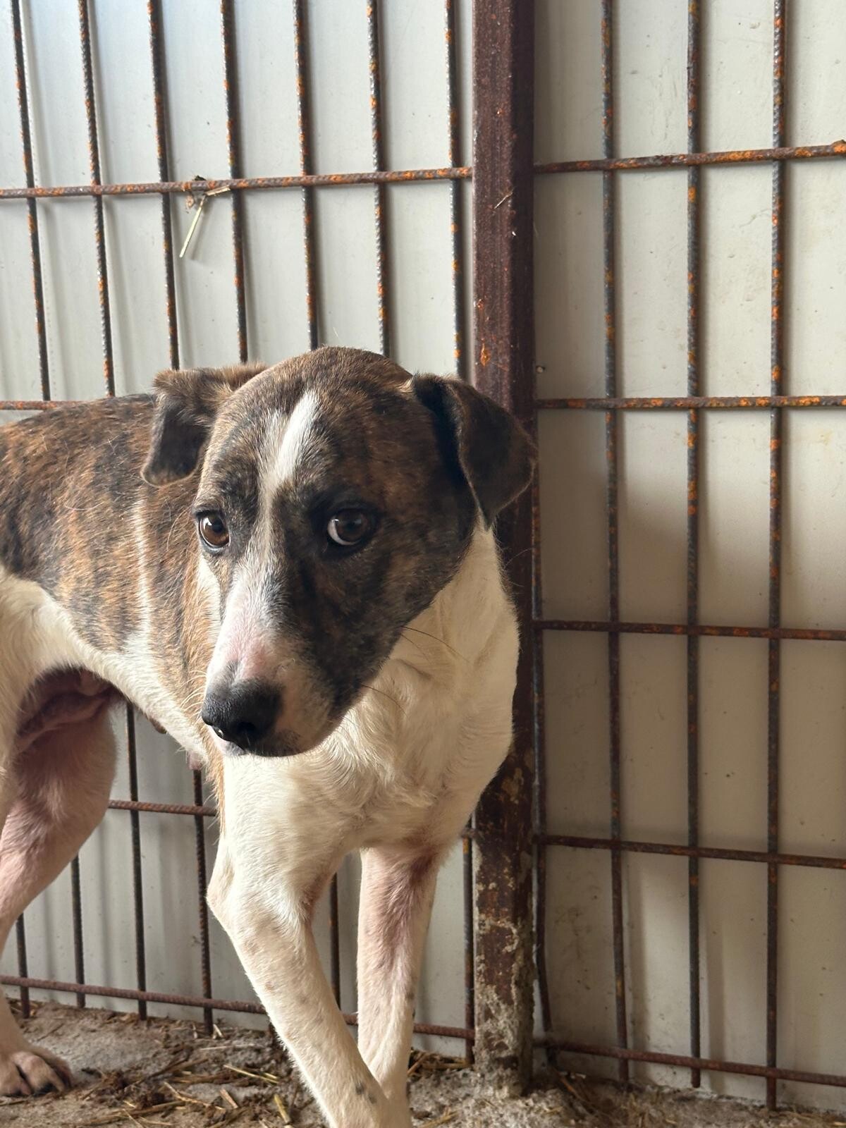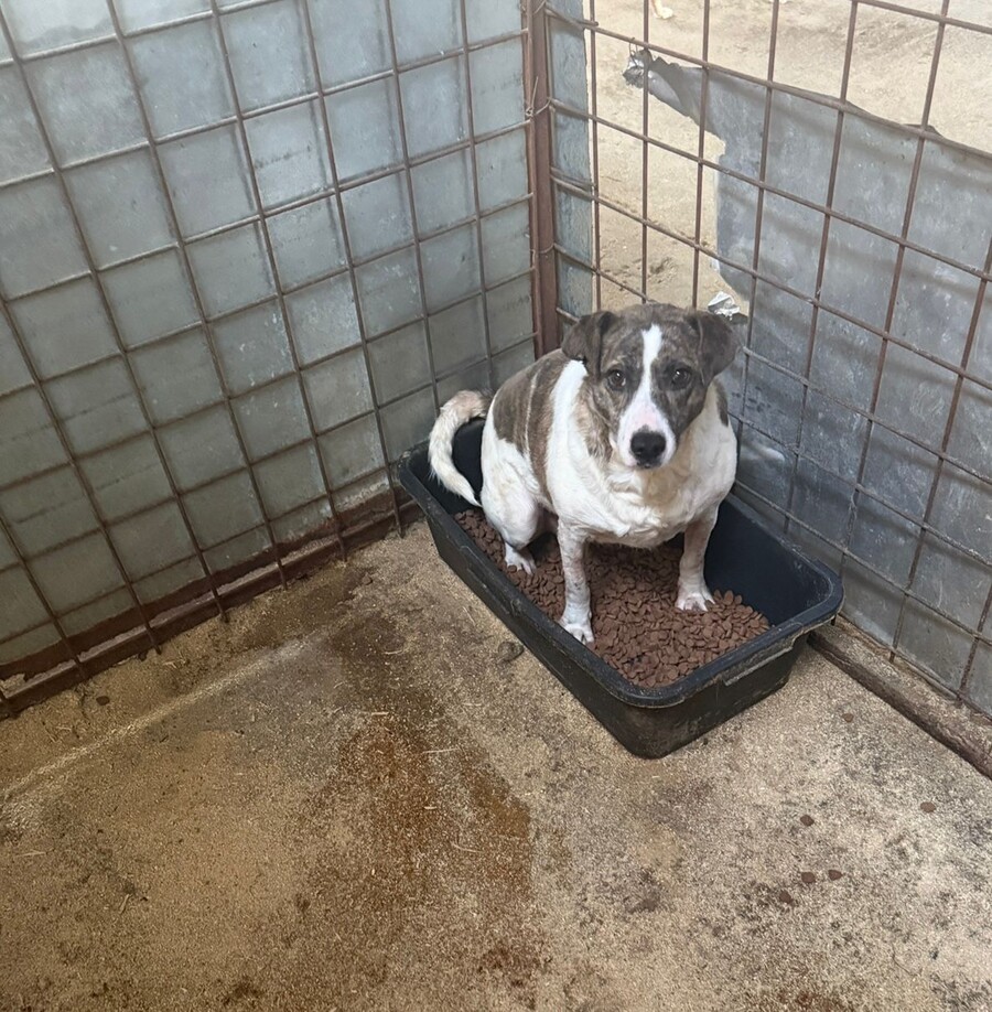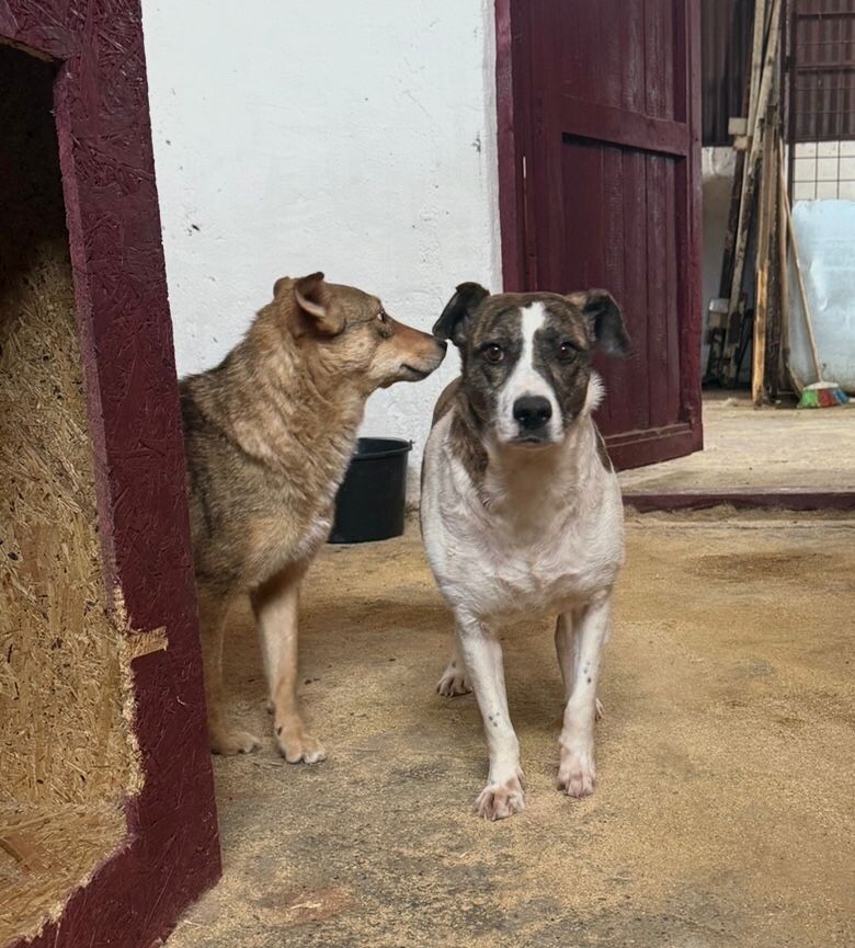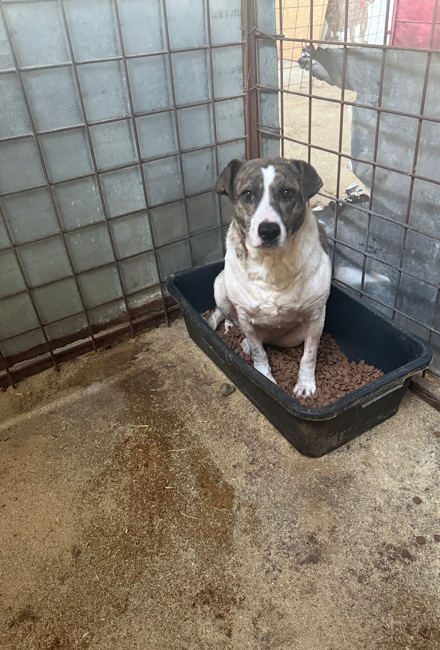 Sie zeigt sich als sehr ängstliche, aversive Hündin, die kaum noch in Interaktion geht – weder mit Menschen noch mit Artgenossen. Aktuell lebt sie mit einem älteren Rüden zusammen, jedoch ohne erkennbare Bindung.