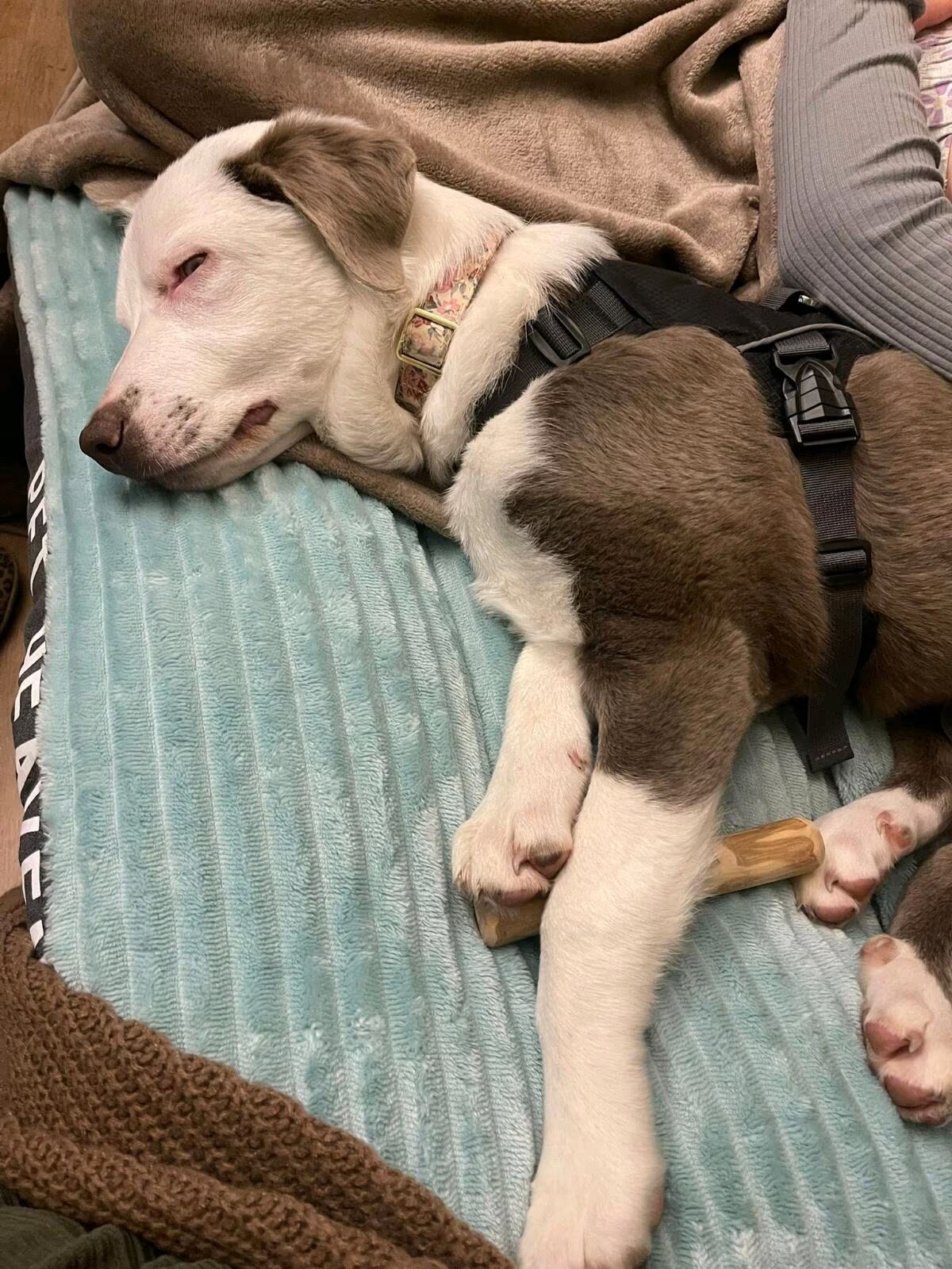 Da ich vor allem anfangs eher schüchtern und etwas ängstlich bin, solltest du ein bisschen Geduld mitbringen. Auf lange Sicht freue ich mich sehr, wenn du mit mir arbeitest und mich auslastest. Allein bleiben musste ich bisher erst einmal für ein Stündchen – in der Zeit habe ich friedlich in meiner Box gedöst.