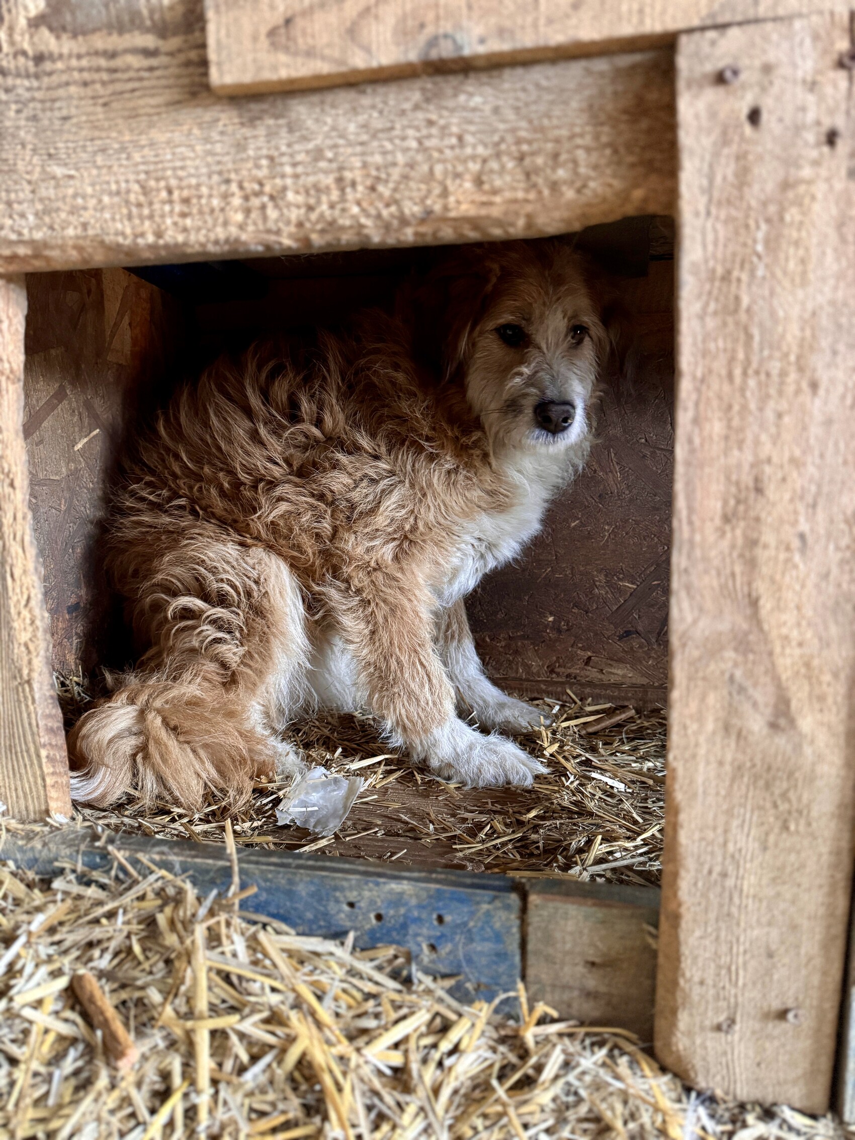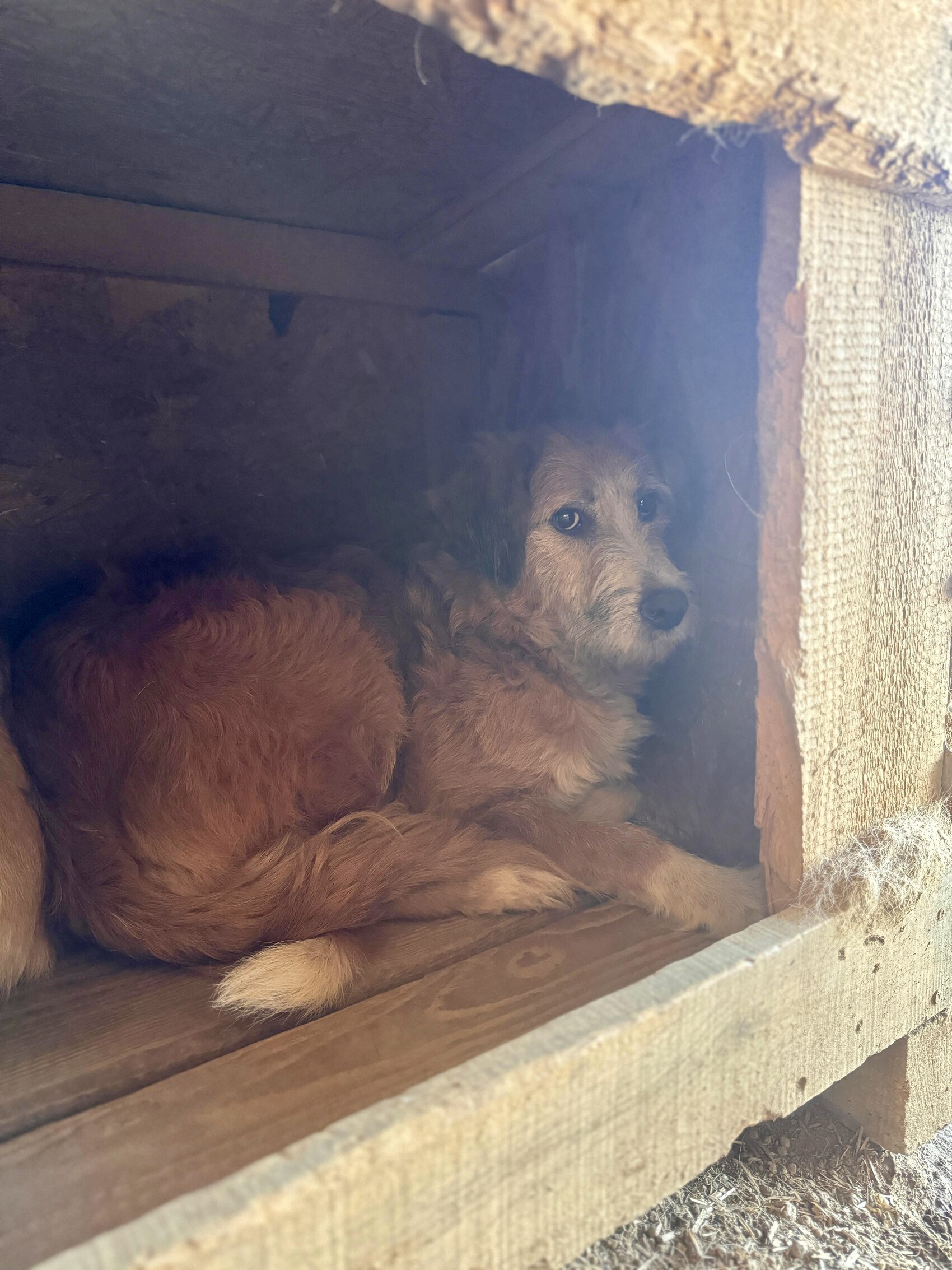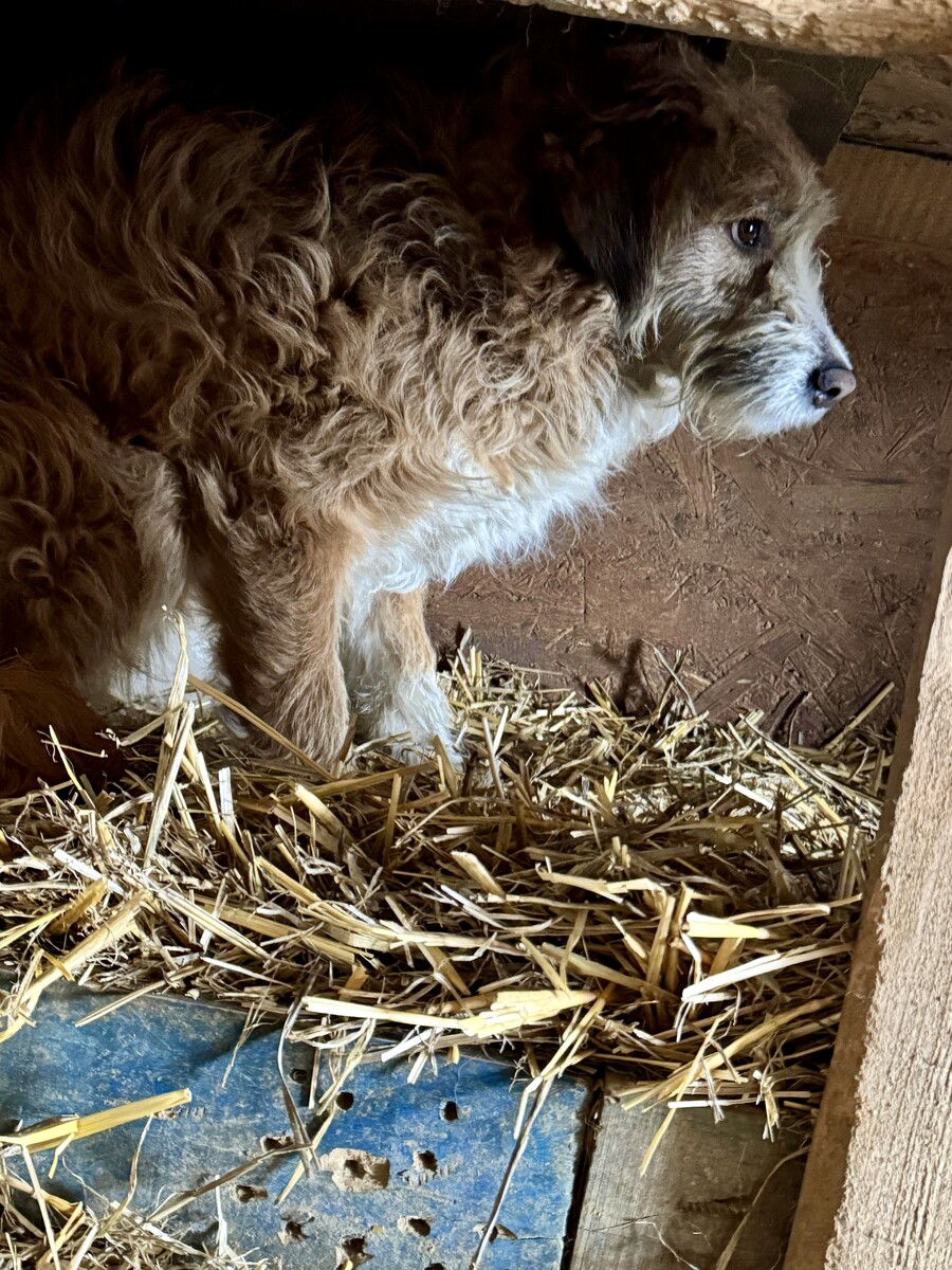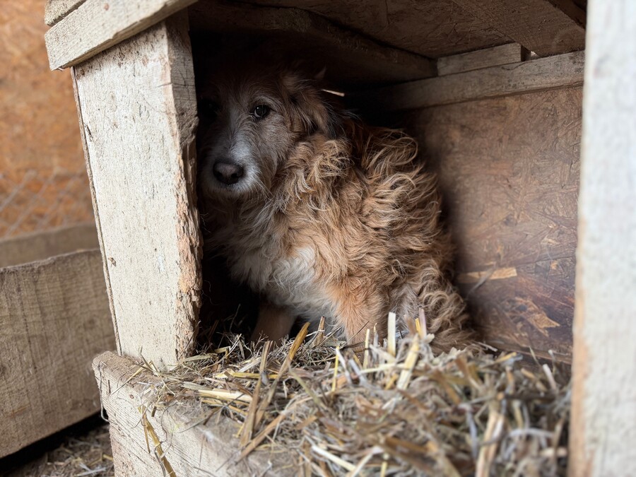 Hope ist eine zurückhaltende, sehr sensible Hündin, die bei Annäherung erstarrt und regungslos in der Ecke ihrer Hütte verharrt. Ihre genaue Größe lässt sich nur schwer einschätzen. Vom Fell her erinnert sie an einen Terriermix - eine ganz bezaubernde Maus mit dunklen Knopfaugen, die sich jedoch unsichtbar macht.