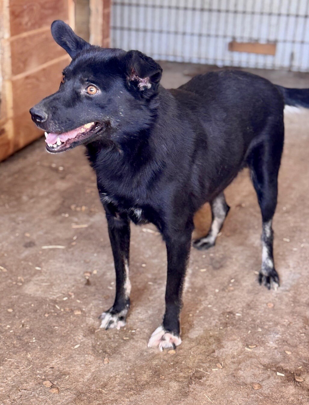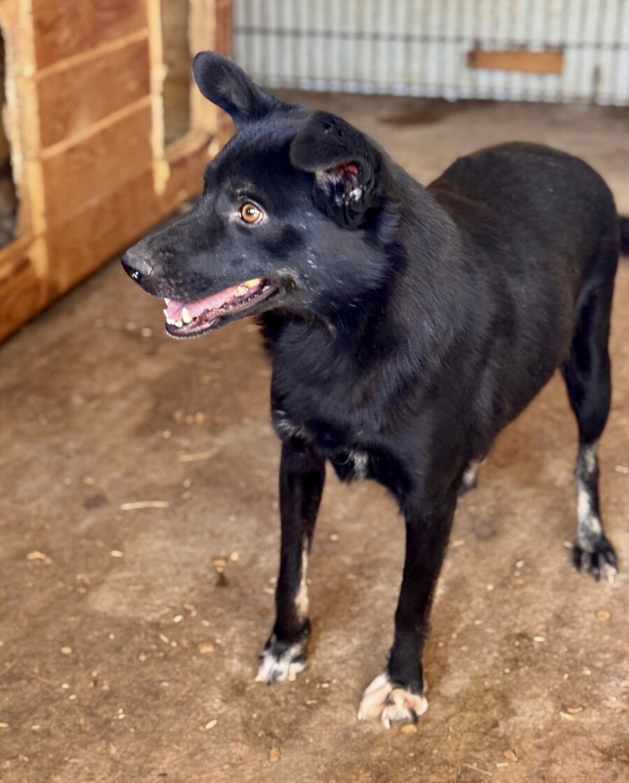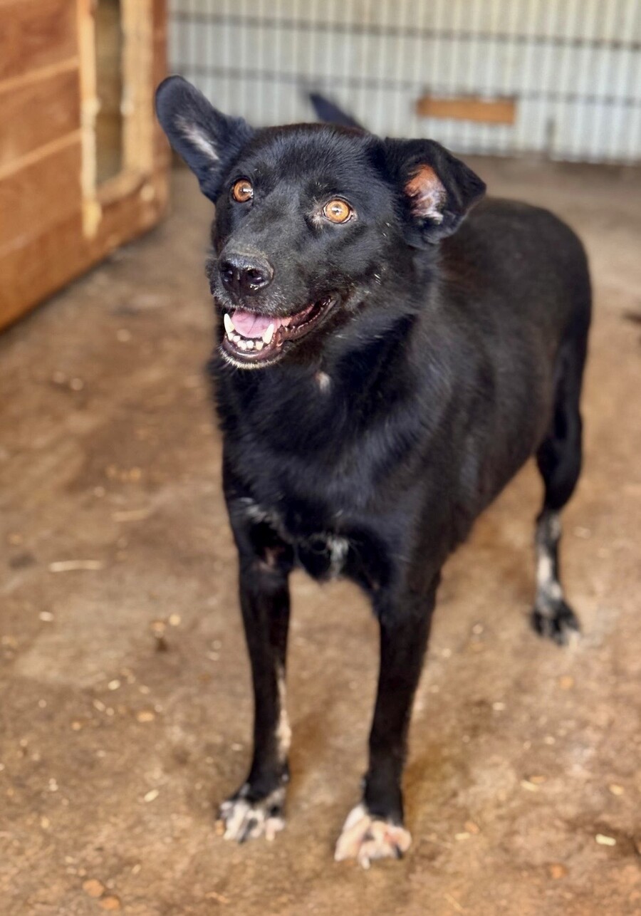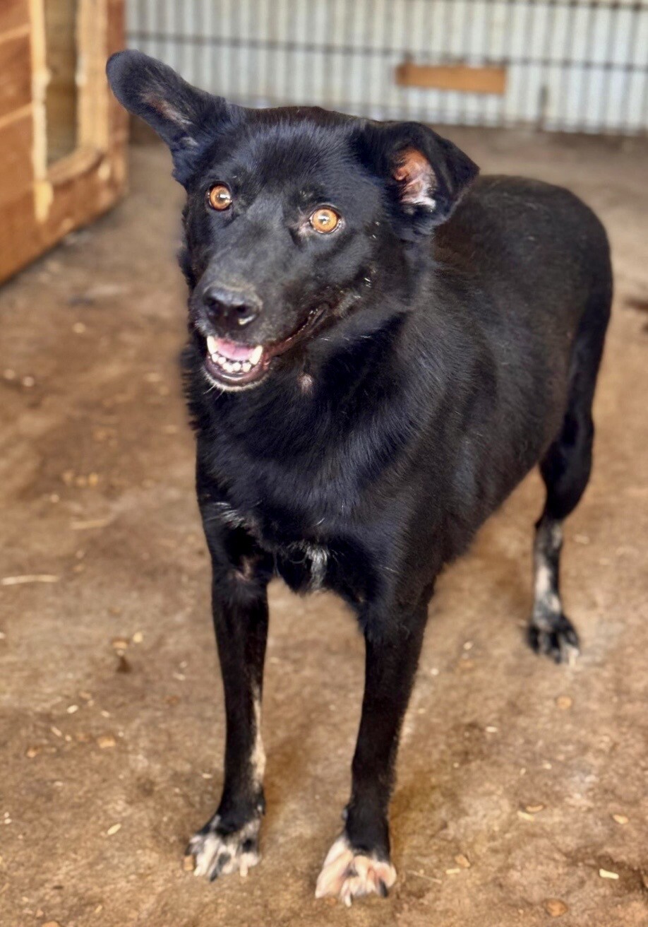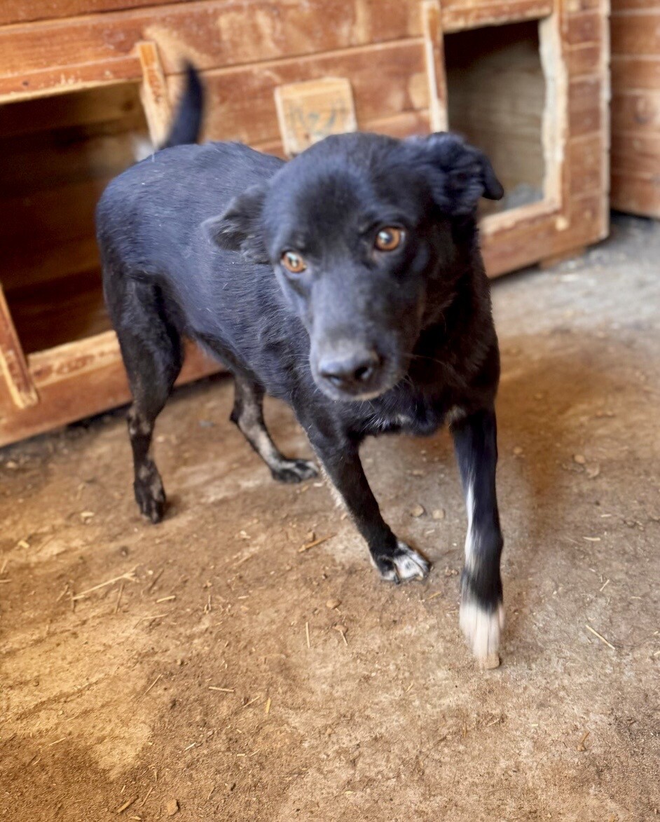 Blacky, geboren 2024 und mit etwa 52 cm eine mittelgroße junge Hündin, trägt ein freundliches, liebenswertes Wesen in sich. Gegenüber fremden Menschen zeigt sie sich noch schüchtern – und das ist vollkommen verständlich, wenn man bedenkt, was sie in ihren ersten Lebensmonaten erleben musste.