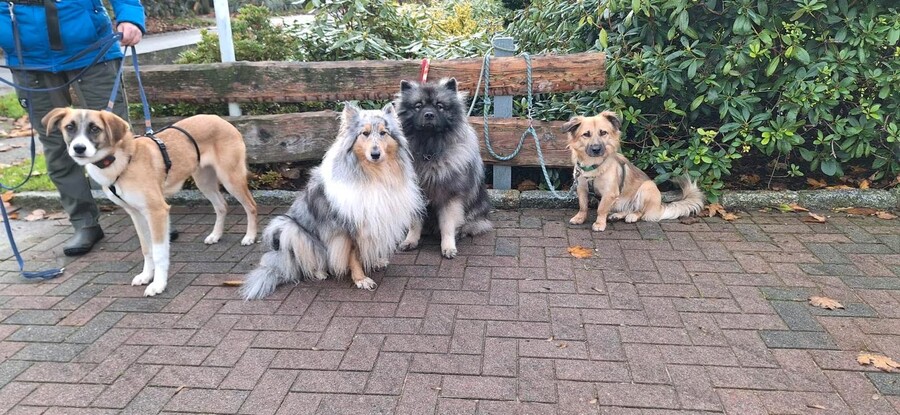 Draußen läuft Mika schon richtig gut an der Leine und nimmt sich Zeit, die neue Welt in Ruhe kennenzulernen. Große Tiere wie Pferde und Kühe waren anfangs etwas unheimlich, aber mit ruhiger Bestimmtheit lässt sie sich wunderbar hindurchführen. Umweltreize sind für Mika überhaupt kein Problem. Auch die ersten Hundebegegnungen verliefen völlig entspannt: Beim Spaziergang mit einer Nachbarin und ihren drei Hunden sind alle vier locker und ruhig nebeneinander hergelaufen. Das Alleinebleiben sollte in ihrem neuen Zuhause erneut behutsam aufgebaut werden.