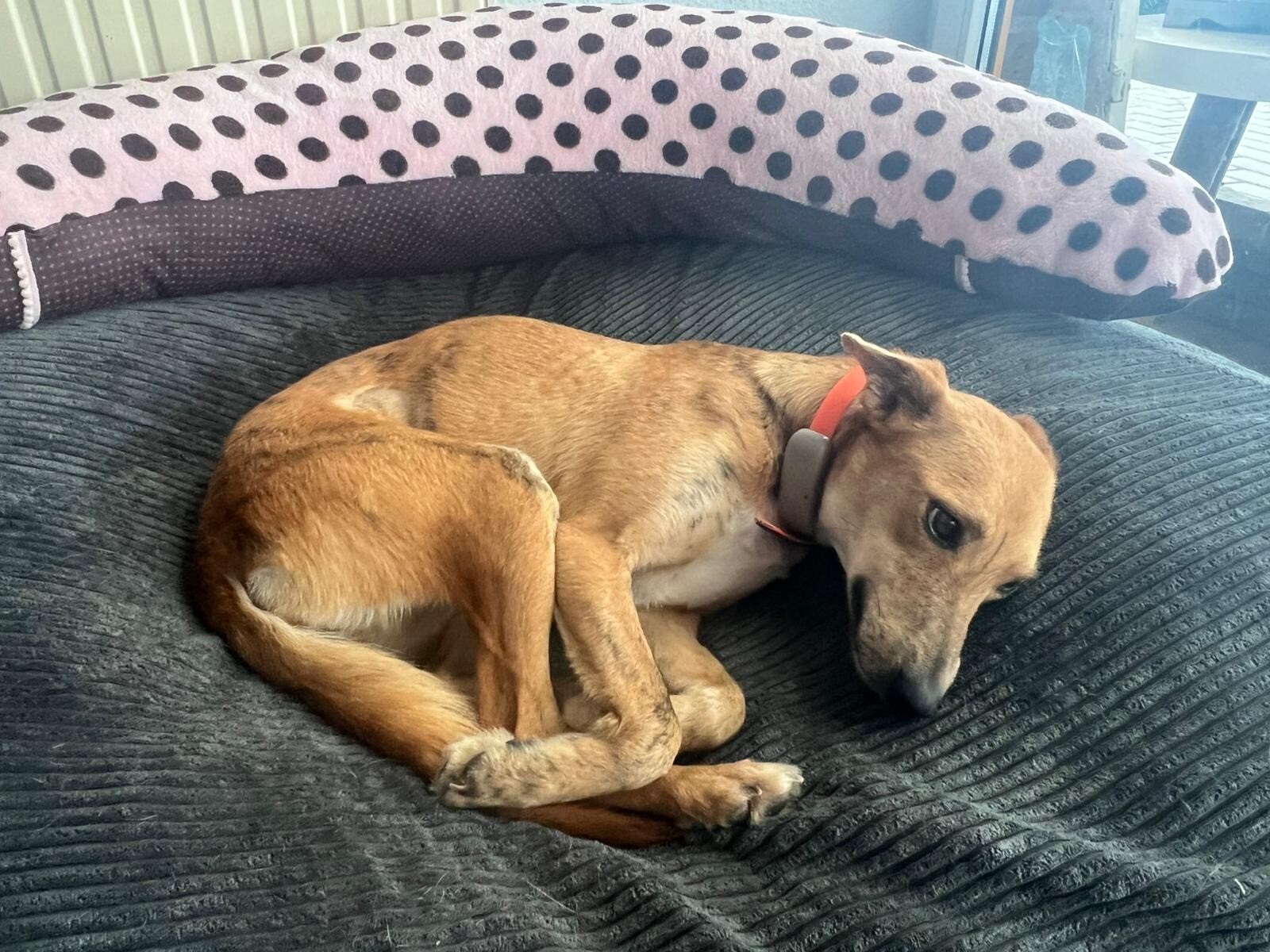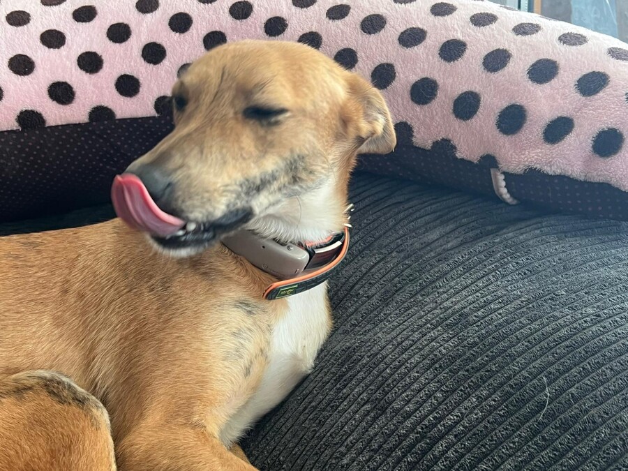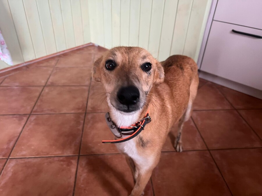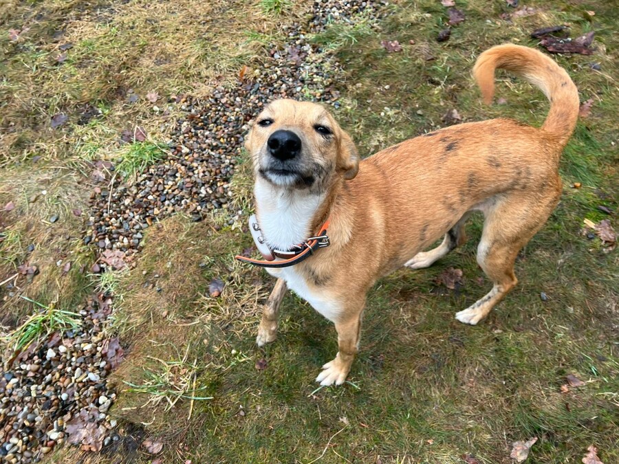Auf ihrer Pflegestelle bleibt sie gemeinsam mit den anderen Hunden problemlos alleine und läuft bereits sehr schön an der Leine.