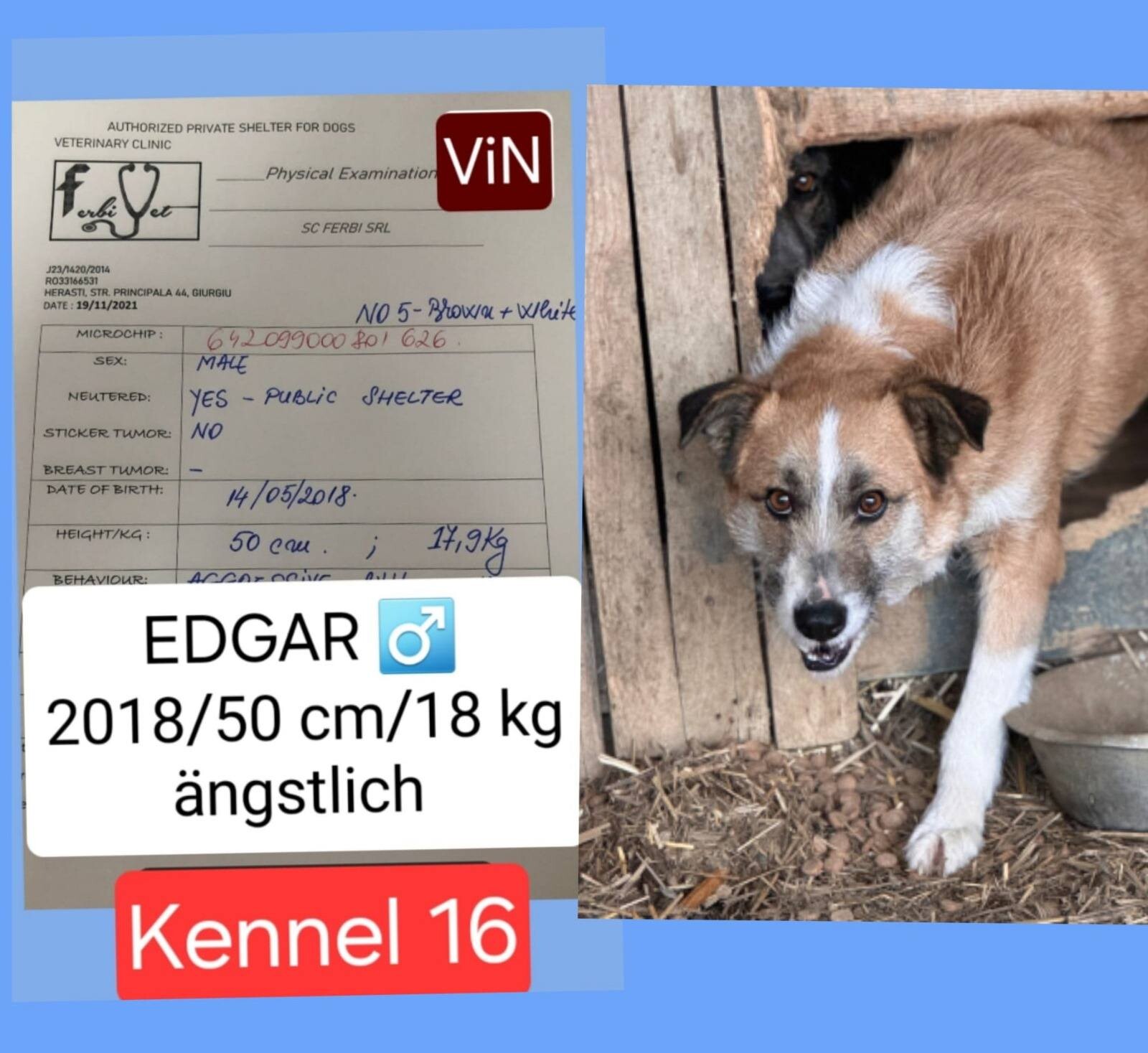 Edgar, geboren 2018 und etwa 50 cm groß, ist ein zurückhaltender und sensibler Rüde, der bisher noch nicht viel Schönes in seinem Leben kennenlernen durfte. Seit mindestens 2021 lebt er im privaten Shelter Campurelu und wartet auf Rettung ein besseres Leben. Eine unvorstellbar lange Zeit. Er wurde dort mal von selbsternannten „Rescuern“ hingebracht und dann in Stich gelassen. Wir nahmen ihn auf.