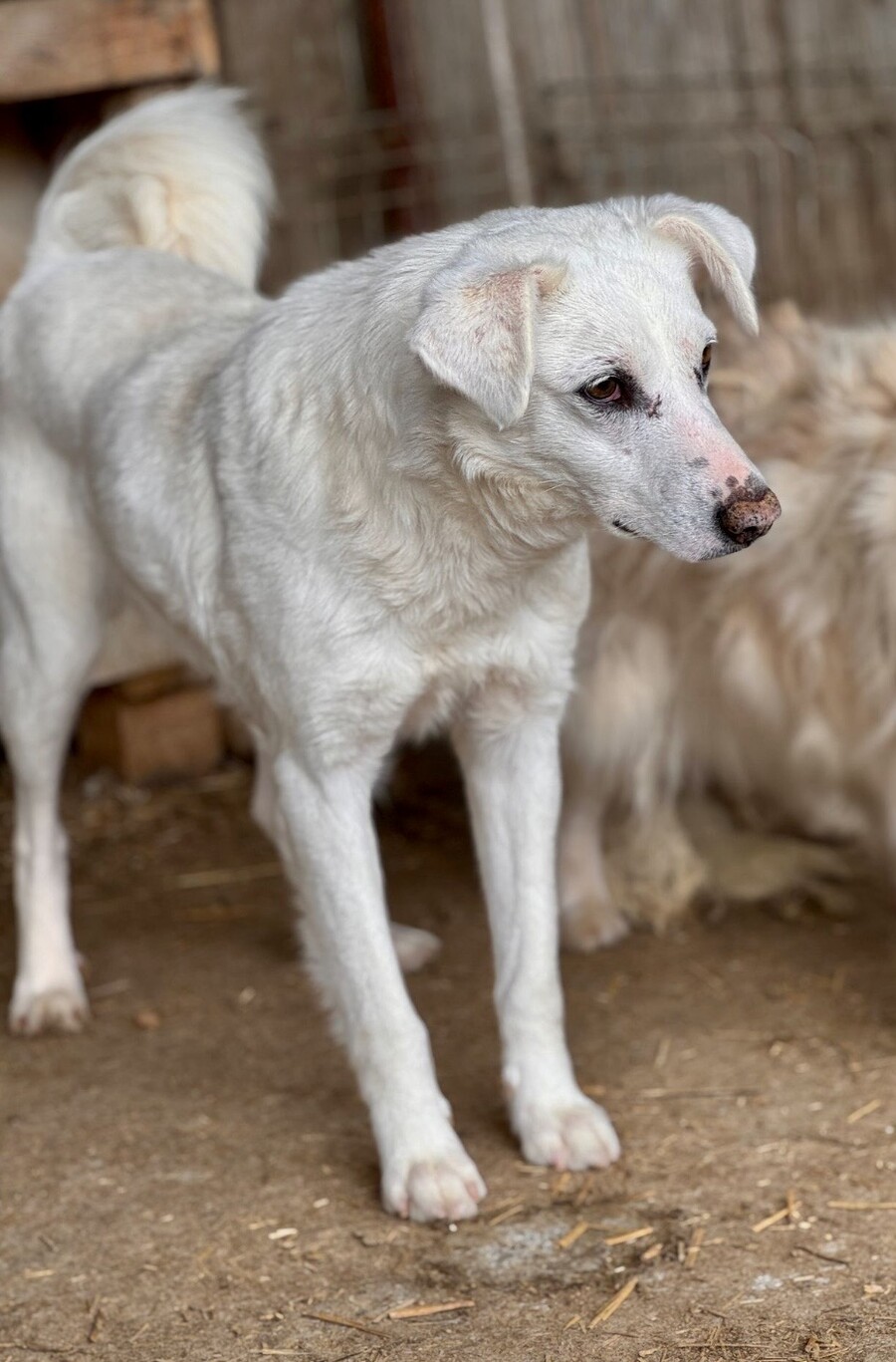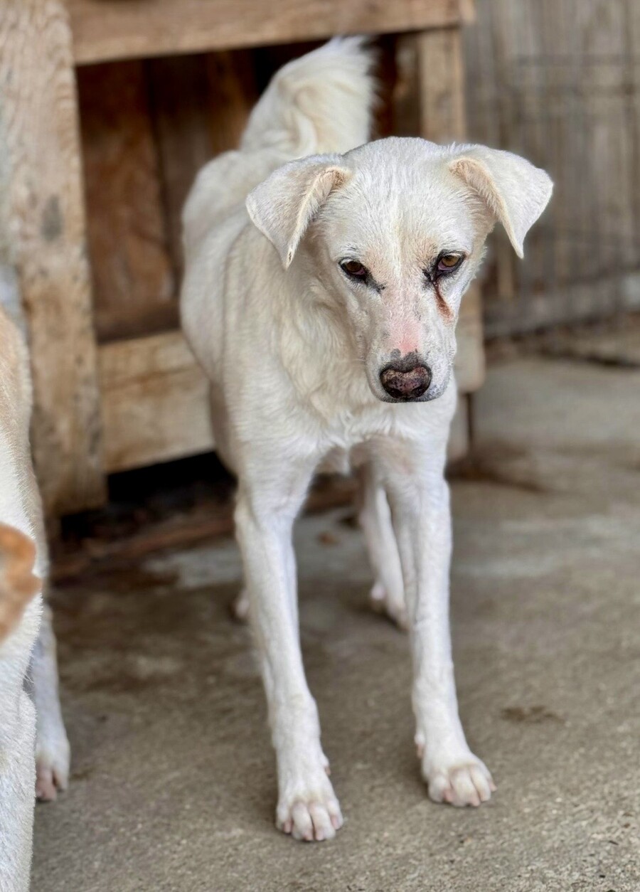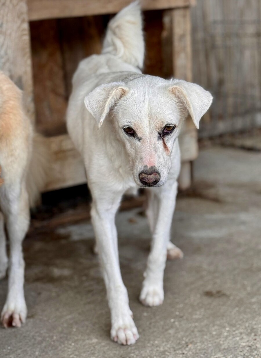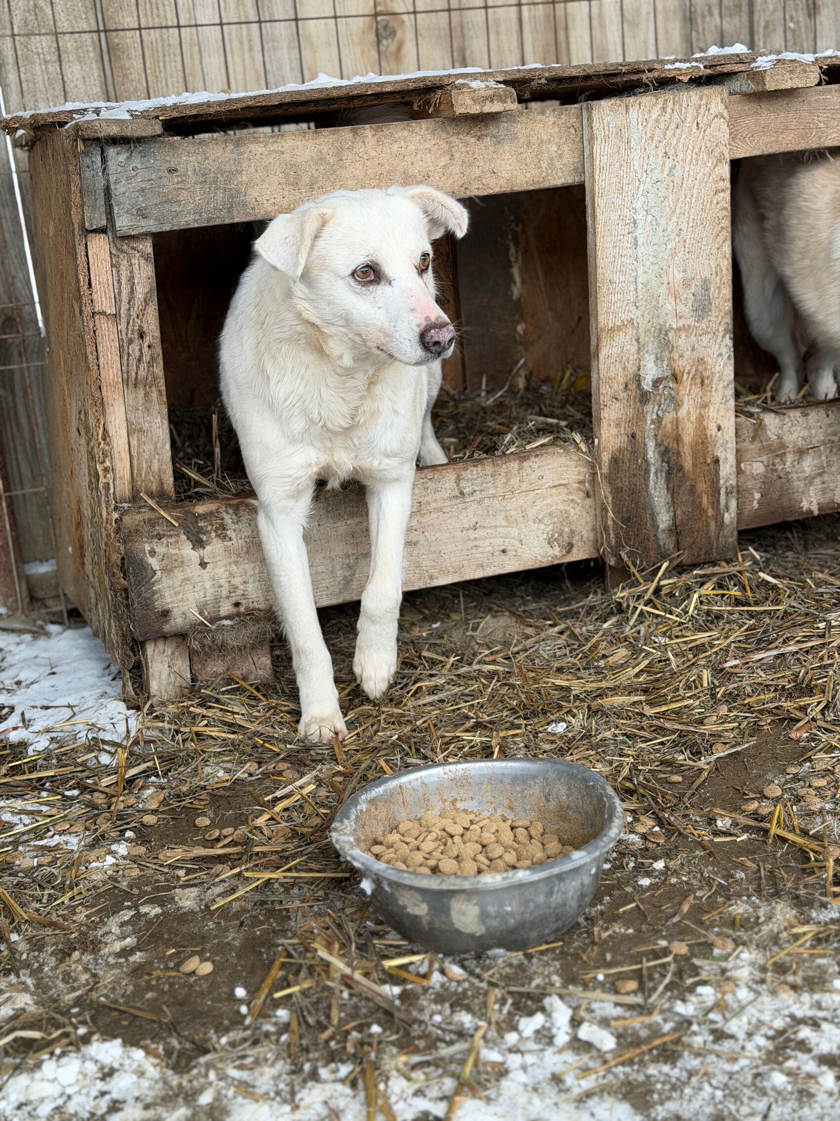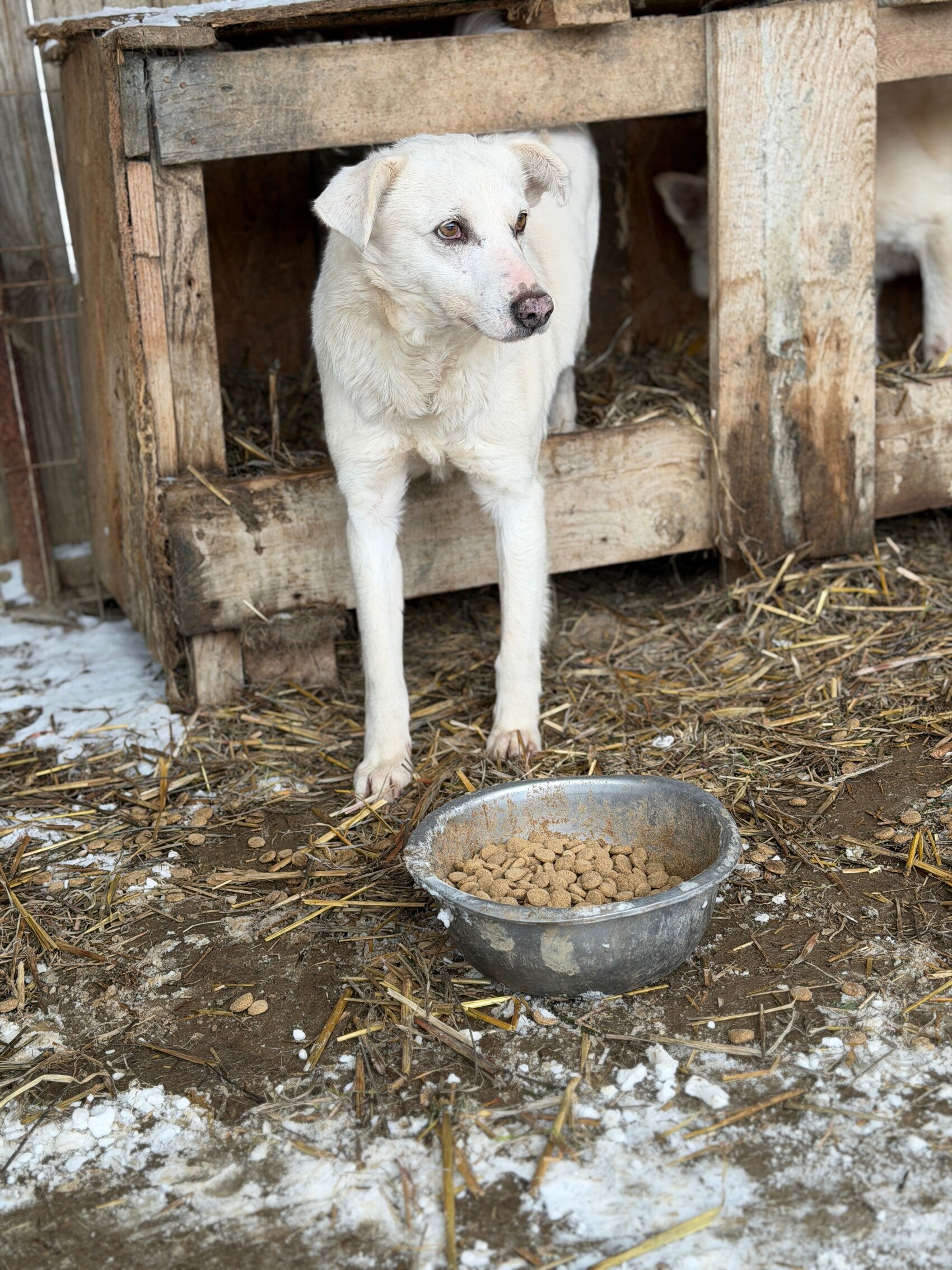 Snow, geboren 2017 und etwa 60–65 cm groß, ist ein verträglicher, unsicherer, aber neugieriger Rüde, der in seinem Wesen viel Sanftheit trägt. Viele Jahre lebte er harmonisch in einer gemischten Vierergruppe – ein Zeichen dafür, wie sozial und friedlich er mit anderen Hunden umgeht. Er ist keiner, der Streit sucht, sondern einer, der Ruhe liebt und sich an klaren Strukturen orientiert.