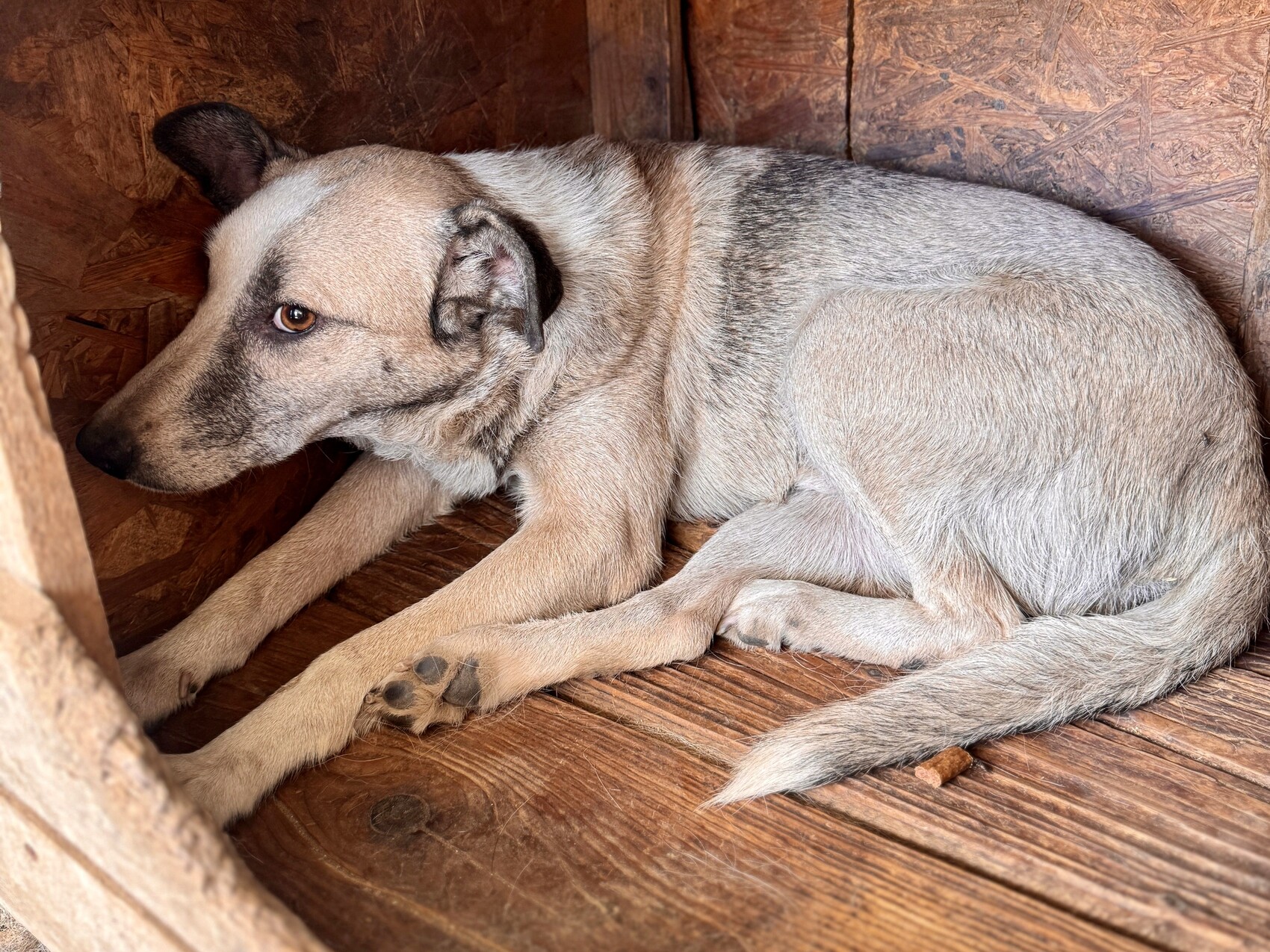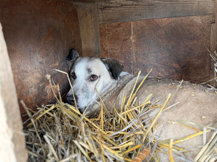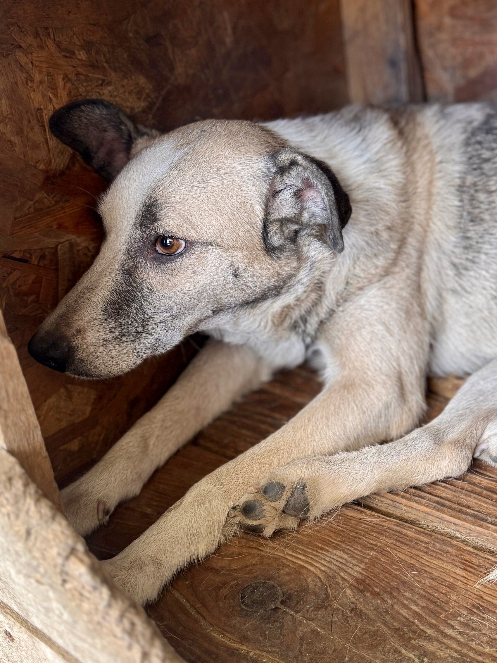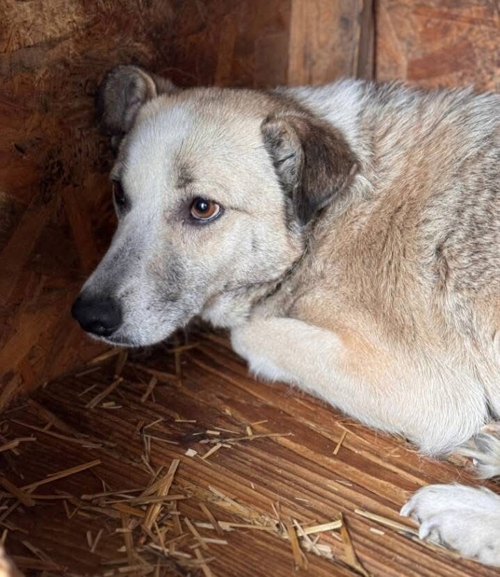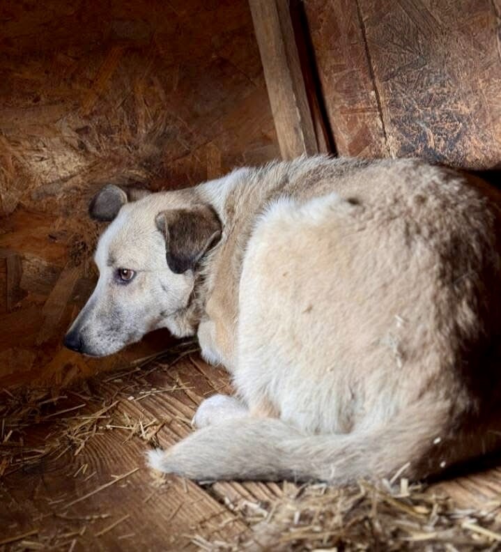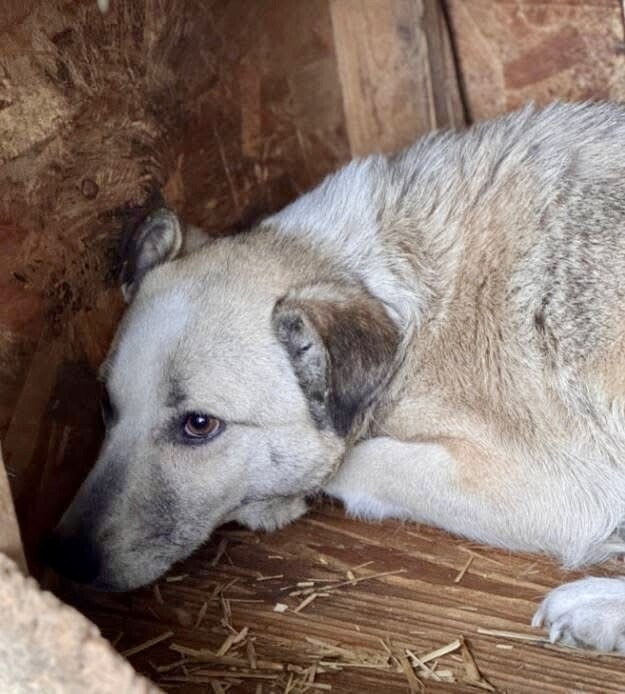 Joey, geboren 2021 und etwa 55 cm groß (geschätzt im Liegen), ist ein ruhiger, sehr zurückhaltender Rüde. Obwohl er noch jung ist, wirkt er oft teilnahmslos – kein Wunder, denn er gehört zu den „Verlassenen“, jenen rund 170 Hunden, die von angeblichen „Tierschützern“ gerettet und in grausamen Bedingungen zurückgelassen und vergessen. Sein deprimierter Gemütszustand lässt erahnen, wie belastend das Leben im Shelter für ihn ist.