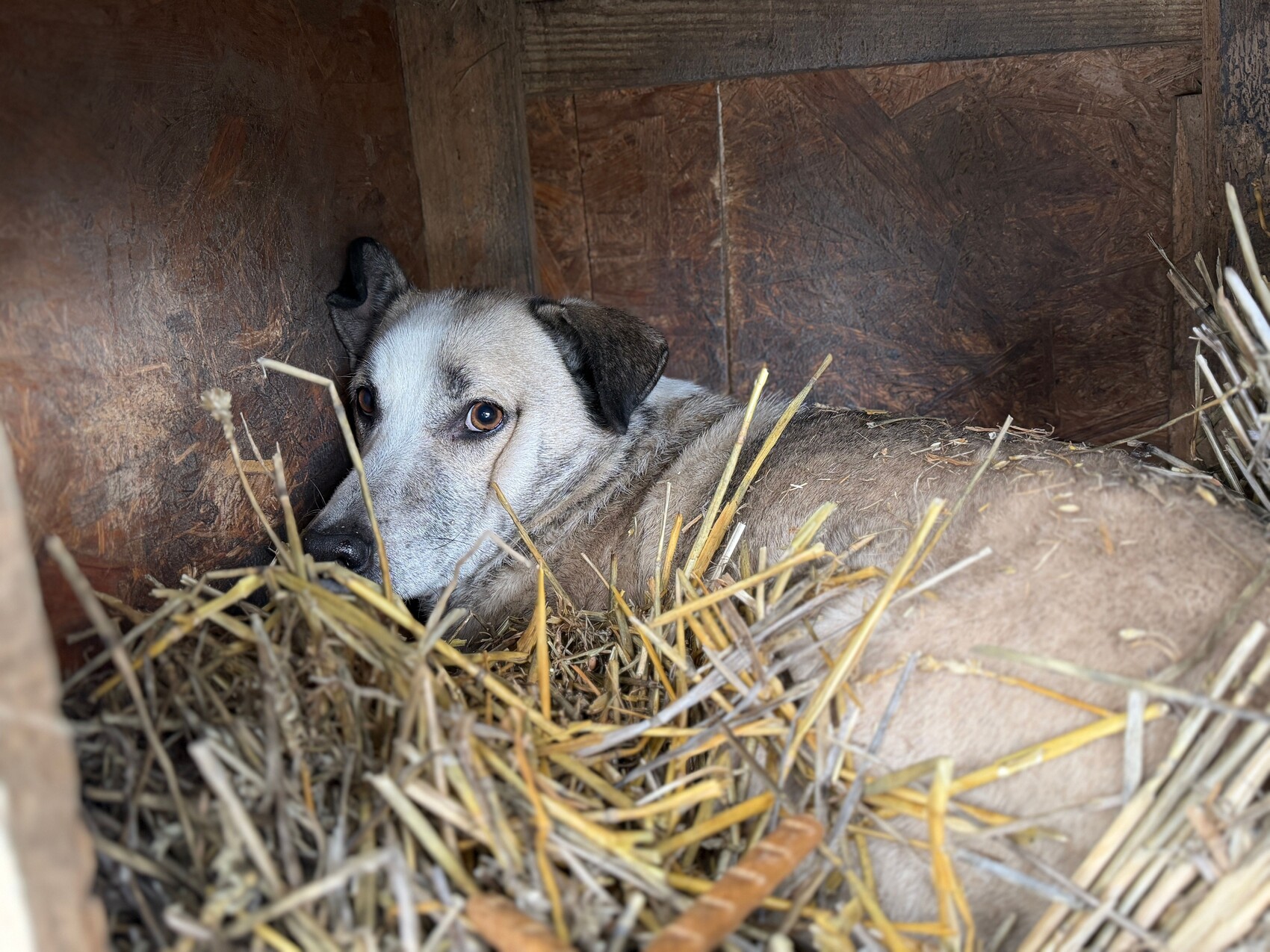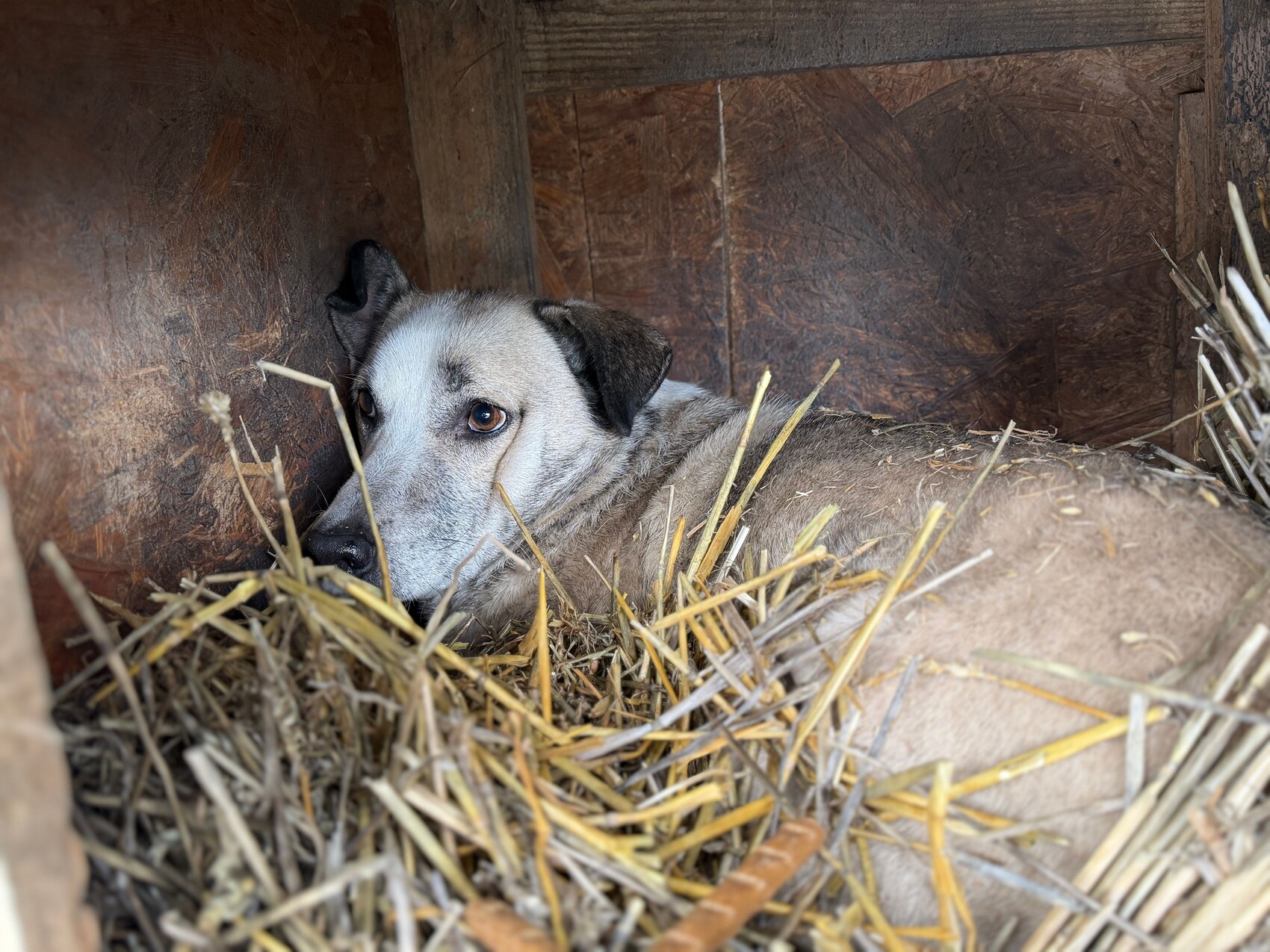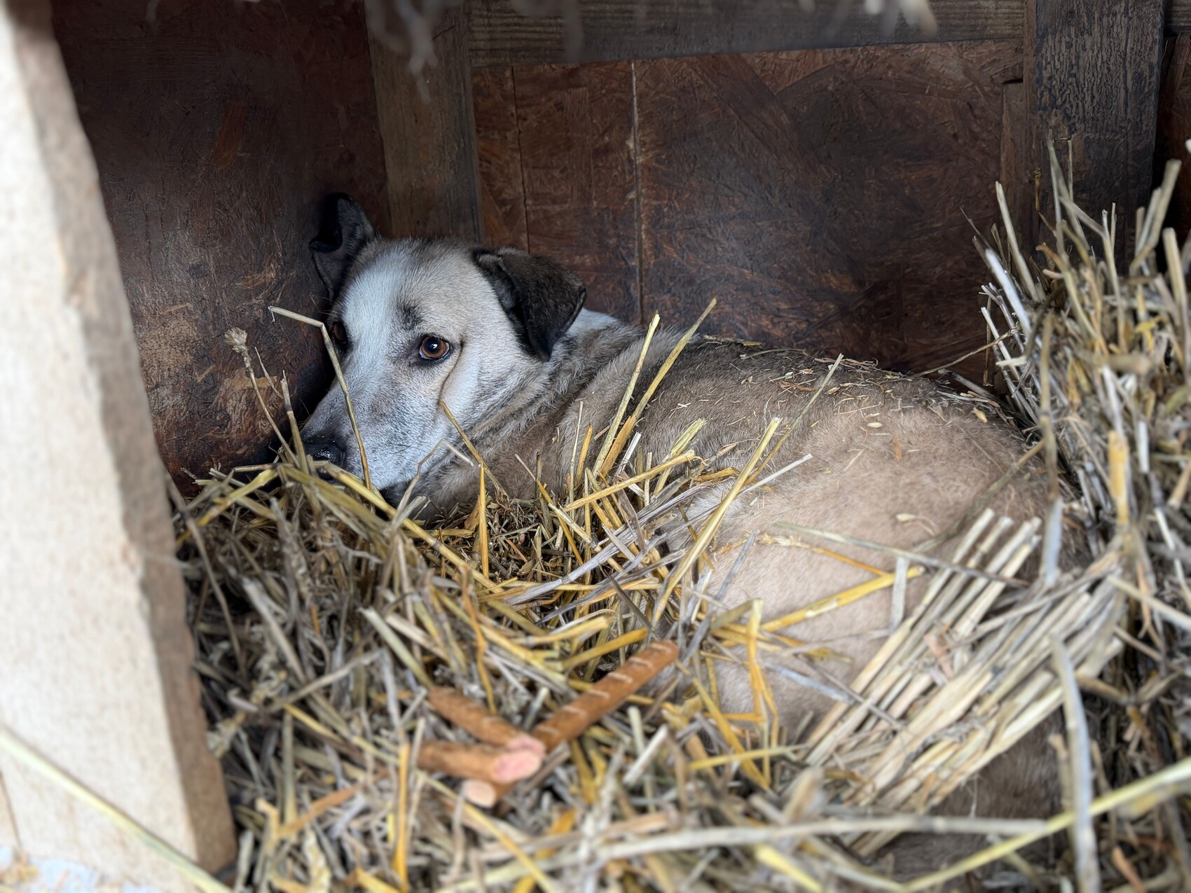 Joey, geboren 2021 und etwa 55 cm groß (geschätzt im Liegen), ist ein ruhiger, sehr zurückhaltender Rüde. Obwohl er noch jung ist, wirkt er oft teilnahmslos – kein Wunder, denn er gehört zu den „Verlassenen“, jenen rund 170 Hunden, die von angeblichen „Tierschützern“ gerettet und in grausamen Bedingungen zurückgelassen und vergessen. Sein deprimierter Gemütszustand lässt erahnen, wie belastend das Leben im Shelter für ihn ist.