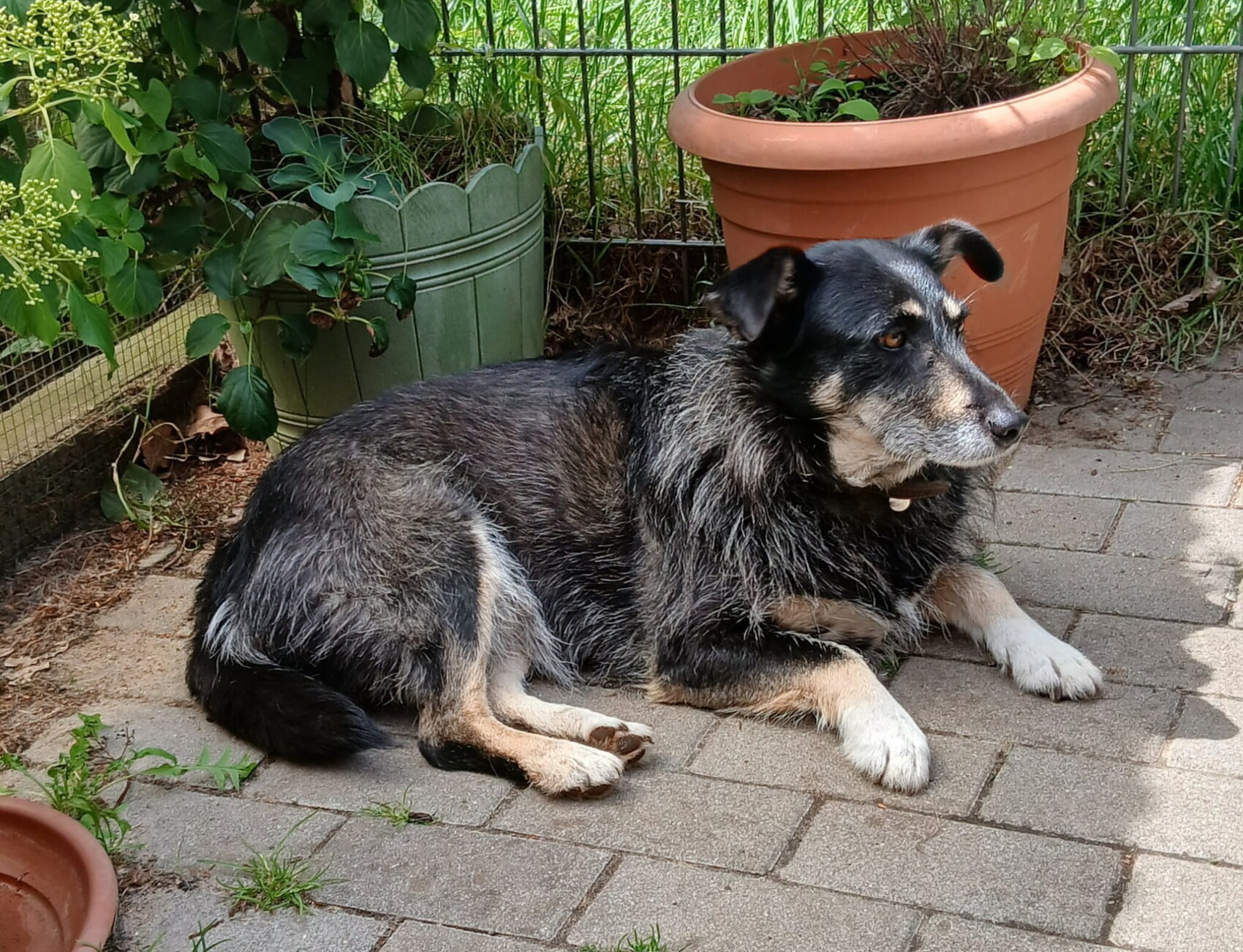 Angie möchte sich von Fremden nicht anfassen lassen, zeigt sich aber ihrem Pflegefrauchen gegenüber recht anhänglich lässt sich von ihr auch inzwischen gerne streicheln. Spaziergänge sind ihr noch zu viel – hier braucht sie viel Zeit und Vertrauen, um sich zu öffnen. Sie ist jedoch stubenrein und genießt die Zeit im Garten.